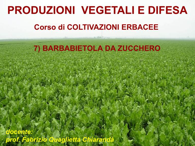 PRODUZIONI VEGETALI E DIFESA Corso di COLTIVAZIONI ERBACEE 7) BARBABIETOLA DA ZUCCHERO docente: prof. Fabrizio Quaglietta Chiarandà ORIGINE • Si ipotizzano due centri di origine: 1. bacino mediterraneo o Medio Oriente 2. Isole Canarie o del Capo Verde • Nell'antichità era solo pianta da orto (come dolcificante veniva usato il miele). Solo nel 1747 in Germania fu scoperta da Margraaf la presenza di zucchero cristallizzabile nella radice e, quindi, la possibilità di estrarlo. • Napoleone I° dette l'impulso determinante per la diffusione della B. come pianta industriale quando, a seguito del blocco continentale operato dall'Inghilterra, venne impedita l'importazione di zucchero che all'epoca proveniva esclusivamente dalle coltivazioni di Canna delle Americhe. • Attualmente circa il 40% dello zucchero proviene dalla B., mentre il restante 60% è ricavato dalla Canna da Z. Oltre lo zucchero la Barbabietola fornisce: a) alimento per il bestiame: • foglie e colletti (la parte epigea della pianta non viene utilizzata nell'industria estrattiva); • polpe esauste e melasso (residui dell'estrazione) b) concime: • calce di defecazione (residuo della purificazione del saccarosio, contenente una certa quantità di N e vari minerali) Per le sue esigenze climatiche è pianta tipica delle zone temperate ed è coltivata prevalentemente nell'emisfero boreale, soprattutto nell'Europa centro-settentrionale. Evoluzione della coltivazione di Barbabietola nel mondo (dati FAO 2002) Negli ultimi 12 anni, le superfici sono diminuite e le rese areiche sono aumentate di circa il 30%. Pertanto la produzione di zucchero ha subito solo una leggera flessione. L'Unione Europea contribuisce per quasi il 50% alla produzione mondiale. La coltivazione di Barbabietola nella UE a 15 (dati FAO 2002) Nella UE le superfici si sono ridotte da 2.1 Mha a circa 1.9 (≈ 10%). Le rese hanno oscillato tra 50 e 62 t ha-1, con valori decisamente più alti delle medie mondiali. I maggiori produttori nella UE sono Francia e Germania. L'Italia è 3a con il 13% della superficie totale ed il 10% della produzione di radici La coltivazione di Barbabietola in Italia (dati ISTAT) Italia 400 Nord Centro Sud 200 64% 100 21% 15% 2000 1995 1990 1985 1980 1975 1970 1965 0 2005 ha*1000 300 ANNO Al Nord sono localizzati circa i 2/3 dell'intera superficie bieticola (soprattutto in Emilia-Romagna e basso Veneto). I dati del 2005 non sono ancora disponibili, ma all'inizio della campagna era previsto un lieve incremento delle superfici al Sud (circa il 10% in più). Produzione di radici in Italia (dati ISTAT) 20 Sud Centro Nord Italia t*10 6 16 12 8 73% 4 2000 1995 1990 1985 1980 1975 1970 1965 0 2005 14% 13% ANNO Al Nord, grazie ad una maggior resa areica, sono localizzati circa i 3/4 della produzione nazionale. Anche gli stabilimenti di estrazione sono in larga prevalenza localizzati nel Nord-Italia (14 su 19, di cui 8 solo in Emilia-Romagna). La UE, tra l'altro, favorisce la dismissione degli stabilimenti pagando una tantum 500€ q-1 di zucchero prodotto. PROSPETTIVE FUTURE DELLA BIETICOLTURA IPOTESI DI COMPOSIZIONE DEL PREZZO BIETOLA CON IL NUOVO OCM ZUCCHERO 2006/07 2007/08 2008/09 2009/10 € t-1 € t-1 € t-1 € t-1 Prezzo minimo nuovo OCM 32.90 29.80 26.70 26.30 Aiuto accoppiato 30% differenza tra prezzo attuale e prezzo OCM 3.32 4.25 5.18 5.30 Ulteriore aiuto accoppiato (art. 69 Reg. 1782/03) 1.40 1.80 2.20 2.26 Contributo alla produzione 0.00 -0.78 -0.78 -0.78 37.62 35.07 33.30 33.08 Prezzo netto a 16° Prezzi al netto di aiuti di adattamento e aiuti disaccoppiati. (Il prezzo attuale è sui 40-42 € t--1) Tenendo conto della progressiva riduzione degli aiuti, con costi di produzione dell'ordine dei 1600 € ha-1, nel 2010 occorreranno rese di almeno 65-70 t ha-1 per rendere economica la coltivazione. Se poi l'integrazione dovesse scomparire, con un prezzo di 26 € t-1, una resa economicamente valida dovrebbe superare le 80 t ha-1. Nel Meridione, non potendo fare a meno di un sussidio irriguo sostenuto, è improbabile che i costi scendano al di sotto dei 1900 € ha-1. Quindi, senza l'integrazione la sopravvivenza della bieticoltura diventa veramente difficile. Classificazione Classe: DICOTYLEDONAE Ordine: CENTROSPERMAE Famiglia: CHENOPODIACEAE Genere: Beta (13 specie in 4 sezioni; n=9) Sez. VULGARES Sez. COROLLINAE Sez. NANAE Sez. PATELLARES B. vulgaris B. macrorhiza B. nana B. patellaris B. maritima B. trigina B. procumbens B. macrocarpa B. foliosa B. webbiana B. patula B. lomatogona B. atriplicifolia Solo la B. vulgaris è coltivata, le altre sono utilizzate dai genetisti come fonti di resistenza. • La specie è naturalmente biennale: • 1° anno fase vegetativa (sviluppo della radice) • 2° anno fase riproduttiva (produzione del seme) Della specie Beta vulgaris vengono coltivate 4 varietà botaniche: • B. vulgaris var. saccharifera = B. da zucchero • " " crassa (= rapa) = B. da foraggio • " " cruenta (= esculenta) = B. da insalata • " " cycla = B. da coste Quella di seguito descritta è la Barbabietola da zucchero. MORFOLOGIA 1. Apparato radicale • fittonante, di forma conica, colore grigio-giallastro, polpa bianca, si divide in: a)zona epicotile (= testa o colletto): è la parte superiore (in genere dello spessore di 1-2 cm) su cui si inseriscono le foglie e, al 2° anno, lo scapo fiorale. Costituisce l'8-13% in peso dell'intera radice e non viene utilizzata per l'estrazione dello zucchero (contiene i "non zuccheri" sostanze solubili che rendono più difficile l'estrazione). Può essere utilizzato come foraggio insieme alla parte aerea. a) zona ipocotile (= collo): parte intermedia, poco definita, che unisce il colletto al corpo radicale. Privo di foglie e di radici secondarie. Viene utilizzato insieme al corpo nell'estrazione dello zucchero. b) corpo radicale: comprende la parte restante del fittone ed il capillizio che si parte dai solchi saccariferi (due scanalature laterali che segnano longitudinalment