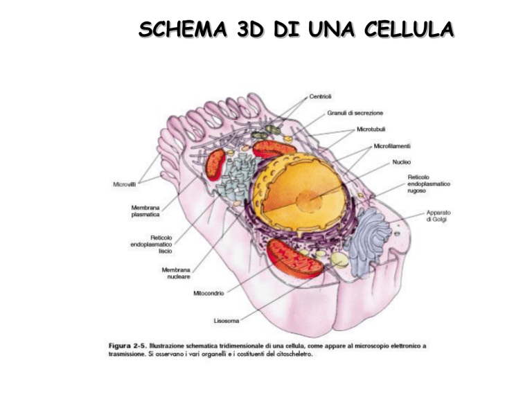 SCHEMA 3D DI UNA CELLULA BIOCHIMICA DELLE CELLULE -L’acqua rappresenta il 70% del peso della cellula • C,H,N,O,P,S rappresentano il 99% della massa della cellula – Altri elementi includono calcio (Ca2+), magnesio (Mg2+), zolfo (S), potassio (K) Carbonio • Ha un piccolo peso • Ha 4 elettroni esterni per formare legami – Puo’ formare 4 legami covalenti forti • Puo’ creare molecole grandi, complesse • H,N &O sono anch’essi piccoli e capaci di formare legami covalenti forti Gruppi chimici comuni • Metile Questi gruppi -CH3 • Idrossile -OH • Carbossile -COOH • Amino -NH2 sono molto frequenti nelle molecole biologiche * • Una molecola organica è quella che contiene carbonio – Molecole organiche piccole hanno un PM di circa 1001000 dalton • Che sono circa 30 atomi di C – Polimeri sono macromolecole • No limiti nella misura • In genere sono unità ripetute di singole molecole • Le cellule contengono 4 grandi famiglie di piccole molecole organiche: _ Zuccheri – Acidi grassi – Amminoacidi – Nucleotidi Dalle piccole molecole alle macromolecole • Macromolecole hanno un peso molecolare di 10,000 - 1 millioni Dalton • Solitamente subunità ripetute di zuccheri, amminoacidi, nucleotidi acidi grassi. • Formazione di macromolecole coinvolge la formazione di legami covalenti forti abbastanza da preservare la sequenza delle subunità per lunghi periodi di tempo Macromolecole • Intermedi nel peso e nella complessità tra piccole molecole e gli organelli cellulari • Polimeri di subunità, che possono essere combinati • Nucleoproteine= nucleotidi + proteine – Proteoglicani = carboidrati + catene proteiche laterali – Glicoproteine = proteine + carboidrati s.c. – Glicolipidi = lipidi + carboidrati Tipi di Macromolecole -Zuccheri –Acidi grassi –Amminoacidi –Nucleotidi Carboidrati Lipidi Proteine Acidi nucleici ZUCCHERI • Unità base è un monosaccaride formula generale è (CH2O)n dove n tra 3-8 – Glucosio è C6H12O6 – Puo’ essere un anello o una catena aperta – Gli zuccheri contengono un numero di gruppi idrossilici e: – • un aldeide • O un chetone H C=O C=O • Le aldeidi e i chetoni possono: – Reagire con con un gruppo OH nella stessa molecola e convertirla in un anello – Una volta formato l’anello il carbonio puo’ legarsi ulteriormente ad un gruppo carbossilico su un’altra molecola a H O formare: C CH OH . Disaccaridi O H C OH HH OH HO C H • Oligosaccaridi H C OH HOOH H H H OH H C OH • Polisaccaridi 2 CH2OH glucosio Funzione degli zuccheri nelle cellule • Principale risorsa di energia • Polisaccaridi semplici come il glicogeno (amido nelle c. vegetali) • Costituenti della matrice extracellulare (ECM). • Possono legarsi a proteine o lipidi per formare glicoproteine o glicolipidi CARBOIDRATI • Grandi molecole insolubili • 1-2% della massa cellulare • Scissi in glucosio, poi in diossido di Carbonio, acqua eATP – Nei mitocondri • Amido – Tessuti vegetali • Glicogeno – Tessuti animali Oltre all’energia….. • Zuccheri e l’acqua formano strutture “scivolose” – Muco • funzione di protezione negli ambienti difficili (intestino) – Glicocalice e muco • Agiscono come recettori sulle membrane – Adesione tra cellule, virus, ormoni, batteri infettivi ACIDI GRASSI • Hanno due regioni distinte – Una lunga catena idrocarburica • Insolubile all’acqua o idrofobica – Gli acidi grassi differiscono per la lunghezza della catena idrocarburica e dal numero ela posizione dei C=C • Solubile nell’acqua o idrofilici • Il gruppo carbossilico reagisce con un un gruppo OH o NH2 su una seconda molecola per formare esteri o amidi O C O- micell a Funzione degli acidi grassi nelle cellule • Una risorsa notevole di cibo – Producono 2x volte piu’ energia utile rispetto al glucosio – Immagazzinati nel citoplasma gocce di trigliceridi • 3 catene di acidi grassi uniti ad una molecola di glicerolo • Composizione delle membrane cellulari • Fosfolipidi sono i componenti principali • 2 catene unite ad un glicerolo • Il glicerolo si lega anche ad un gruppo fosfato carico negativamente • Fosfato legato a piccole composti come etanolamina, colina o serina Gruppo idrofilico fosfato glicerolo Code idrofobiche di acidi grassi LIPIDI • Grassi neutri – Maggiore risorsa di energia di riserva • Fosfolipidi – Membrane cellulare • Steroidi, basati sul colesterolo – Molti ormoni • Altre sostanze lipoidi – Vitamine solubili nei grassi – Prostaglandine Fosfolipidi Gruppo idrofilico fosfato glicerolo Code di acidi grassi idrofobiche AMMINO ACIDI • Tutti contengono gruppi carbossilici e amminici legati ad un singolo atomo di carbonio • Subunità delle proteine – Lunghi polimeri di amminoacidi uniti testacoda da un legame peptidico tra un gruppo carbossilico di uno a quello amminico di un altro • Ci sono 20 amminoacidi comuni nelle proteine, ognuno con una differente catena laterale • Amminoacidi comuni sono raggruppati in base alle cariche presenti nelle loro catene laterali – 2 sono acidi – 3 sono basici – 5 sono non carichi 10 sono nonpolari • La formula generale degli amminoacidi è: atomo di carbonio a H Gruppo amminico H2N-C-COOH R Gruppo carbossilico Gruppo laterale NUCLEOTIDI • L’azoto contiene composti ad anello legati ad uno zucchero a 5 atomi di carbonio che presenta un gruppo fosfato – L’Anello si chiama base poiché puo’ unirsi con H+ ia formare sali acidi – Lo zucchero a 5 carboni è il ribosio o il deossiribosio BASI • • • • Pirimidine Citosina, timina, uracile Purine guanina, adenina N N pirimidina N N N purina N Funzione dei nucleotidi • ATP (adenosin trifosfato) puo’ rilasciare energia per formare ADP • AMP Ciclico è una molecola segnale universale all’interno dell cellula • Puo’ combinarsi con altri gruppi chimici per formare coenzimi (Coenzima A) • Risorsa di informazioni biologiche – acidi nuclei