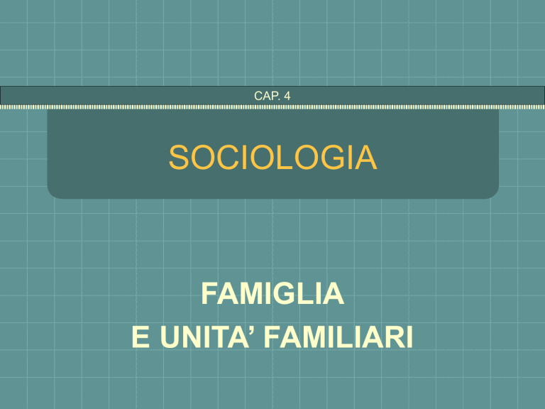 CAP. 4 SOCIOLOGIA FAMIGLIA E UNITA’ FAMILIARI CAP. 4 - FAMIGLIA E UNITA’ FAMILIARI 2 approccio marxista approccio femminista tendenze contemporanee LA FAMIGLIA approccio critico approccio interpretativ. futuro delle unità familiari CAP. 4 - FAMIGLIA E UNITA’ FAMILIARI - Che cos’è la famiglia? 3 è un’istituzione sociale La famiglia è un gruppo sociale caratterizzato da residenza comune, cooperazione e riproduzione. Include adulti di ambo i sessi, almeno due dei quali hanno una relazione sessuale socialmente approvata, e uno o più figli degli adulti sessualmente coabitanti, propri o adottati non più adottabile neanche in occidente utilizzata per molti anni La famiglia è un gruppo di persone legate da consanguineità matrimonio, convivenza o adozione, che occupano la stessa unità abitativa e che condividono la principale responsabilità della riproduzione e dell’assistenza dei suoi membri FAMIGLIA: FENOMENO VARIO E COMPLESSO CAP. 4 - FAMIGLIA E UNITA’ FAMILIARI - Che cos’è la famiglia? 4 grande varietà di opinioni sociologiche positive negative è rifugio in un mondo senza cuore un bagno caldo a fine giornata benefica per genitori e figli + basilare e vitale istituzione soc. dà senso di appartenenza/identità TRADIZIONALE è fonte di tensioni e di conflitti sfrutta le donne e reprime i figli rivolta al proprio interno si occupa solo dei propri membri istituzione violenta con donne/bimbi LIBERALE classica della “Soc. d. famiglia” evidenzia varietà dei modelli È specie su famiglia nucleare “la diversità auspicabile” PARSONS/NUOVA DESTRA/MARX ANTIFAMILISTICA “c’è una ideologia familiare tutti i modi devono essere accettati” parlano di “unità familiare” RIMANE SEMPRE UTILE COMPARARE DIVERSI MODELLI DI FAMIGLIA ENTRO STESSA SOCIETA E FRA DIVERSE SOCIETA’ CAP. 4 - FAMIGLIA E UNITA’ FAMILIARI - Che cos’è la famiglia? 5 tendenze e cambiamenti mondiali W.J.GOODE (anni cinquanmta) T. PARSONS (1959) tendenza verso fam. nucleare dovuto a industrializzazione e mondializzazione (fam. estese e poligamie + funzionale a soc. agricola) evoluzione verso fam. nucleare meglio risponde a soc. industriale avanzata SOCIETA’ PRE- INDUSTRIALE economia agricola famiglia estesa produz. con ampio uso M.O. famiglia = unità di produzione SOCIETA’ INDUSTRIALE industrializzazione e urbanizzazione sviluppo tecnologico economia manifatturiera famiglia nucleare produz. ad alta meccaniz. fam. = unità di consumo CAP. 4 - FAMIGLIA E UNITA’ FAMILIARI - Che cos’è la famiglia? 6 tendenze e cambiamenti mondiali GIDDENS infatti i fenomeni sono >>> ovunque cambiamenti struttura famiglia sono effetti di industrializ. e vita urbana > rottura clan e gruppi parentela stretta (es.: Cina) > spostamento verso individualismo e amore romant. > maggiore libertà femminile (x scelta marito e lavoro) > declino importanza reti parentela > maggiore libertà sessuale > sviluppo diritti dei bambini anche se oggi nel mondo la norma sono famiglie estese GLOBALIZZAZIONE MODELLI FAMILIARI OCCIDENTALI DOVE C’E’ ANCORA POVERTA’ FAMIGLIA ESTESA IMPORTANTE x SOPRAVVIVERE FAMIGLIA ESTESA HAREVEN P.LASLETT McFARLANE M.ANDERSON Altri FAMIGLIA NUCLEARE ricostruzione storica sociologi non accurata fam.estesa può essere funzionale a soc. industr. fam. estesa modello non dominante nel passato in europa occ. fam.nucleare era + diffusa primogenitura: fam. estesa era meno importante famiglia estesa in Lancashire anche fra operai fam. estesa importante in minoranze etniche CAP. 4 - FAMIGLIA E UNITA’ FAMILIARI - Che cos’è la famiglia? 7 approccio funzionalista approccio funzionalista associato spesso a T. Parsons (U.S.A. 1902-1979, Harvard) FAMIGLIA unità sociale di base e istituzione centrale della società (danno la visione più positiva della famiglia entro la società) FAMIGLIA CI INFLUENZA > mettendoci in una struttura economica e di classe > dirigendo affiliazione religiosa e appartenenza politica > influendo su nostra permanenza nel sistema scolastico, etc. FAMIGLIA FAMIGLIA sopravvivenza conservazione sostentamento mantenimento sopravvivenza conservazione sostentamento mantenimento INDUSTRIALIZ. + STATO conservazione sostentamento mantenimento sostiene che fam.nucleare risponde meglio a esigenze società industriale suppone che il lavoro meglio per uomini e donne dedite a sfera affettiva con progresso la famiglia nucleare è privata di molte delle sue funzioni CAP. 4 - FAMIGLIA E UNITA’ FAMILIARI - Che cos’è la famiglia? 8 approccio funzionalista (Parsons) TRADIZIONALI FUNZIONI DELLA FAMIGLIA erano: riproduzione e crescita dei bambini stabili relazioni sessuali entro un rapporto monogamico mantenimento economico dei propri membri assistenza tutela e cura di tutti i membri socializzazione ed educazione dei giovani senso di identità e appartenenza entro comunità stabili, E IN PIU’ socializzazione primaria dei bambini (valori e norme, il bene/il male) stabilizzazione della personalità degli adulti isolamento rispetto a gruppi parentali più allargati redditi crescenti e condizioni di vita standardizzati sostegno della famiglia nucleare da parte del welfare state distanza dai parenti a causa della mobilità territoriale delle soc. ind.li cura dei bambini non più dalle famiglie ma dall’esterno famiglia moderna centrata sulla casa con scarsi contatti con la comunità la famiglia è focus dominante di affetti ed emozioni per divertirsi e intrattenersi: TV, CD, PC, ecc. sono in casa miglioramento della casa e il “fatevelo da voi” CAP. 4 - FAMIGLIA E UNITA’ FAMILIARI - Che cos’è la famiglia? approccio funzionalista R. FLETCHER (funzionalista inglese) non è vero che funzioni sono diminuite queste le moderne funzioni: regolare il comportamento sessuale fornire base responsabile per procreazione e crescita dei figli curare i membri a suo carico, giovani e anziani agire come prima e più importante agenzia di socializzazione insegnare ai membri futuri ruoli e accettazione 