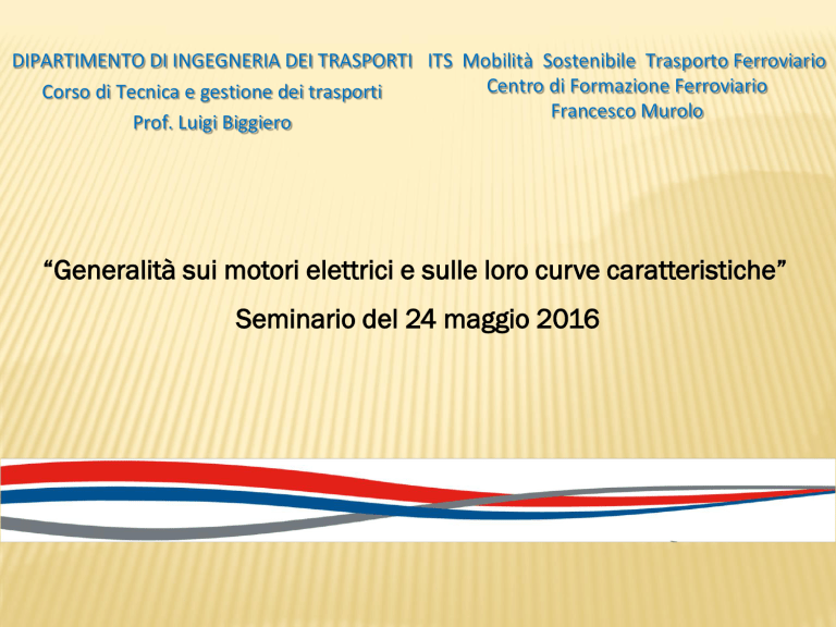 DIPARTIMENTO DI INGEGNERIA DEI TRASPORTI ITS Mobilità Sostenibile Trasporto Ferroviario Centro di Formazione Ferroviario Corso di Tecnica e gestione dei trasporti Francesco Murolo Prof. Luigi Biggiero “Generalità sui motori elettrici e sulle loro curve caratteristiche” Seminario del 24 maggio 2016 Trazione: il propulsore Il propulsore più utilizzato nel trasporto terrestre è la ruota motrice. L’azione di una coppia motrice M, applicata ad un asse di un veicolo, sulla cui estremità sia calettata una ruota, corrisponde a quella esercitate da una forza F, applicata tangenzialmente alla ruota nel punto di contatto con la strada. Le forze attive tangenziali F e il carico verticale Pa si trasmettono fra ruota e strada attraverso l'area d'impronta (pochi cm2). M F r Si dice che si verificano le condizioni di O ’ R peso Pa ed alla forza tangenziale F se essa rotola senza strisciare o slittare. A f a Pa r aderenza per una ruota soggetta al F RF A M Pa -F A O 2 Trasporto terrestre: il fenomeno dell’aderenza Aumentando il valore di F il rotolamento continua finché si raggiunge il limite di aderenza A oltre il quale l’aderenza cessa e la ruota comincia a slittare. Si definisce coefficiente di aderenza il rapporto: fa=A/Pa Perché si abbia aderenza deve quindi essere soddisfatta la condizione: F ≤ A=fa·Pa Il limite di aderenza A=fa·Pa rappresenta, quindi, il massimo valore della forza di trazione F che può essere trasmesso da una ruota alla pavimentazione affinché il moto si svolga in condizioni di puro rotolamento. La condizione di aderenza deve essere verificata anche in frenatura ovvero la ruota rotola senza pattinare. 3 Trazione: l’equazione generale del moto I motivi per i quali la relazione F≤fa·Pa potrebbe non essere soddisfatta sono molteplici, coinvolgono le tre grandezze in gioco (F, fa e Pa) e non sono sempre di facile individuazione quantitativa. Un parametro che nella letteratura sembra che abbia una certa influenza sul coefficiente di aderenza fa è la velocità del mezzo di trazione, nel senso che questo viene considerato decrescente con l'aumentare della velocità. Esistono anche espressioni analitiche, di tipo empirico che esprimono tale variabilità. In realtà, il coefficiente di aderenza dovrebbe ritenersi invariabile o quasi con la velocità, mentre ciò che varia con la velocità è il peso aderente di un asse, che non corrisponde sempre al peso reale gravante sull'asse, quando esso e fermo. 4 Caso ferroviario – Coefficiente di aderenza Valori massimi del coefficiente di aderenza nel campo ferroviario • Coppia motrice uniforme, binario asciutto, getto di sabbia 1/2,5 = 0,40. • Coppia motrice uniforme, binario asciutto o bagnato e pulito 1/3 = 0,33. • Coppia motrice quasi costante e binario come sopra 1/4 = 0,25. • Coppia motrice di macchine a vapore e binario come sopra 1/4,5 = 0,22. • Binario bagnato e trazione a vapore 1/7 = 0,14. • Binario con brina e trazione a vapore 1/8 =0,12. • Binario umido sporco e trazione a vapore 1/9 = 0,11. • Binario ingrassato e trazione a vapore 1/10 = 0,10. • Binario ingombro di foglie secche e trazione a vapore 1/125= 0,08. I valori da 5 a 9 aumentano del 15-20% per trazione elettrica. 5 Caso ferroviario – Coefficiente di aderenza Valori medi del coefficiente di aderenza nell’esercizio ferroviario • Trazione elettrica con assi accoppiati: 0,25. • Trazione elettrica con assi liberi; trazione Diesel con assi accoppiati: 0,20. • Trazione Diesel con assi liberi; trazione a vapore con assi accoppiati: 0,167. I valori suddetti valgono per rotaie asciutte, lavate o sabbiate, per rotaie umide per nebbia o pioggia fine si ha una diminuzione del 30%, per rotaie sporche di grasso o fanghiglia del 50%. 6 Trazione: l’equazione generale del moto L’equazione generale del moto di un veicolo isolato si scrive: F-R=Ms∙a=M∙dv/dt Dove Ms rappresenta la massa statica P/g. Per tenere anche conto delle masse rotanti, si maggiora il valore della massa M introducendo il concetto di massa equivalente: Me= (1+β)M>M. Il coefficiente β (0,1÷0,2) tiene conto di tutte le masse rotanti: ruote, pistoni, alberi, del cambio e volano oppure rotori. Quindi: F-R=Me∙dv/dt • • • • F = somma di tutte le forze attive (motrici o frenanti) applicate al veicolo. R = somma di tutte le resistenze applicate al veicolo. Me = massa equivalente del veicolo. dv/dt = accelerazione (con v velocità nella direzione del moto). 7 Trazione: il fenomeno dell’aderenza Nello studio del moto dei veicoli devono sostanzialmente essere considerate le seguenti forze: • le forze attive F aventi la stessa direzione del vettore velocità v con cui il mezzo si sposta, mentre il verso é lo stesso o l’opposto a seconda che si tratti di forze di trazione o di frenatura; • le forze passive o resistenze R aventi la stessa direzione della velocità e verso opposto; • le forze d’ inerzia Mea. Le forze attive possono a loro volta avere il verso del vettore v se sono motrici (forze di trazione), oppure verso opposto se sono resistenti (forze frenanti). 8 Trazione: le resistenze al moto La resistenza R all’avanzamento può essere considerata come somma di più addendi: R = Rpr + Ra [kg] Le resistenze in piano e rettilineo, o rettifilo, Rpr dipendono esclusivamente dalle caratteristiche costruttive del veicolo, mentre quelle addizionali, o accidentali, Ra dipendono solo dalle caratteristiche costruttive della strada ordinaria o ferrata. Resistenze in piano e rettilineo RPRr Resistenze al rotolamento RPR RPRa Resistenze dovute all’aria COPPIA - Pressione frontale; PERNO-CUSCINETTO: - Azione laterale; Attrito nei fuselli delle sale montate. - Depressione nella COPPIA parte terminale. RUOTA-ROTAIA: - Deformazione ruota-rotaia; - Deformazione piano di appoggio; - Serpeggiamento; - Urti. RA Resistenze addizionali RAc Resistenze dovute alle curve - Solidarietà delle ruote con l’asse; - Parallelismo delle sale di un carrello; - urti 
