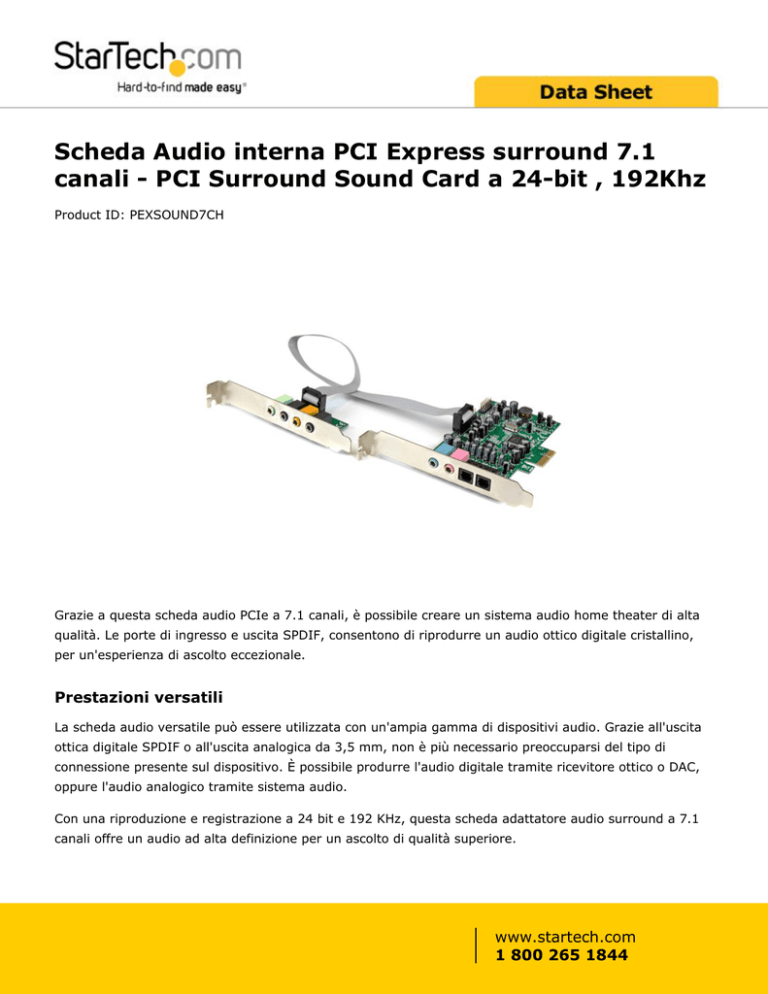 Scheda Audio interna PCI Express surround 7.1 canali - PCI Surround Sound Card a 24-bit , 192Khz Product ID: PEXSOUND7CH Grazie a questa scheda audio PCIe a 7.1 canali, è possibile creare un sistema audio home theater di alta qualità. Le porte di ingresso e uscita SPDIF, consentono di riprodurre un audio ottico digitale cristallino, per un'esperienza di ascolto eccezionale. Prestazioni versatili La scheda audio versatile può essere utilizzata con un'ampia gamma di dispositivi audio. Grazie all'uscita ottica digitale SPDIF o all'uscita analogica da 3,5 mm, non è più necessario preoccuparsi del tipo di connessione presente sul dispositivo. È possibile produrre l'audio digitale tramite ricevitore ottico o DAC, oppure l'audio analogico tramite sistema audio. Con una riproduzione e registrazione a 24 bit e 192 KHz, questa scheda adattatore audio surround a 7.1 canali offre un audio ad alta definizione per un ascolto di qualità superiore. www.startech.com 1 800 265 1844 Facile installazione A differenza delle altre schede audio, questa è progettata appositamente per computer a basso profilo ed è perfetta per i PC home theater (HTPC). Fa da collegamento alle diverse porte presenti su una scheda principale più un'innovativa staffa header separata. La scheda è configurata con staffe dal profilo standard e include staffe a profilo basso (mezza altezza). La scheda audio surround a 7.1 canali è semplice da installare. È perfetta per chi desidera una soluzione semplice per migliorare l'esperienza di ascolto, come appassionati di musica o esperti del mixaggio. Opzioni di ingresso multiple Per una maggiore scalabilità, è possibile connettere rapidamente un microfono o altri dispositivi di registrazione al computer tramite due jack di ingresso audio digitale SPDIF o stereo da 3,5 mm. PEXSOUND7CH è coperto dalla garanzia di 2 anni StarTech.com e dal supporto tecnico gratuito a vita. www.startech.com 1 800 265 1844 Certifications, Reports and Compatibility Applications • • Consente di creare una sistema home theater economico da PC o di trasformare il desktop in un centro multimediale Fornisce ingressi e uscite aggiuntivi per sorgenti o destinazioni audio • multiple Permette di aggiornare l'audio preinstallato solo-stereo nel computer Features • Qualità sonora eccellente con audio surround ad alta risoluzione a 7.1 • Supporta dispositivi ottici digitali o audio analogici mediante jack da 3,5 mm o SPDIF Tutte le porte si adattano a computer con fattore di forma ridotto o standard (staffe a basso profilo incluse), mediante la principale scheda più staffa header Supporta audio HD, con riproduzione e registrazione fino a 24 bit e 192 KHz Microfono stereo, linea, input SPDIF ~92 dB SNR (rapporto segnale/rumore) all'uscita anteriore Tre ingressi ausiliari interni (2 x CD/DVD-IN e 1 x audio pannello frontale Intel HD) Supporta ASIO e WASAPI • • • • • • www.startech.com 1 800 265 1844 Hardware Prestazioni Warranty 2 Years ID chipset C-Media - CM8828 Tipo bus PCI Express Tipo scheda Profilo standard (staffa basso profilo incl.) Specifiche audio Riproduzione e registrazione a 24 bit/192 KHz SNR: Circa 92 dB (ponderazione A) all'uscita anteriore Connessioni: - Linea d'ingresso destra/sinistra analogica - Ingresso microfono destro/sinistro analogico - Ingresso ottico digitale S/PDIF - Uscita ottica digitale S/PDIF - 2 x connettore 10 pin - connettore a 9 pin - 2 x connettore ingresso CD analogico - Uscita analogica destra/sinistra anteriore - Uscita analogica destra sinistra surround laterale - Uscita analogica centro/subwoofer - Uscita analogica destra/sinistra surround posteriore Connettore/i Supporto modalità Full Duplex Sì Porte esterne 2 - Toslink (SPDIF, ottico) Femmina 6 - Mini-jack da 3,5 mm (3 posizioni) Femmina Porte interne 2 - MPC2 (4 pin, Audio) Maschio 2 - IDC (10 pin, header scheda madre) Maschio 1 - IDC (9 pin, USB 2.0, header scheda madre) Maschio Tipo/i connettori 1 - PCI Express x1 Maschio Software Compatibilità con sistemi operativi Windows® 10 (32/64), 8 / 8.1 (32/64), 7 (32/64), Vista (32/64), XP (32/64) Note/requisiti speciali Requisiti di sistema e cavi Computer dotato di PCI Express con uno slot PCI Express x1 o superiore (x4, x8, x16) disponibile Slot aggiuntivo sul case del computer se si installa e utilizza la staffa header Ambientale Caratteristiche fisiche Temperatura d'esercizio 0°C to 70°C (32°F to 158°F) Temperatura di conservazione -10C to 80°C (14°F to 176°F) Umidità 10~90% RH Altezza prodotto 4.7 in [120 mm] Larghezza prodotto 0.7 in [18 mm] www.startech.com 1 800 265 1844 Lunghezza prodotto 4.3 in [109 mm] Peso prodotto 3.7 oz [105 g] Informazioni confezione Peso spedizione (confezione) 7.4 oz [210 g] Contenuto della confezione Incluso nella confezione 1 - Scheda audio PCI Express a 7.1 canali con staffa header e cavo a 10 pin 2 - Staffe basso profilo 1 - Manuale di istruzioni Product appearance and specifications are subject to change without notice. www.startech.com 1 800 265 1844