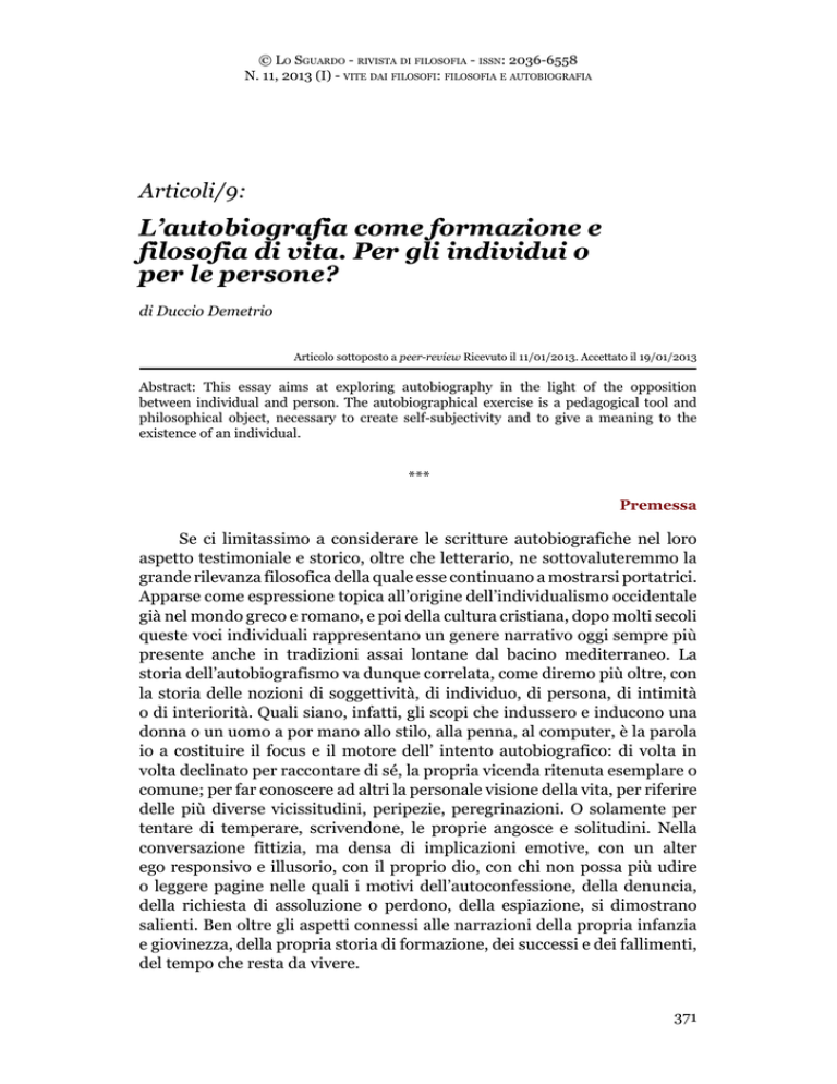 © Lo Sguardo - rivista di filosofia - issn: 2036-6558 N. 11, 2013 (I) - vite dai filosofi: filosofia e autobiografia Articoli/9: L’autobiografia come formazione e filosofia di vita. Per gli individui o per le persone? di Duccio Demetrio Articolo sottoposto a peer-review Ricevuto il 11/01/2013. Accettato il 19/01/2013 Abstract: This essay aims at exploring autobiography in the light of the opposition between individual and person. The autobiographical exercise is a pedagogical tool and philosophical object, necessary to create self-subjectivity and to give a meaning to the existence of an individual. *** Premessa Se ci limitassimo a considerare le scritture autobiografiche nel loro aspetto testimoniale e storico, oltre che letterario, ne sottovaluteremmo la grande rilevanza filosofica della quale esse continuano a mostrarsi portatrici. Apparse come espressione topica all’origine dell’individualismo occidentale già nel mondo greco e romano, e poi della cultura cristiana, dopo molti secoli queste voci individuali rappresentano un genere narrativo oggi sempre più presente anche in tradizioni assai lontane dal bacino mediterraneo. La storia dell’autobiografismo va dunque correlata, come diremo più oltre, con la storia delle nozioni di soggettività, di individuo, di persona, di intimità o di interiorità. Quali siano, infatti, gli scopi che indussero e inducono una donna o un uomo a por mano allo stilo, alla penna, al computer, è la parola io a costituire il focus e il motore dell’ intento autobiografico: di volta in volta declinato per raccontare di sé, la propria vicenda ritenuta esemplare o comune; per far conoscere ad altri la personale visione della vita, per riferire delle più diverse vicissitudini, peripezie, peregrinazioni. O solamente per tentare di temperare, scrivendone, le proprie angosce e solitudini. Nella conversazione fittizia, ma densa di implicazioni emotive, con un alter ego responsivo e illusorio, con il proprio dio, con chi non possa più udire o leggere pagine nelle quali i motivi dell’autoconfessione, della denuncia, della richiesta di assoluzione o perdono, della espiazione, si dimostrano salienti. Ben oltre gli aspetti connessi alle narrazioni della propria infanzia e giovinezza, della propria storia di formazione, dei successi e dei fallimenti, del tempo che resta da vivere. 371 © Lo Sguardo - rivista di filosofia - issn: 2036-6558 N. 11, 2013 (I) - vite dai filosofi: filosofia e autobiografia Con queste accennate premesse, era dunque inevitabile che, finalmente, anche in Italia gli studi filosofici iniziassero ad occuparsi di un genere del quale un numero considerevole di filosofi e di filosofe a lungo si è avvalso: nelle forme del diario, della memorialistica, del saggio critico e aforistico. In secondo luogo, grazie a più di cento anni di psicoanalisi, andava da sé che le pratiche cliniche si incontrassero con la più recente rivisitazione della filosofia, antica e contemporanea (con P. Hadot, l’ultimo M. Foucault, G. Gusdorf soprattutto), come esercizio del pensiero, come cura dell’anima, come consulenza esistenziale e non soltanto in quanto lavoro teoretico. Laddove si sia pertanto ridato voce alle soggettività, al ruolo della narrazione biografica, alla scrittura e al concorso che tale tirocinio meditativo e introspettivo offre a chiunque nell’indurre processi autoconoscitivi e – junghianamente – d’individuazione. L’autobiografia oggetto e processo filosofico. Tra annose sottovalutazioni e più recenti interessi, l’autobiografia può pertanto essere considerata un oggetto filosofico nella duplice direzione sottolineata. Ogni autobiografia, quando scaturisca da un desiderio autoconoscitivo autentico, del resto l’espressione di una molteplicità di interrogativi rivolti a se stessi. I cui tentativi di risposta sono affidati al lavorio mentale, denso di implicazioni emotive, di una scrittura a nient’altro che a questo interessata. Riconducibile ad una o esse convergono attorno a temi quali: un profondo scontento o disorientamento esistenziale, una ferita dell’essere non rimarginabile da nessun palliativo terapeutico, un’inquietudine che si chiede alla scrittura ora di sanare, ora invece di riaccendere. Inoltre, si tratta di manifestazioni autonarrative scaturenti da domande che gli autori pongono a se stessi e alla vita nella sua accezione più ampia. Nel sottolineare tali aspetti, che ci suggeriscono di sfogliare soprattutto le pagine nelle quali vengono esplicitati tali motivi, intendo rimarcare il valore etico di quelle autobiografie che siano incipit ed esito di un travaglio trasformativo. Intenzionalmente o imprevedibilmente attivato dalla scrittura. Si è indotti a scrivere di sé per scoprire se la propria vita ha avuto un senso, per reagire ad una perdita, ad una malattia, ad un abbandono. Si scrive perché sono le diverse dimensioni dell’infelicità umana ad invitarci a farlo. Tutti momenti, questi, nei quali ci si trovi e scopra nudi e sperduti, privi di forza. Dinanzi alle prove ineluttabili che ogni individuo non può evitarsi di affrontare. Quando si scelga, con coraggio, di analizzare se stessi in quanto materia pensante e sempre a nostra disposizione. Per rievocare una celebre e felice espressione di Michel de Montaigne. Non si tratta, però, soltanto di cambiamenti autoreferenziali, interiori, o di processi che – a partire dalla ricostruzione paziente delle memorie personali – si rivelano fonte di scoperte impreviste. I cambiamenti vissuti in prima persona, concernono oltre ad una diversa rappresentazione di sé, cui gli scriventi pervengono già durante o al termine del racconto della loro storia 372 © Lo Sguardo - rivista di filosofia - issn: 2036-6558 N. 11, 2013 (I) - vite dai filosofi: filosofia e autobiografia di vita, aspetti che esulano da tale prevalente connotazione. Poiché in tali pratiche sono riscontrabili effetti che implicano anche variazioni di ordine relazionale. Si tratti di
