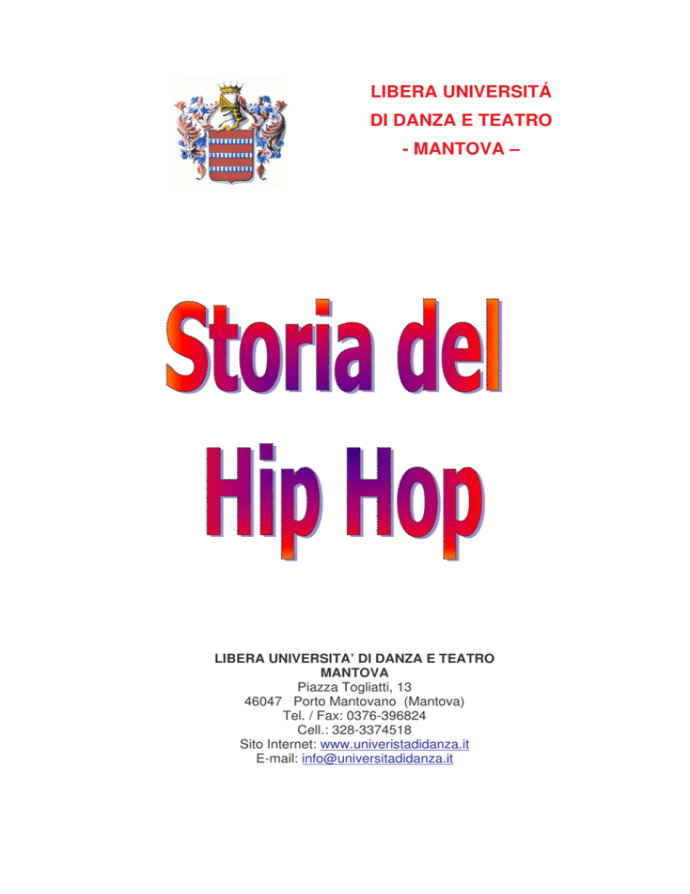 LIBERA UNIVERSITÁ DI DANZA E TEATRO - MANTOVA – LIBERA UNIVERSITA’ DI DANZA E TEATRO MANTOVA Piazza Togliatti, 13 46047 Porto Mantovano (Mantova) Tel. / Fax: 0376-396824 Cell.: 328-3374518 Sito Internet: www.univeristadidanza.it E-mail: info@universitadidanza.it Indice Introduzione pag. 3 Riferimento Socio-culturale pag. 5 Nascita del Movimento Hip Hop pag. 12 I Graffiti e l’Hip Hop pag. 21 Anima musicale dell’Hip Hop pag. 24 Principi dell’Hip hop pag. 38 Hip Hop e Mass-media pag. 47 Diffusione del movimento Hip Hop in Italia pag. 50 La danza Hip Hop pag. 57 Conclusioni pag. 62 Dizionario di terminologia Hip Hop pag. 63 " Si dice <chi controlla la cultura, controlla le persone>. Ora come ora la nostra cultura non è controllata da noi stessi e certi aspetti della nostra cultura sono esaltati in maniera controproducente. La gente chiama l 'Hip Hop cultura. L 'Hip Hop è una sottocultura… Kwane Toure una volta mi ha detto: <L 'Hip Hop ha preso molte cose in prestito dalla cultura nera. Tu sei in grado di fare Hip Hop perchè ci sono state persone che hanno contribuito alla cultura nera. Perciò, dal momento che fai Hip Hop, dovresti farlo con un solo scopo: eccellere in ciò che fai e restituirlo alla tua cultura così da contribuire al progresso della tua gente. Se non fai questo, è un suicidio, non un progresso. > ". INTRODUZIONE Iniziamo con una breve introduzione storica, che serve a chiarire il quadro politico in cui versava l' America del periodo in cui si svolge la nostra storia. Indicativamente, questo periodo attraversa gli anni Sessanta, Settanta, gli anni Ottanta e i primi anni Novanta. Si passa quindi da Martin Luther King e il suo assassinio al presidente Nixon, da Reagan al primo George Bush. Il tema del razzismo in America è sempre stato discusso e sentito dalla popolazione; soprattutto negli stati del Sud, i neri venivano separati dai bianchi nei trasporti pubblici, nei locali e nelle scuole. Il pioniere della lotta per i diritti dei neri fu Martin Luther King (1929-1968). Divenne pastore di una chiesa dell'Alabama nel 1954 e da quel giorno promosse una lotta non violenta, per far cessare le discriminazioni; un esempio lo si può avere citando l' episodio che lo portò al riconoscimento nazionale: nel 1955, una sarta di colore si rifiutò di cedere il suo posto ad un bianco sull' autobus, com' era consuetudine. Quando la donna venne arrestata e condannata, i neri, guidati da King, decidono di boicottare i trasporti pubblici. Un anno dopo 27 città del Sud cedono e mettono fine alla segregazione sui trasporti municipali. Fu allora che King divenne presidente dell'associazione per i diritti civili dei neri. Ovunque, dove i neri erano vittime di razzismo, King è presente. Nel 1963 guida la marcia su Washington e davanti a 250 mila manifestanti, pronuncia il suo discorso: “Io sogno che un giorno i miei quattro figli vivranno in un paese dove non si giudicherà dal colore della pelle, ma dalla natura del loro carattere... " Nel 1964 il presidente Johnson firma la legge sui diritti civili: tutti gli Americani, bianchi e neri, sono uguali. Lo stesso anno King riceve il premio Nobel per la pace. Sarà nel 1968 che King verrà assassinato, episodio che dimostra come i programmi per la difesa dei diritti dei neri non fossero stati comunque del tutto accettati. Il presidente Johnson non si presenta alle elezioni dello stesso anno e gli succede il repubblicano conservatore anticomunista Nixon, il quale deve dimettersi in seguito ad uno scandalo di intercettazioni illegali che sdegna l' opinione pubblica. E' la volta di Jimmy Carter, onesto georgiano esponente dei "buoni sentimenti" della provincia americana. In politica interna, Carter si fa paladino di una maggiore trasparenza etica e dei diritti dei neri. In politica estera, si fa sostenitore dei "diritti dell' uomo", criticando le violazioni che di essi vengono fatte in varie parti del mondo. Viene sconfitto da Reagan nelle elezioni del 1980. Con Reagan è tornata al potere l' America Repubblicana, con l' intento dichiarato di riportare il paese ai valori del privatismo e dell' individualismo trionfanti, contro l' interventismo statalistico dei democratici. Reagan stimola l' iniziativa privata, gli investimenti, l' occupazione. I risultati sono stati per un verso di rivitalizzazione degli investimenti e delle tecnologie, per l' altro di approfondimento di differenze sociali, in primo luogo tra bianchi e neri. L' America viene rilanciata con un' immagine forte ed intransigente, ma con un debito pubblico senza precedenti. Il suo successore, George Bush, subentrato nel 1988, ha ripercorso in un certo modo la parabola di Reagan: notevoli successi in politica estera, mentre la politica interna vedeva un carico fiscale leggero per aumentare il benessere e favorire gli affari. Purtroppo, questo portò soltanto ad un aumento del debito pubblico e ad un aggravio dei dislivelli sociali. Ed è proprio in questi anni che l' Hip Hop inizia. RIFERIMENTO SOCIO-CULTURALE Il fenomeno, perchè proprio di fenomeno si può parlare, dell' Hip Hop non è semplicemente uno stile di musica e danza, ma un passo importante della storia, un modo di sfuggire a realtà abbandonate alla propria povertà e disperazione, e non si può capire esattamente da cosa nasce se non si ha ben chiaro il contesto che lo generò, il senso di necessità e di rivoluzione che lo provocò e che ne fece la moda e la forza che si vedono oggi. AMERICA, NEW YORK, ANNI SETTANTA. A seguito di un rinnovamento urbano voluto dal sindaco di New York, tutte le persone di colore di origine afro-americana e ispanacaraibica provenienti dalle più disparate zone della Grande Mela, furono costrette a trasferirsi nel South Bronx. Questa "ricollocazione" avvenne senza nessun tipo di gradualità e creò una tensione sociale ed economica impossibile da gestire, in quanto il trapianto forzato creò una forte "crisi di rigetto". Si ci ribellava, infatti, ad una situazione che aveva a