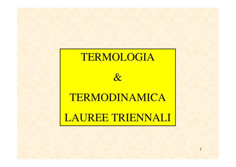 TERMOLOGIA & TERMODINAMICA LAUREE TRIENNALI 1 Meccanica: studia il moto dei corpi e le cause che lo genera Grandezze meccaniche: massa, velocità, accelerazione, forza, energia Struttura atomica dei gas: particelle tutte uguali della stessa massa che si muovono seguendo le leggi della meccanica Meccanica statistica Termodinamica: studia il riscaldamento delle sostanze, il loro cambiamento di stato, le trasformazioni di lavoro in calore e viceversa. Grandezze termodinamiche: calore, temperatura, calore specifico, capacità termica, energia interna 2 Sistema termodinamico Un sistema termodinamico è una qualunque porzione di spazio delimitato da una ben definita superficie attraverso cui si possa valutare il passaggio di materia e/o di energia sotto forma di lavoro e di calore Sistema termodinamico: gas Numero di componenti elementari (molecole) molto elevato, dell’ordine del numero di Avogadro NA= 6 1023 Stato microscopico del sistema: posizioni e velocità di tutte le molecole Evoluzione del sistema: Forza agente su ciascuna molecola Fì II principio della dinamica per ciascuna molecola posizioni e velocità di tutte le molecole in un certo istante (condizioni iniziali) IMPOSSIBILE E INUTILE!!!!! 3 Sistema e ambiente •Ambiente è tutto ciò che esiste nell’universo e che non appartiene al sistema stesso. Se i sistemi sono più di uno, la definizione è analoga ed in questo caso l’ambiente sarà tutto ciò che non appartiene ai sistemi considerati. •La termodinamica studia le relazioni che intercorrono tra le quantità termodinamiche che caratterizzano i sistemi in esame e per far ciò considera lo scambio di particelle (materia) e di energia che può avvenire tra sistemi e con l’ambiente circostante. • Sistema isolato: non scambia energia con l’ambiente • Sistema chiuso: non scambia materia con l’ambiente 4 Stato termodinamico Lo stato termodinamico macroscopico di un sistema termodinamico è determinato dai valori di alcune grandezze fisiche macroscopiche, dette parametri termodinamici o variabili di stato del sistema. Le variabili macroscopiche di stato di un sistema sono il risultato mediato dei contributi microscopici dovuti ai singoli elementi del sistema termodinamico. Relazione tra parametri microscopici e macroscopici Le variabili di stato di un sistema termodinamico sono: p = pressione , V = volume, T = temperatura, n = numero di moli Le variabili di stato non sono tutte indipendenti tra di loro: esiste sempre una relazione tra esse che prende il nome di equazione di stato, la cui forma matematica dipende dal sistema considerato. F(p, V, T, n ) = 0 Equazione di stato pV=nRT Equazione di stato dei gas perfetti 5 Rappresentazione grafica di uno stato L’equazione di stato, stabilendo una relazione tra le variabili di stato di un sistema, fa sì che le variabili di stato indipendenti siano tre a scelta tra le quattro: p p, V, T, n A Se scegliamo come variabili indipendenti p, V, n: lo stato A di un sistema è rappresentato da un punto nello spazio che ha come coordinate le tre coordinate indipendenti p, V, n. V n Nei sistemi chiusi (n = cost) si adopera spesso il paino (V, p), detto piano di Clapeyron. 6 Termologia: temperatura, calore, equilibrio termico La termologia studia la natura e gli effetti del calore. Ne fanno parte la termometria (misura delle temperature) e la calorimetria (misura delle quantità di calore che intervengono nei fenomeni). • Temperatura: grandezza fisica che esprime lo stato termico di un sistema, descrivendo la sua attitudine a scambiare calore con l’ambiente o con altri sistemi. Per definirla, si ammette che due sistemi in equilibrio termico fra loro condividono la stessa temperatura. •Calore: forma macroscopica di energia ceduta o acquistata da un sistema, a causa della differenza di temperatura fra esso e l’ambiente. Dal punto di vista microscopico, calore e temperatura sono collegati alle interazioni fra le molecole che costituiscono un corpo. 7 Proprietà transitiva dell’equilibrio termico (Principio zero della Termodinamica) Il sistema A è in equilibrio termico col sistema B Il sistema A è in equilibrio termico col sistema C Il sistema C è in equilibrio termico col sistema B Graficamente: A B + C B = A C 8 Dilatazione termica Un corpo di spessore trascurabile rispetto alla sua lunghezza (filo). quando subisce una variazione di temperatura ∆t, si allunga (dilatazione termica lineare) di una quantità ∆l = l - l0 = λ l0 ∆t = λ l0 (t – t0) l0 = lunghezza alla temperatura t0 l = lunghezza alla temperatura t λ è detto coefficiente di dilatazione termica lineare [λ] = t-1 Se il corpo non è filiforme subirà una variazione di volume ∆V (dilatazione cubica) ∆V = V - V0 = α V0 ∆t = α V0 (t – t0) V0 = Volume alla temperatura t0 V = Volume alla temperatura t α è detto coefficiente di dilatazione termica cubico = 3 λ Dilatazione termica di una sfera e di un anello [α] = t-19 Coefficienti λ per alcuni materiali (°C-1) 10 Il termometro La definizione operativa di temperatura è basata sul fatto che il riscaldamento o il raffreddamento dei corpi inducono variazioni nelle loro proprietà fisiche (volume, pressione, resistenza elettrica, etc). (misura indiretta). L’espansione termica di un fluido (per es. mercurio, alcol) è la proprietà più utilizzata per misurare la temperatura. VARIAZIONE DI VOLUME VARIAZIONE DI NEL FLUIDO TEMPERATURA TERMOMETRICO Termometro empirico: tubo capillare chiuso di vetro con un bulbo, all’interno del quale è posto il liquido termometrico Taratura di un termometro : punti fissi ( fusione del ghiaccio ed ebollizione dell’acqua a pressione normale) Portata e sensibilità di un termometro Termometri a massima e a minima Termometro clinico 11 Scale termometriche Nel processo di calibrazione di un termometro empirico bisogna attribuire un valore arbitrario di temperatura al valore del volume della sostanza termometrica nei due punti fissi. A seconda di questi valori e 