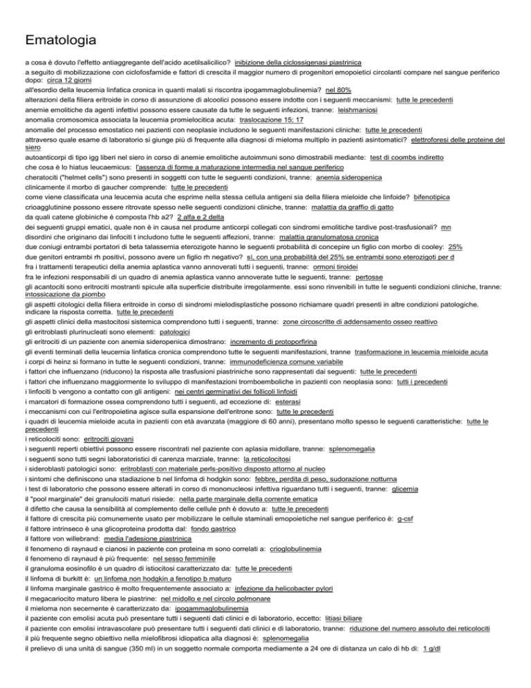 Ematologia a cosa è dovuto l'effetto antiaggregante dell'acido acetilsalicilico? inibizione della ciclossigenasi piastrinica a seguito di mobilizzazione con ciclofosfamide e fattori di crescita il maggior numero di progenitori emopoietici circolanti compare nel sangue periferico dopo: circa 12 giorni all'esordio della leucemia linfatica cronica in quanti malati si riscontra ipogammaglobulinemia? nel 80% alterazioni della filiera eritroide in corso di assunzione di alcoolici possono essere indotte con i seguenti meccanismi: tutte le precedenti anemie emolitiche da agenti infettivi possono essere causate da tutte le seguenti infezioni, tranne: leishmaniosi anomalia cromosomica associata la leucemia promielocitica acuta: traslocazione 15; 17 anomalie del processo emostatico nei pazienti con neoplasie includono le seguenti manifestazioni cliniche: tutte le precedenti attraverso quale esame di laboratorio si giunge più di frequente alla diagnosi di mieloma multiplo in pazienti asintomatici? elettroforesi delle proteine del siero autoanticorpi di tipo igg liberi nel siero in corso di anemie emolitiche autoimmuni sono dimostrabili mediante: test di coombs indiretto che cosa è lo hiatus leucaemicus: l'assenza di forme a maturazione intermedia nel sangue periferico cheratociti ("helmet cells") sono presenti in soggetti con tutte le seguenti condizioni, tranne: anemia sideropenica clinicamente il morbo di gaucher comprende: tutte le precedenti come viene classificata una leucemia acuta che esprime nella stessa cellula antigeni sia della filiera mieloide che linfoide? bifenotipica crioagglutinine possono essere ritrovate spesso nelle seguenti condizioni cliniche, tranne: malattia da graffio di gatto da quali catene globiniche è composta l'hb a2? 2 alfa e 2 delta dei seguenti gruppi ematici, quale non è in causa nel produrre anticorpi collegati con sindromi emolitiche tardive post-trasfusionali? mn disordini che originano dai linfociti t includono tutte le seguenti affezioni, tranne: malattia granulomatosa cronica due coniugi entrambi portatori di beta talassemia eterozigote hanno le seguenti probabilità di concepire un figlio con morbo di cooley: 25% due genitori entrambi rh positivi, possono avere un figlio rh negativo? sì, con una probabilità del 25% se entrambi sono eterozigoti per d fra i trattamenti terapeutici della anemia aplastica vanno annoverati tutti i seguenti, tranne: ormoni tiroidei fra le infezioni responsabili di un quadro di anemia aplastica vanno annoverate tutte le seguenti, tranne: pertosse gli acantociti sono eritrociti mostranti spicule alla superficie distribuite irregolarmente. essi sono rinvenibili in tutte le seguenti condizioni cliniche, tranne: intossicazione da piombo gli aspetti citologici della filiera eritroide in corso di sindromi mielodisplastiche possono richiamare quadri presenti in altre condizioni patologiche. indicare la risposta corretta. tutte le precedenti gli aspetti clinici della mastocitosi sistemica comprendono tutti i seguenti, tranne: zone circoscritte di addensamento osseo reattivo gli eritroblasti plurinucleati sono elementi: patologici gli eritrociti di un paziente con anemia sideropenica dimostrano: incremento di protoporfirina gli eventi terminali della leucemia linfatica cronica comprendono tutte le seguenti manifestazioni, tranne trasformazione in leucemia mieloide acuta i corpi di heinz si formano in tutte le seguenti condizioni, tranne: immunodeficienza comune variabile i fattori che influenzano (riducono) la risposta alle trasfusioni piastriniche sono rappresentati dai seguenti: tutte le precedenti i fattori che influenzano maggiormente lo sviluppo di manifestazioni tromboemboliche in pazienti con neoplasia sono: tutti i precedenti i linfociti b vengono a contatto con gli antigeni: nei centri germinativi dei follicoli linfoidi i marcatori di formazione ossea comprendono tutti i seguenti, ad eccezione di: esterasi i meccanismi con cui l'eritropoietina agisce sulla espansione dell'eritrone sono: tutte le precedenti i quadri di leucemia mieloide acuta in pazienti con età avanzata (maggiore di 60 anni), presentano molto spesso le seguenti caratteristiche: tutte le precedenti i reticolociti sono: eritrociti giovani i seguenti reperti obiettivi possono essere riscontrati nel paziente con aplasia midollare, tranne: splenomegalia i seguenti sono tutti segni laboratoristici di carenza marziale, tranne: la reticolocitosi i sideroblasti patologici sono: eritroblasti con materiale perls-positivo disposto attorno al nucleo i sintomi che definiscono una stadiazione b nel linfoma di hodgkin sono: febbre, perdita di peso, sudorazione notturna i test di laboratorio che possono essere alterati in corso di mononucleosi infettiva riguardano tutti i seguenti, tranne: glicemia il "pool marginale" dei granulociti maturi risiede: nella parte marginale della corrente ematica il difetto che causa la sensibilità al complemento delle cellule pnh è dovuto a: tutte le precedenti il fattore di crescita più comunemente usato per mobilizzare le cellule staminali emopoietiche nel sangue periferico è: g-csf il fattore intrinseco è una glicoproteina prodotta dal: fondo gastrico il fattore von willebrand: media l'adesione piastrinica il fenomeno di raynaud e cianosi in paziente con proteina m sono correlati a: crioglobulinemia il fenomeno di raynaud è più frequente: nel sesso femminile il granuloma eosinofilo è un quadro di istiocitosi caratterizzato da: tutte le precedenti il linfoma di burkitt è: un linfoma non hodgkin a fenotipo b maturo il linfoma marginale gastrico è molto frequentemente associato a: infezione da helicobacter pylori il megacariocito maturo libera le piastrine: nel midollo e nel circolo polmonare il mieloma non secernente è caratterizzato da: ipogammaglobulinemia il paziente con emolisi acuta può presentare tutti i seguenti dati clinici e di laboratorio, eccetto: litiasi biliare il paziente con emolisi intravascolare può presentare tut