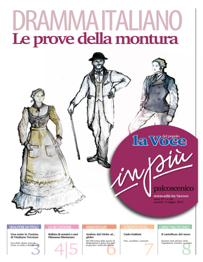 DRAMMA ITALIANO Le prove della montura la Voce del popolo la Voce del popolo palcoscenico www.edit.hr/lavoce Anno 10 • n. 84 martedì, 6 maggio 2014 UNAUTOREUNTITOLO Una notte in Tunisia, di Vitaliano Trevisan LA RECENSIONE ANNIVERSARI A PROPOSITO DI... Ballata di uomini e cani Filumena Marturano Amleto dal Globe al... globo Carlo Goldoni Nel 450.esimo della nascita di Shakespeare la pièce due anni in giro per i teatri del mondo Vita, aneddoti, curiosità 3 4|5 Una delle ultime notti di Craxi, in esilio a Hammamet 6 CARNETPALCOSCENICO Il cartellone del mese 7 8 Quattro città (Fiume, Pola, Capodistria, Trieste), sei teatri 2 martedì, 6 maggio 2014 DRAMMA ITALIANO... palcoscenico la Voce del popolo di Gianfranco Miksa «IBOTONIDELAMONTURA» Erano altri tempi STORIE DI BODOLI, DALMATI, ISTRIANI... DELL’EPOCA FELIX, TRATTE DALLE «MALDOBRIE» DI LINO CARPINTERI E MARIANO FARAGUNA. REGIA DI GIORGIO AMODEO. FIRMA I COSTUMI MANUELA PALADIN ŠABANOVIĆ (IN PRIMA LE BOZZE) L’ epoca “felix”, ossia “felice” dell’Austria-Ungheria, quando su un grande territorio come quello dell’Impero bicipite vivevano genti differenti per etnia, credo religioso, lingua, usi e costumi. Popoli che vivevano uniti e relativamente in pace sotto la bandiera del commercio, del progresso, del benessere materiale. Ovviamente non si può affermare che questi popoli si amassero alla follia, ma perlomeno si comprendevano a meraviglia in virtù degli affari che dovevano concludere l’uno con l’altro e proprio per questo parlavano un’idioma comune, la lingua “franca” dei traffici, quello splendido istro-veneto marinaro infarcito soprattutto di termini slavi e tedeschi, ma anche francesi, ebraici, greci e di etimologia latina. Insomma, di tutto ciò è rimasta una patina di romantica nostalgia, di eterno rimpianto. Ora questa patina di altri tempi viene evocata al Dramma Italiano del Teatro nazionale croato “Ivan de Zajc” di Fiume con la commedia “I botoni de la montura”, appartenente al magico mondo delle celeberrime “Maldobrìe” di Lino Carpinteri e Mariano Faraguna. È una commedia in dialetto istroveneto, adattata per l’occasione da Giorgio Amodeo che ne cura pure l’aspetto registico. Attore e regista triestino, esperto di teatro per l’infanzia, è conosciuto al pubblico della Comunità nazionale italiana – e non solo, ovviamente – per avere allestito in precedenza le fiabe di “Mille e una notte”, “Bonaventura veterinario per forza” e “Mini & Maxi”; inoltre, lo ricordiamo anche nelle vesti di protagonista delle pièce “Somewhere City”, di Goran Lelas, e dell’applauditissima “Camere da letto”, commedia brillante di Alan Ayckbourn. Questo suo nuovo spettacolo debutterà il 21 maggio allo “Zajc”, dopodiché è prevista a giugno una tournée in Istria. L’adattamento intitolato “I botoni de la montura” vede impegnati in scena gli attori della compagnia di prosa in lingua italiana. Ovvero Bruno Nacinovich, Ivna Bruck, Giuseppe Nicodemo, Elena Brumini, Alida Delcaro, Leonora Surian, Neven Stipanov, Toni Plešić, Rosanna Bubola, Elvia Nacinovich e Lucio Slama. Tutti loro rappresentano una serie di storielle divertenti in cui si raccontano le vicende di “bodoli”, dalmati, istriani vissuti al tempo del vecchio Impero austro-ungarico, quando tutto doveva andare secondo le regole e un certo garbo comune, perché l’Austria era una Paese ordinato. La trama prevede come sempre numerosi personaggi, ognuno indaffarato in propri specifici problemi, dal vecchio Moise che litiga coi parenti e vuole cambiare paese, al prete che vuole elemosine più congrue dai suoi parrocchiani, al podestà tribolato dalla necessità di trovare in tempi brevi una sistemazione più consona al suo municipio, che è momentaneamente ospitato in un’ala della locale scuola elementare. Siamo vicini alla Prima guerra mondiale e il dispotico patriarca ha la felice intuizione di investire tutto il patrimonio familiare nella realizzazione della nave del futuro e battere la concorrenza degli armatori concorrenti... Ma i figli sono contrari. palcoscenico la Voce del popolo Un’idea nata diverso tempo fa CON IL REGISTA GIORGIO AMODEO UNO SCRITTORE UN TITOLO... martedì, 6 maggio 2014 Perché la scelta delle “Maldobrie”? “Perché Carpinteri & Faraguna sono due autori straordinari che rimandano al periodo dell’Austria in cui s’immagina che tutto fosse bello. Ovviamente la realtà era ben diversa, con l’austriaco considerato spesso come l’usurpatore, però nel ricordo nostalgico tutto si colora di rosa e tutto diventa piacevole. In questi racconti parliamo specificamente del nostro territorio con tutta la musicalità dovuta all’istroveneto che era una lingua di comunicazione veicolare”. Quali “Maldobrìe” vedremo in scena? “Sono quattro ‘Maldobrìe’ che abbiamo inserito in modo tale da non far capire dove inizia una storia e dove finisce l’altra. Si tratta de ‘L’avanzamento’, ‘Il testamento del vecio Moise’, ‘Il nuovo testamento’ e ‘Il pezzo del scartazin pei denti’. In realtà questo è un vecchio adattamento degli anni Duemila, che avevo realizzato con il Gruppo Teatrale per il Dialetto. Compagnia con cui difatti c’è la collaborazione anche per quest’allestimento, in quanto è la detentrice dei diritti del copione. Non è uno spettacolo a quadri che spesso caratterizzano le ‘Maldobrìe’, bensì un lavoro unico. Una storia con un inizio e una fine, e al cui interno ci sono tutte le varie vicende”. Qual è la storia? “La vicenda si svolge nel piccolo centro costiero di San Nicolò a Veglia, dove la tranquilla monotonia del paesino isolano viene turbata dall’arrivo inaspettato del vecchio Moise, ricchissimo e collerico proprietario terriero di Lussino, che ha abbandonato improvvisamente, dopo un litigio, i propri parenti per venire a stabilirsi sull’isola. Tra un episodio spassoso e l’altro ritroviamo coppie di sposi e occ