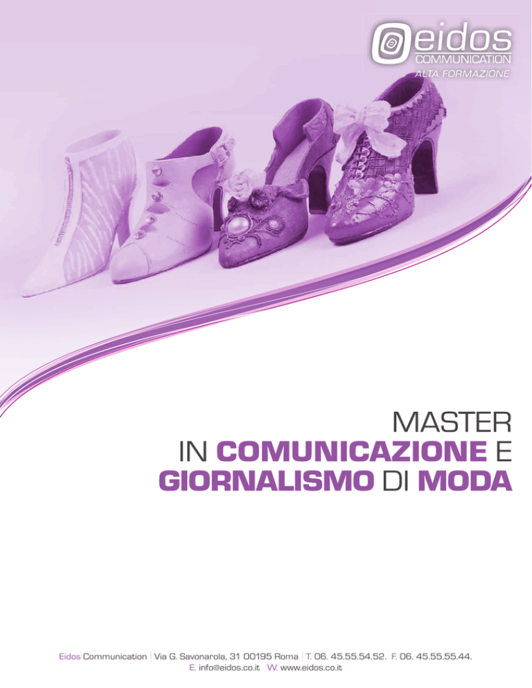 MASTER IN COMUNICAZIONE E GIORNALISMO DI MODA Eidos Communication Via G. Savonarola, 31 00195 Roma T. 06. 45.55.54.52. F. 06. 45.55.55.44. E. info@eidos.co.it W. www.eidos.co.it MASTER IN COMUNICAZIONE E GIORNALISMO DI MODA INFORMAZIONI GENERALI OBIETTIVI L’obiettivo e’ preparare dei fashion journalist capaci di interpretare e raccontare l’enorme flusso di informazione del sistema moda. Il giornalista di moda non solo comunica la sfilata, la critica e la confronta, ma deve anche saper comprendere le logiche della pubblicità e del business moda, destreggiandosi tra pressioni e limitazioni. Il Master in Comunicazione e Giornalismo di Moda dà tutti gli strumenti necessari per diventare un professionista che conosce le modalità, le fonti, i bilanci, gli intrighi, le novità, gli eventi e gli appuntamenti imperdibili del sistema moda. La medesima formazione è necessaria anche all’addetto stampa, che media sistematicamente la comunicazione tra gli stilisti e la stampa. Cura gli interessi della casa di moda e ne conosce ogni dettaglio, anche economicofinanziario. Il suo è un lavoro di promozione della griffe quotidiano, gli sono richieste grandi doti relazionali e capacità organizzative complesse. AL TERMINE DEL MASTER I PARTECIPANTI SARANNO IN GRADO DI: √ Scrivere un articolo di moda √ Preparare un pezzo con il linguaggio televisivo √ Conoscere i protagonisti del fashion business √ Gestire le relazioni pubbliche di una casa di moda √ Organizzare una sfilata √ Scrivere un comunicato stampa on line √ Gestire un virtual press office √ Scrivere un pezzo on line √ Verificare le fonti della moda √ Conoscere gli appuntamenti imperdibili della moda √ Preparare un titolo di moda √ Organizzare le fotografie e le didascalie DESTINATARI Laureati, laureandi e quanti, con cultura equipollente, aspirino ad intraprendere una carriera nell’ambito del giornalismo e della comunicazione del settore moda. AMMISSIONE E BORSE DI STUDIO Per accedere al Master e per l’ assegnazione delle Borse di studio e delle altre agevolazioni è richiesto il superamento di una selezione di ingresso basata su: •Esame del Curriculum vitae •Verifica della conoscenza di una lingua straniera (inglese o francese a scelta) •Test di cultura generale e di conoscenza di base del mondo della moda e del relativo vocabolario •Test di scrittura: articolo e titolazione da un take di agenzia •Test di scrittura: foto e didascalia •Test di conoscenza dell’ufficio stampa •Colloquio motivazionale e di orientamento La prova di selezione si effettua gratuitamente presso la sede di Eidos Communication in via G. Savonarola, 31 a Roma telefonando allo 06/45.55.54.52 per fissare un appuntamento oppure inviando una mail (a cui allegare il proprio curriculum vitae) all’indirizzo: giornalismo@eidos.co.it MASTER IN COMUNICAZIONE E GIORNALISMO DI MODA INFORMAZIONI GENERALI|2 DURATA E SVOLGIMENTO FORMAZIONE IN AULA E LABORATORI OPERATIVI 128 ore, quattro mesi di formazione in aula, 8 weekend FORMULA WEEKEND A WEEKEND ALTERNI Sabato e Domenica [9:30 / 13:30 | 14:30 / 18:30] STAGE Al termine del Master tutti gli allievi potranno vivere un’esperienza sul campo attraverso gli Stage formativi presso aziende partner (per conoscere tutti i partner visita la pagina www.eidos.co.it /?cat=1&pag=6) di Eidos Communication. 480 ore di stage (3 mesi) garantito presso uffici stampa e dipartimenti comunicazione di aziende di moda, redazioni giornalistiche di carta stampata, radio, televisione e agenzia di stampa specializzate del settore. COLLABORAZIONE Per tutti gli allievi del Master è prevista la possibilità di effettuare una collaborazione con testate giornalistiche collegate alla Scuola di comunicazione di Eidos Communication. La collaborazione si sviluppa per un periodo minimo di 6 mesi, fino ad un massimo di 24 mesi, e può essere svolta anche a distanza, se richiesto. La collaborazione con le testate concorre al periodo necessario per l’iscrizione all’Albo dei Pubblicisti dell’Ordine dei Giornalisti FREQUENZA La frequenza è obbligatoria, al 70% rispetto al monte ore totale, ai fini del rilascio dell’Attestato di Specializzazione in Comunicazione e Giornalismo di Moda. Attraverso i report di valutazione stilati da ogni docente e successivamente ad una prova scritta al termine delle lezioni sarà compilata una graduatoria che porterà al rilascio degli Attestati di Merito e alla segnalazione delle qualità personali a tutto il network dei Partner I DOCENTI I docenti della scuola sono professionisti, giornalisti, tecnici della comunicazione, formatori scelti sia per l’alta preparazione che per la capacità di saper trasferire in aula i contenuti in modo interattivo, gradevole e non scolastico. Il corpo docenti di Eidos Communication è visibile all’indirizzo www.eidos.co.it/?cat=1&pag=5 INVESTIMENTO ECONOMICO L’investimento economico per la partecipazione al Master in Comunicazione e Giornalismo di Moda è di 6100,00 euro + I.V.A. (20%). La quota è comprensiva della copertura assicurativa Stage, della collaborazione giornalistica, delle attività di Laboratorio e del materiale didattico. E’ prevista l’assegnazione di Borse di Studio a copertura parziale e riduzioni per i fuori sede. FINANZIAMENTO E RATEIZZAZIONE Sono previste modalità di finanziamento e rateizzazione per la quota di partecipazione al Master in Comunicazione e Giornalismo di Moda. Per informazioni contattare la segreteria amministrativa della Scuola di comunicazione Eidos Communication allo 06 45 55 54 52 pag. 02 MASTER IN COMUNICAZIONE E GIORNALISMO DI MODA PROGRAMMA 1° WEEKEND COMUNICARE LA MODA LOGICHE E DINAMICHE DEL BUSINESS MODA √ Storia del costume e della moda √ Il business moda e il marketing della moda √ Logiche di alta moda e di pret-a-porter √ Gli incontri, i saloni, le fiere, le fashion-weeks √ Il vocabolario della moda TECNICHE DI RELAZIONI PUBBLICHE PER LA MODA √ Obiettivi e target delle RP moda: