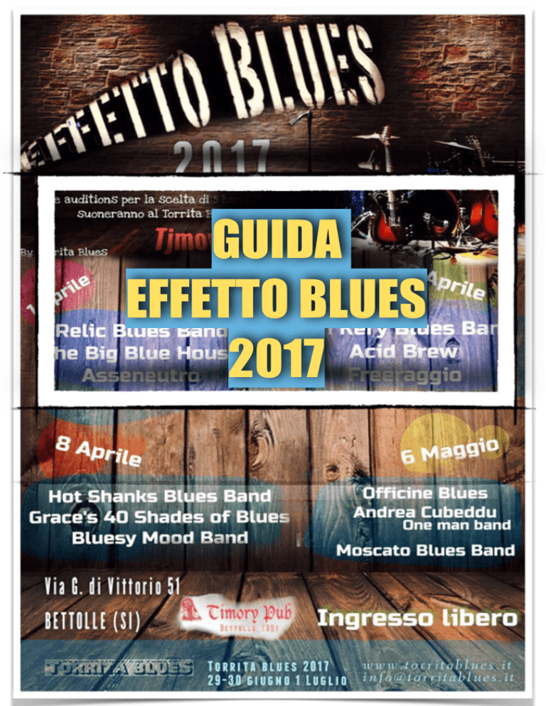 GUIDA EFFETTO BLUES 2017 L'Associazione Culturale Torrita Blues in collaborazione con Tjmory Pub presenta Effetto Blues 2017 (7ed.) 1 - 8 - 29 Aprile / 6 Maggio (3 concerti a sera) Tymory Pub - Bettole (SI) Via G. Di Vittorio 51 ore 22.30 Torrita Blues Festival 2017 inizia ufficialmente sabato 1 aprile con la 7° Edizione di Effetto Blues il mini festival blues di primavera dedicato alle blues band italiane che si esibiranno per 4 serate per un totale di 12 concerti interamente gratuiti sul prestigioso palco del Tjmory Pub di Bettolle sede storica di quasi tutte le precedenti edizioni. Effetto Blues nasce nel 2005 come spazio dedicato interamente alle Blues Band e agli artisti Blues italiani con l’obiettivo di scegliere alcuni gruppi da inserire nel cartellone del Torrita Blues Festival con i Big internazionali. In quell’anno furono fatti circa 40 concerti con tutte le band iscritte su12 serate in 4 locali della zona dalla quale furono scelte 7 band che si ebbero la possibilità di esibirsi nelle stesse serate di artisti di fama mondiale come Taj Mahal, Bettie Lavette, Otis Grand e Sonny Rhodes. Dopo alcuni anni di interruzione, Effetto Blues venne riproposto in occasione dell’edizione del Torrita Blues 2011, diventando da quel momento un appuntamento fisso e atteso ogni anno da decine e decine di band. Effetto Blues in 7 edizioni ha visto passare 133 band, negli anni sono nate collaborazioni tra l’Associazione Culturale Torrita Blues e gli artisti delle varie band con iniziative collaterali, serate a tema in locali della zona con i quali il Torrita Blues è in contatto o altri festival come il Camigliano Blues ( a Montalcino) dove dal 2011 ogni anno due band vengono scelte all’interno di Effetto Blues per suonare al Festival Blues di luglio/agosto. Nonostante l’obiettivo di Effetto Blues sia nato per di individuare le band italiane da inserire nel cartellone del Torrita Blues il sentiment dell’evento nel corso degli anni si sta trasformando in un vero e proprio mini blues festival di primavera atteso da tanti appassionati come l’anteprima ufficiale del Torrita Blues Festival di giugno. VI aspettiamo al Tjmory Pub con la nuova edizione di Effetto Blues. Siete tutti invitati ! Associazione Culturale Torrita Blues Effetto Blues 2017 Il calendario delle serate Sabato 1 Aprile Relic Blues Band (Treviso) The Big Blue House (Torrita di Siena) Asseneutro Funky Band (Bergamo) Sabato 8 Aprile Hot Shanks Blues Band (Aci Catena - CT) Grace's 40 Shades of Blues (Genova) Bluesy Mood Band (Perugia) Sabato 29 Aprile Van Kery Blues Band (Catania) Acid Brew (Bergamo) Freeraggio (Pieve di Cento - BO) Sabato 6 Maggio Officine Blues (Roma) Andrea Cubeddu One Man Band (Milano) Moscato Blues Band (Viareggio) Relic Blues Band (Treviso) Il gruppo nasce nel 2001 dal nucleo degli Stereovinile, con Marco Casarin (voce), Michele de Polo (chitarra) e Martino De Lazzari (basso) e con l’innesto del giovane Mauro De Lazzari alla batteria, folgorati dall’ascolto di una cassetta di un concerto dal vivo della Sixth Street Blues Band di Davide Drusian e Gigi Todesca, e con lo scopo di portare nella provincia trevigiana e non solo il buon vecchio blues nero delle prime blues band elettriche anni 50. Il gruppo trova subito terreno fertile nell’interland della marca trevigiana, ricevendo consensi da pubblico e locali. Nel marzo del 2002 il gruppo si allarga accogliendo con il suo sax tenore Marco Bisetto, proveniente da diverse esperienze classiche e jazz. In questo periodo il gruppo affina il proprio repertorio, che spazia da Muddy Waters a Little Walter, da BB King a Willie Dixon e Freddy King, non trascurando però pezzi storici del rock ‘n roll, e aumenta il campo d’azione iniziando collaborazioni importanti. Inoltre, la band viene selezionata per le edizioni 2003 e 2004 del Vicenza Blues Festival. Nel settembre del 2004 esce il primo album auto-prodotto intitolato “Blues in a bottle” con una tiratura di 200 copie che vengono bruciate nel breve periodo dell’estate e la conseguente ristampa di ulteriori 100 copie. Nel ottobre del 2004 il gruppo si arricchisce di un nuovo elemento, Marco Pisasale con il suo piano, il quale porta nuovi equilibri e fa fare un ulteriore salto di qualità alla formazione. La band conferma i risultati raggiunti raccogliendo successi nei locali delle province di Treviso, Padova, Vicenza e Belluno. A settembre esce il secondo album intitolato “Next stop: Green Street”, nel quale si avverte un ennesimo passo in avanti del gruppo, sia per i miglioramenti tecnici, sia per lo studio e la ricerca nella preparazione dei pezzi. Anche il secondo album ha una tiratura di 200 copie che vanno esaurite nel giro di pochi mesi, tanto che a febbraio 2006 va già in ristampa. Nel settembre del 2006 c’è un avvicendamento all’interno della band: Marco Casarin è costretto ad abbandonare la band e il suo posto viene preso da una vecchia conoscenza del gruppo: Daniele Cappellazzo detto “Asso” (già voce negli Stereovinile). Con il nuovo innesto la band cresce ancora, perché oltre alla sua grande voce, Daniele suona egregiamente anche lo strumento blues per eccellenza: l’armonica. Il repertorio cresce e anche la voglia di suonare in concerto: nel 2008 la Relic allarga i sui orizzonti: oltre a numerose date in Triveneto, la band suona in Lombardia, in Slovenia (presso il castello sul lago di Bled) e in Svizzera (al celebre “Paso Music” di Bellinzona). In autunno esce il terzo album “Blues Baby, Blues”, raccolta di pezzi classici del blues Chicago Style, rivisitati dalla band con nuove sonorità e maggiore cura dello stile. Nel 2009 la Relic Blues Band partecipa alle selezioni del Root’s and Blues Festival di Parma arrivando al 4° posto. Per motivi personali e di studio che lo porta all’estero, esce di scena il pianista Marco Pisasale. Di lì a poco, il bassista Martino De Lazzari si trasferirà a Huston (Texas), passando il testimone a Fabio Zottarelli, vecch