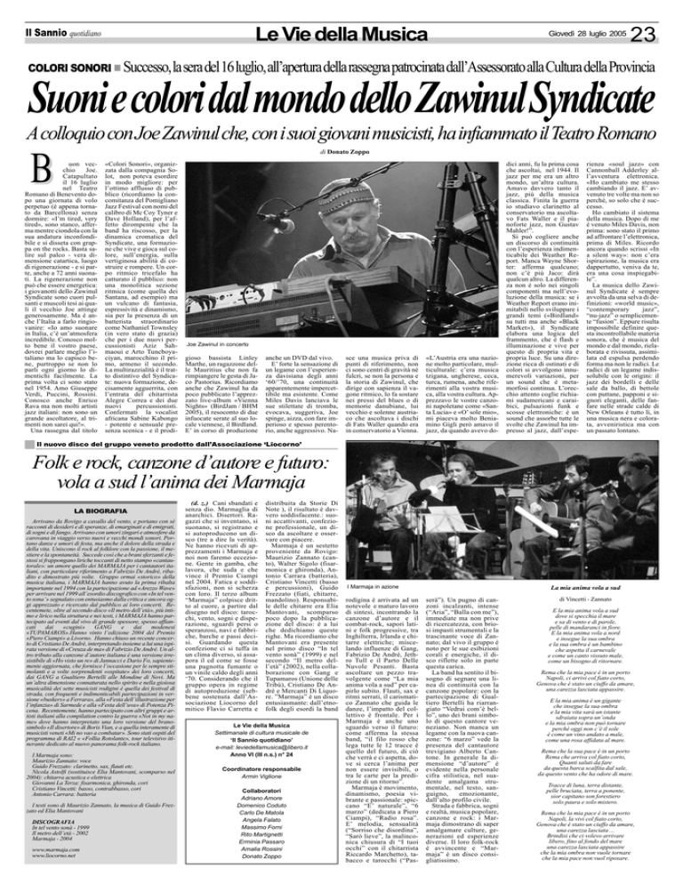 Le Vie della Musica Il Sannio quotidiano Giovedì 28 luglio 2005 23 COLORI SONORI Successo, la sera del 16 luglio, all’apertura della rassegna patrocinata dall’Assessorato alla Cultura della Provincia Suoni e colori dal mondo dello Zawinul Syndicate Acolloquio con Joe Zawinul che, con i suoi giovani musicisti, ha infiammato il Teatro Romano B di Donato Zoppo uon vecchio Joe. Catapultato il 16 luglio nel Teatro Romano di Benevento dopo una giornata di volo perpetuo (è appena tornato da Barcellona) senza dormire: «I’m tired, very tired», sono stanco, afferma mentre ciondola con la sua andatura inconfondibile e si disseta con grappa on the rocks. Basta salire sul palco - vera dimensione catartica, luogo di rigenerazione - e si parte, anche a 72 anni suonati. La rigenerazione non può che essere energetica: i giovanotti dello Zawinul Syndicate sono cuori pulsanti e muscoli tesi ai quali il vecchio Joe attinge generosamente. Ma è anche l’Italia a farlo ringiovanire: «Io amo suonare in Italia, c’è un’atmosfera incredibile. Conosco molto bene il vostro paese, dovrei parlare meglio l’italiano ma lo capisco bene, purtroppo se non lo parli ogni giorno lo dimentichi facilmente. La prima volta ci sono stato nel 1954. Amo Giuseppe Verdi, Puccini, Rossini. Conosco anche Enrico Rava ma non molti artisti jazz italiani: non sono un grande ascoltatore, al trimenti non sarei qui!». Una rassegna dal titolo «Colori Sonori», organizzata dalla compagnia Solot, non poteva esordire in modo migliore: per l’ottimo afflusso di pubblico (ricordiamo la concomitanza del Pomigliano Jazz Festival con nomi del calibro di Mc Coy Tyner e Dave Holland), per l’affetto dirompente che la band ha riscosso, per la dinamica cromatica del Syndicate, una formazione che vive e gioca sul colore, sull’energia, sulla vertiginosa abilità di costruire e rompere. Un corpo ritmico tricefalo ha catturato il pubblico: non una monolitica sezione ritmica (come quella dei Santana, ad esempio) ma un vulcano di fantasia, espressività e dinamismo, sia per la presenza di un batterista straordinario come Nathaniel Townsley (in vero stato di grazia) che per i due nuovi percussionisti Aziz Sahmaoui e Arto Tuncboyaciyan, marocchino il primo, armeno il secondo. La multirazzialità è il tratto distintivo del Syndicate: nuova formazione, decisamente agguerrita, con l’entrata del chitarrista Alegre Correa e dei due nuovi percussionisti. Confermati la vocalist africana Sabine Kabongo - potente e sensuale presenza scenica - e il prodi- Joe Zawinul in concerto gioso bassista Linley Marthe, un ragazzone delle Mauritius che non fa rimpiangere le gesta di Jaco Pastorius. Ricordiamo anche che Zawinul ha da poco pubblicato l’apprezzato live-album «Vienna Nights» (BirdJam / BHM 2005), il resoconto di due infuocate serate al suo locale viennese, il Birdland. E’ in corso di produzione anche un DVD dal vivo. E’ forte la sensazione di un legame con l’esperienza davisiana degli anni ‘60/’70, una continuità apparentemente impercettibile ma esistente. Come Miles Davis lanciava le sue stilettate di tromba, evocava, suggeriva, Joe spinge, aizza, con fare imperioso e spesso perentorio, anche aggressivo. Na- sce una musica priva di punti di riferimento, non ci sono centri di gravità nè fulcri, se non la persona e la storia di Zawinul, che dirige con sapienza il vagone ritmico, lo fa sostare nei pressi del blues o di memorie danubiane, lui vecchio e solenne austriaco che ascoltava i dischi di Fats Waller quando era in conservatorio a Vienna. «L’Austria era una nazione molto particolare, multiculturale: c’era musica tzigana, ungherese, ceca, turca, rumena, anche riferimenti alla vostra musica, alla vostra cultura. Apprezzavo le vostre canzoni napoletane come «Santa Lucia» e «O’ sole mio», mi piaceva molto Beniamino Gigli però amavo il jazz, da quando avevo do- dici anni, fu la prima cosa che ascoltai, nel 1944. Il jazz per me era un altro mondo, un’altra cultura. Amavo davvero tanto il jazz, più della musica classica. Finita la guerra io studiavo clarinetto al conservatorio ma ascoltavo Fats Waller e il pianoforte jazz, non Gustav Mahler!”. Si può cogliere anche un discorso di continuità con l’esperienza indimenticabile dei Weather Report. Manca Wayne Shorter: afferma qualcuno; non c’è più Jaco: dirà qualcun altro. La differenza non è solo nei singoli componenti ma nell’evoluzione della musica: se i Weather Report erano inimitabili nello sviluppare i grandi temi («Birdland» su tutti ma anche «Black Market»), il Syndicate elabora una logica del frammento, che è flash e illuminazione e vive per questo di propria vita e propria luce. Su una direzione ricca di ostinati e di colori si avvolgono innumerevoli variazioni, per un sound che è metamorfosi continua. L’orecchio attento coglie richiami sudamericani e caraibici, pulsazioni funk e scosse elettroniche: è un sound che assorbe tutte le svolte che Zawinul ha impresso al jazz, dall’espe- rienza «soul jazz» con Cannonball Adderley all’avventura elettronica. «Ho cambiato me stesso cambiando il jazz. E’ avvenuto tre volte ma non so perchè, so solo che è successo. Ho cambiato il sistema della musica. Dopo di me è venuto Miles Davis, non prima: sono stato il primo ad affrontare l’elettronica, prima di Miles. Ricordo ancora quando scrissi «In a silent way»: non c’era ispirazione, la musica era dappertutto, veniva da te, era una cosa inspiegabile”. La musica dello Zawinul Syndicate è sempre avvolta da una selva di definizioni: «world music», “contemporary jazz”, “nu-jazz” o semplicemente “fusion”. Eppure risulta impossibile definire questa incontrollabile materia sonora, che è musica del mondo e dal mondo, rielaborata e rivissuta, assimilata ed espulsa perdendo forma ma non le radici. Le radici di un legame indissolubile con le origini: il jazz dei bordelli e delle sale da ballo, di bettole con puttane, papponi e si
