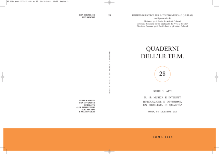28-10-2008 10:55 Pagina 1 ISBN 88-86704-38-0 ISSN 1826-7882 28 SERIE 3: ATTI. N. 13: MUSICA E INTERNET 00 COP. pant.1575+IV COP n. 28 ISTITUTO DI RICERCA PER IL TEATRO MUSICALE (I.R.TE.M.) con il patrocinio del Ministero per i Beni e le Attività Culturali Direzione Generale per lo Spettacolo dal Vivo e lo Sport Direzione Generale per i Beni Librari e gli Istituti Culturali QUADERNI DELL’I.R.TE.M. 28 SERIE 3: ATTI N. 13: MUSICA E INTERNET PUBBLICAZIONE NON IN VENDITA RISERVATA ALLE BIBLIOTECHE AGLI ARCHIVI E AGLI STUDIOSI RIPRODUZIONE E DIFFUSIONE, UN PROBLEMA DI QUALITÀ? ROMA, 8-9 DICEMBRE 2001 ROMA 2005 01 Quaderno N. 28 28-10-2008 11:31 Pagina b I.R.TE.M. ISTITUTO DI RICERCA PER IL TEATRO MUSICALE COMITATO DEI GARANTI: CARLO MARINELLI, presidente ENNIO MORRICONE, vicepresidente LAMBERTO MACCHI, consigliere 01 Quaderno N. 28 28-10-2008 11:31 Pagina I ISTITUTO DI RICERCA PER IL TEATRO MUSICALE (I.R.TE.M.) con il patrocinio del Ministero per i Beni e le Attività Culturali Direzione Generale per lo Spettacolo dal Vivo e lo Sport Direzione Generale per i Beni Librari e gli Istituti Culturali QUADERNI DELL’I.R.TE.M. 28 SERIE 3: ATTI N. 13: MUSICA E INTERNET RIPRODUZIONE E DIFFUSIONE, UN PROBLEMA DI QUALITÀ? partecipano BASSETTI - BENEDETTI - BURNETT DE BERNARDINIS - LANDINI - LONG LUDOVICO - MARINELLI - RAMELLO - RUBINI ROMA 2005 01 Quaderno N. 28 28-10-2008 11:31 Pagina II © Copyright 2005 by I.R.TE.M. Grafica Cristal s.r.l. Via Raffaele Paolucci, 12/14 - 00152 Roma 01 Quaderno N. 28 28-10-2008 11:31 Pagina III BASSETTI - BENEDETTI - BURNETT DE BERNARDINIS - LANDINI - LONG LUDOVICO - MARINELLI - RAMELLO - RUBINI MUSICA E INTERNET RIPRODUZIONE E DIFFUSIONE, UN PROBLEMA DI QUALITÀ? ROMA, 8-9 DICEMBRE 2001 01 Quaderno N. 28 28-10-2008 11:31 Pagina IV redazione a cura di LAURA NICOLETTA COLABIANCHI VERA ALCALAY I testi di Sergio Bassetti, Robert Burnett, Flavio De Bernardinis e Carlo Marinelli sono stati revisionati dagli autori. Agli altri sono state apportate solo correzioni redazionali. 01 Quaderno N. 28 28-10-2008 11:31 Pagina V Indice p. 3 CARLO MARINELLI 4 SERGIO BASSETTI La fonoteca di Babele 14 MARCO BENEDETTI Qualità sonora dell’audio compresso, considerazioni oggettive e soggettive 21 ROBERT BURNETT Music, Internet and Mobile Telephones 34 MARIA CARLA CAVAGNIS SOTGIU 44 FLAVIO DE BERNARDINIS Immagini e suoni: transiti reticolari 49 GIANCARLO LANDINI Opera e Internet: un’indagine e una valutazione 61 GIOVANNI RAMELLO Il mercato discografico tra presente e futuro tecnologico 71 STEVE LONG Classical Music on the Internet: the Expectations and the Reality 82 ALESSANDRO LUDOVICO Frequenze anomale e opportunità mediatiche: le nuove connotazioni dei file musicali V 01 Quaderno N. 28 28-10-2008 11:31 Pagina VI 90 ODERSO RUBINI Rumore di fondo 98 STEFANIA DI BLASIO 107 SERGIO BASSETTI Conclusioni 109 ELENCO ALFABETICO DEI NOMI DI PERSONA CITATI VI 01 Quaderno N. 28 28-10-2008 11:31 Pagina 1 sabato 8 dicembre 2001 ore 9 IL LUOGO DELLA MUSICA via de’ Delfini 20 presiede Carlo Marinelli 01 Quaderno N. 28 28-10-2008 11:31 Pagina 2 01 Quaderno N. 28 28-10-2008 11:31 Pagina 3 CARLO MARINELLI Dichiaro ufficialmente aperti i lavori del Convegno «Musica e Internet. Riproduzione e diffusione: un problema di qualità?». Questo Convegno vede la presenza di un numero ristretto ma molto qualificato di esperti italiani e stranieri. Saluto innanzitutto il professor Burnett, canadese che insegna all’Università di Karlstad, che non ha bisogno di alcuna presentazione perché è internazionalmente noto come esperto del settore e come autore di libri che sono di fondamentale lettura per chiunque vi si voglia introdurre. Il dottor Steve Long viene invece dall’Inghilterra e la sua ricerca è volta più al campo pratico che a quello teorico. Il Convegno sarà introdotto dalla relazione del professor Sergio Bassetti, esperto di problemi cinematografici oltre che «internettistici». Il dottor Marco Benedetti, insieme ai suoi colleghi della rivista AudioReview, ha effettuato alcuni esperimenti nel campo della certificazione di qualità attraverso i diversi gradi di compressione del suono per l’immissione e la trasmissione nella Rete. Partecipano al Convegno anche il professor De Bernardinis dell’Università di Roma «La Sapienza», il dottor Alessandro Ludovico della rivista Neural.it, il professor Giovanni Ramello dell’Università LIUC di Castellanza, il dottor Oderso Rubini del Centro Musica Moderna, con il quale ho avuto i primi scambi di idee per organizzare questo Convegno. Siamo inoltre in attesa del dottor Giancarlo Landini della rivista Opera, che è stato uno dei primi in Italia ad adoperare Internet ai fini della ricerca critica nel settore, e della dottoressa Cavagnis Sotgiu, direttrice della Discoteca di Stato. Per gli interventi sono presenti la dottoressa Stefania Di Blasio di 4e40, il dottor Francesco La Camera della «Sonus», a cui sono affidati tutti gli impianti videosonori dell’Istituto, la dottoressa Chiara Sirk della Discoteca dell’Università di Bologna e il professor Gianluca Tarquinio, che ha insegnato Discografia e Videografia musicale all’Università di Bologna. Un graditissimo e imprevisto arrivo è invece quello della dottoressa Anita Pesce di Napoli, che si è molto occupata di ricerche per uno degli ambiti più sconosciuti della discografia, quello delle case produttrici napoletane negli anni che vanno dall’inizio del secolo XX e la fine degli anni Venti. Fatte le dovute presentazioni, vorrei precisare che da parte mia non ci sarà alcun intervento introduttivo; mi limiterò a presiedere i lavori e a intervenire, se lo riterrò opportuno, nel corso della discussione. Mi fa estremamente piacere avervi qui e spero che siate ben alloggiati; e mi fa piacere soprattutto che abbiate trovato «una Roma che più Roma non potrebbe essere», visto che il colore e la trasparenza del cielo di oggi sono tipicamente romani: evidentemente anche Roma vi ha accolto v