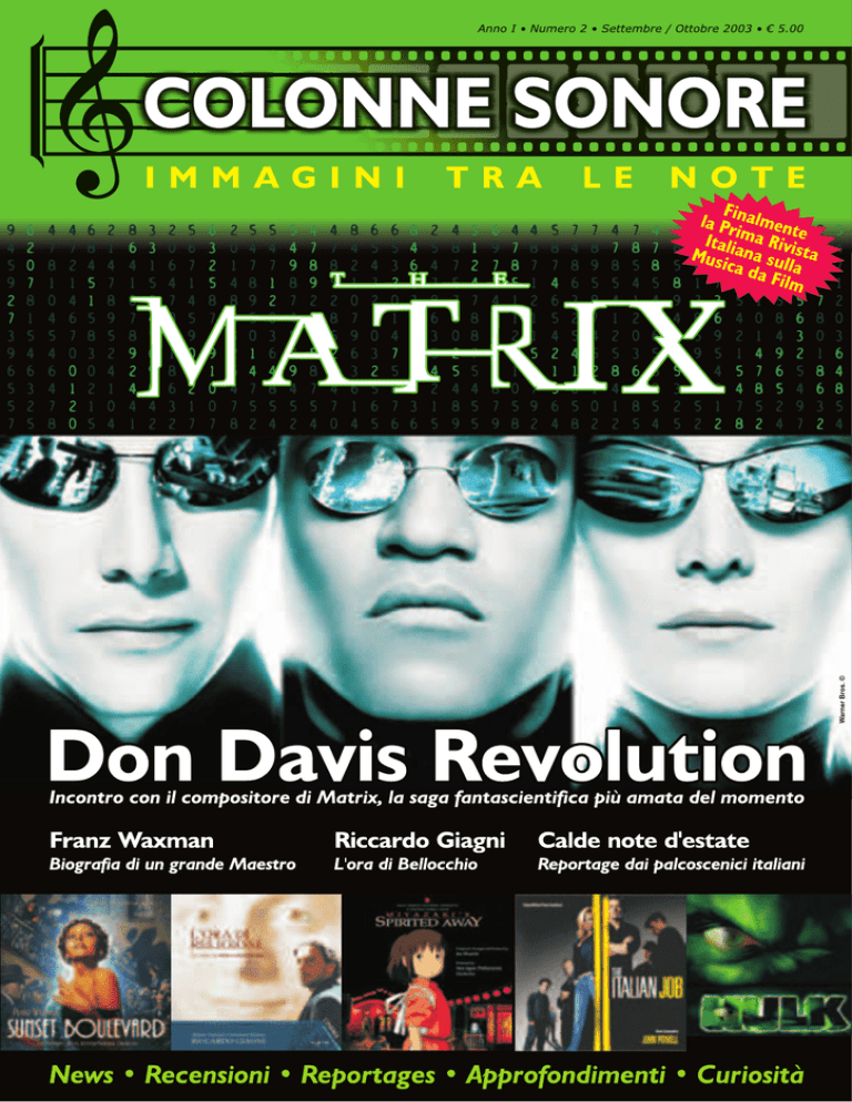 Sommario In questo numero • …e due! ...................................................................... 4 di Anna Maria Asero • Novità dal mondo della musica da film: ............ 6 case discografiche ed eventi di Fabio D’Italia & Pietro Rustichelli • Don Davis Revolution: ........................................... 8 incontro con il compositore di Matrix di Jeff Bond • La matrice torna alla carica: ................................. 12 recensione di Matrix Reloaded di Gianni Bergamino • Berlino-Hollywood, solo andata: ......................... 16 biografia del compositore Franz Waxman / Varèse Sarabande film classics Anno Primo, Numero 2 •Settembre / Ottobre 2003 • Aux armes Musiciens!: .............................................. 34 l’inchiesta sul possibile sindacato dei compositori in Italia di Gabrielle Lucantonio • L’arte del comporre: ............................................... 35 recensione libro sulla musica da film di Massimo Privitera • Coming soon!: ............................................................ 36 la musica dei trailer - 2ª parte di Stefano Sorice • L’età dell’oro a S. Cecilia: ....................................... 38 intervista al direttore d’orchestra Tim Brock di Maurizio Caschetto, Massimo Privitera & Pietro Rustichelli di Alessio Coatto & Gianni Bergamino • Ritorno a Manderley: ............................................. 18 recensione di Rebecca / Quelle note misteriose / Matthew Joseph Peak, l’arte dell’istante di Alessio Coatto & Pietro Rustichelli • Nuovi bagliori di un crepuscolo: .......................... 20 recensione di Sunset Boulevard di Gianni Bergamino • Reportage dai concerti: ......................................... 40 Il concerto al "Parco della musica" di Roma / Note stellari all’Auditorium di Milano di Giuliano Tomassacci & Maurizio Caschetto • Cinema da Ascoltare: ............................................. 42 Prima parte del dossier su musica e cinema di Gianni Bergamino • Un filosofo musicista: .............................................. 22 intervista al compositore Riccardo Giagni / recensione de L’ora di religione di Gabrielle Lucantonio • Filmografie: ................................................................ 45 filmografie essenziali di Don Davis e Franz Waxman • Recensioni: ................................................................. 24 Analisi approfondite di cd vecchi e nuovi • Chi Comporrà Cosa: ............................................... 46 Lavori in corso nel mondo della musica da film • FictioNote: ................................................................. 33 Recensioni di colonne sonore per le produzioni televisive • Director’s Cut: ....................................................... 47 Do you speak music? di Massimo Privitera & Alessio Coatto di Pietro Rustichelli Le altre recensioni • Hulk ........................................................................... 24 di Maurizio Caschetto • Varèse Sarabande 25th Anniversary ................ 25 di Massimo Privitera • Spirited Away ........................................................... 26 di Maurizio Caschetto • The Omen ................................................................ 27 di Giuliano Tomassacci • Far from Heaven .................................................... 28 di Maurizio Caschetto • Opera & Demoni ................................................... 29 di Gabrielle Lucantonio • Goldfinger / Thunderball / You Only Live ......... 30 Twice / On Her Majesty's Secret Service / Diamonds Are Forever di Alessio Coatto • The Italian Job ......................................................... 31 di Giuliano Tomassacci • Malombra / Bianco, rosso e Morricone ......... 32 di Massimo Privitera • Ferrari / Il Commissario / Montalbano ............ 33 di Massimo Privitera e Alessio Coatto • The Cardinal: the classic film music of ............. 41 Jerome Moross di Pietro Rustichelli 3 Re d a z i o n a l e ...e due! La parola al Direttore Anche questa è fatta. A fatica, ma con tanta soddisfazione, siamo riusciti a pubblicare il secondo numero di “Colonne Sonore - Immagini tra le note”. In tanti ci avete inviato attestati di merito e qualche critica. Stiamo crescendo e quindi, si spera, migliorando. Aumenta la squadra di eccellenti collaboratori che contribuiscono ad una maggiore varietà di toni, voci e pareri: ciò non può che costituire un pregio. Inoltre abbiamo iniziato un rapporto con i lettori e gli enti interessati che, come testimoniano le nuove rubriche che prendono il via, non può che essere proficuo. Questo numero, confezionato sotto la canicola agostana, è fitto di rubriche e recensioni, dal recentissimo Matrix Reloaded di Don Davis ai classici Sunset Boulevard e Rebecca di Franz Waxman. Dove trovate “Colonne Sonore” 4 Proprio al grande compositore tedesco Waxman sono state dedicate alcune pagine di questo secondo numero. Non mancano le interviste e gli incontri con i grandi compositori nostrani e stranieri, come Riccardo Giagni e Don Davis. Di rilievo anche la chiacchierata con il direttore d’orchestra Tim Brock, dopo il suo concerto di Roma con un repertorio del tutto eccezionale: la musica da film. Da non perdere l’appassionante dossier su “Cinema da ascoltare”, l’interessante inchiesta sull’idea di creare un sindacato che tuteli i compositori italiani, come quello appena nato in Francia... e tante altre novità. A voi cari lettori la nostra rivista!!! Anna Maria Asero MILANO BLOODBUSTER SNC Via P. Castaldi 30 20124 - MILANO DISCO CLUB MM Cordusio, 20123 - MILANO Tel. 02.876067 CINEMA ANTEO Libreria del Cinema Via Milazzo 9 - 20121 MILANO Tel. 02.6597732 LA BORSA DEL FUMETTO Via Lecco 16 20124 - MILANO Tel. 02.29513883 DEFCON ZERO Viale Marelli 19 SESTO SAN GIOVANNI (MI) Tel. 02.24412133 STRADIVARIUS Via Pecchio 1 20100 - MILANO Tel. 02.29400600 TORINO WIDESCREEN Via San Secondo, 55 - 10128 T