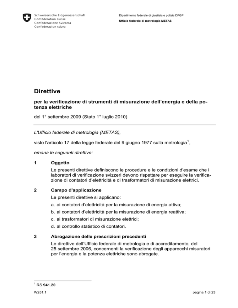 Dipartimento federale di giustizia e polizia DFGP Ufficio federale di metrologia METAS Direttive per la verificazione di strumenti di misurazione dell’energia e della potenza elettriche del 1° settembre 2009 (Stato 1° luglio 2010) L'Ufficio federale di metrologia (METAS), visto l'articolo 17 della legge federale del 9 giugno 1977 sulla metrologia 1 , emana le seguenti direttive: 1 Oggetto Le presenti direttive definiscono le procedure e le condizioni d’esame che i laboratori di verificazione svizzeri devono rispettare per eseguire la verificazione di contatori d’elettricità e di trasformatori di misurazione elettrici. 2 Campo d'applicazione Le presenti direttive si applicano: a. ai contatori d’elettricità per la misurazione di energia attiva; b. ai contatori d’elettricità per la misurazione di energia reattiva; c. ai trasformatori di misurazione elettrici; d. al controllo statistico di contatori. 3 Abrogazione delle prescrizioni precedenti Le direttive dell’Ufficio federale di metrologia e di accreditamento, del 25 settembre 2006, concernenti la verificazione degli apparecchi misuratori per l’energia e la potenza elettriche sono abrogate. 1 RS 941.20 W251.1 pagina 1 di 23 Strumenti di misurazione dell'energia e della potenza elettriche 4 Entrata in vigore Le presenti direttive entrano in vigore il 1° settembre 2009. Ufficio federale di metrologia METAS Dott. Christian Bock Direttore pagina 2 di 23 W251.1 Strumenti di misurazione dell'energia e della potenza elettriche Allegato Indice Pagina 1 1.1 1.2 In generale ..................................................................................................... 4 Principi ............................................................................................................ 4 Abbreviazioni .................................................................................................. 4 2 2.1 2.2 2.2.1 2.2.2 2.2.3 2.3 2.3.1 2.3.2 2.3.3 2.4 2.5 2.6 Contatori di energia e di potenza elettriche ............................................... 6 Requisiti degli apparecchi di verificazione e riferimenti; condizioni d’esame .. 6 Contatori a induzione ...................................................................................... 6 In generale ...................................................................................................... 6 Contatori d’energia attiva a induzione............................................................. 7 Contatori d’energia reattiva a induzione ......................................................... 8 Contatori elettronici ......................................................................................... 9 In generale ...................................................................................................... 9 Contatori d’energia attiva .............................................................................. 10 Contatori d’energia reattiva ........................................................................... 11 Contatori elettronici di massima e contatori elettronici emettori .................... 11 Moduli elettronici di tariffazione .................................................................... 12 Esami dell’isolamento ................................................................................... 12 3 3.1 3.2 3.3 3.4 3.5 Trasformatori di misurazione .................................................................... 14 Requisiti degli apparecchi di verificazione e riferimenti; condizioni d’esame 14 Trasformatori di corrente .............................................................................. 15 Trasformatori di tensione .............................................................................. 16 Trasformatori di tensione capacitivi .............................................................. 17 Trasformatori di misurazione combinati ........................................................ 17 4 4.1 4.2 Marcatura e piombatura di strumenti di misurazione .............................. 18 Marcatura ..................................................................................................... 18 Piombatura ................................................................................................... 18 5 5.1 5.2 5.3 5.4 5.5 5.6 5.7 Controllo statistico ..................................................................................... 19 Designazione dei lotti.................................................................................... 19 Banca dati di riferimento ............................................................................... 19 Annuncio di nuovi lotti per la procedura di campionature ............................. 19 Mutazione di lotti esistenti ............................................................................. 20 Sorteggio e controllo dei contatori del campione .......................................... 22 Verificazione e comunicazione dei risultati ................................................... 22 Comunicazione dei risultati al METAS .......................................................... 23 W251.1 pagina 3 di 23 Strumenti di misurazione dell'energia e della potenza elettriche 1 In generale 1.1 Principi Gli strumenti di misurazione presentati per la verificazione devono soddisfare le esigenze dell’ordinanza del 15 febbraio 2006 2 sugli strumenti di misurazione oppure appartenere a un tipo ammesso secondo il diritto svizzero e portare la relativa marcatura. La verificazione va eseguita secondo i punti d’esame definiti nelle presenti direttive. Gli errori massimi tollerati definiti per la classe di accuratezza cui appartiene lo strumento di misurazione devono essere rispettati su tutti i punti. Gli errori massimi tollerati non devono essere sfruttati sistematicamente in modo unilaterale; ciò significa che, nei limiti del fattibile dal punto di vista tecnico e del dispendio di tempo, gli errori dovrebbero essere distribuiti simmetricamente