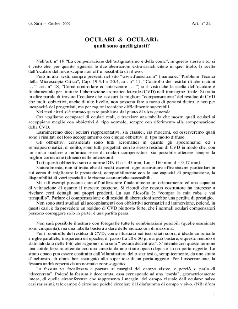 G. Sini - Ottobre 2009 Art. n° 22 OCULARI & OCULARI: quali sono quelli giusti? Nell’art. n° 19 “La compensazione dell’astigmatismo e della coma”, in questo stesso sito, si è visto che, per quanto riguarda le due aberrazioni extra-assiali citate in quel titolo, la scelta dell’oculare del microscopio non offre possibilità di rilievo. Però in altri testi, sempre presenti nel sito “www.funsci.com” (manuale: “Problemi Tecnici della Microscopia Ottica”, Cap. 19.3.1 e 20.4, art. n° 11, “Controllo dei residui di aberrazioni … ”, art. n° 18, “Come controllare ed intervenire … ”) si è visto che la scelta dell’oculare è fondamentale per limitare l’aberrazione cromatica laterale (CVD) nell’immagine finale. Si tratta in altre parole di trovare l’oculare che assicuri la migliore “compensazione” del residuo di CVD che molti obbiettivi, anche di alto livello, non possono fare a meno di portarsi dietro, e non per incapacità dei progettisti, ma per ragioni tecniche difficilmente superabili. Nei testi citati si è trattato questo problema dal punto di vista generale. Ora vogliamo occuparci di oculari reali, e tracciare una tabella che mostri quali oculari si accoppiano meglio con obbiettivi di tipo normale, sempre con riferimento alla compensazione della CVD. Esamineremo dieci oculari rappresentativi, sia classici, sia moderni, ed osserveremo quali sono i risultati del loro accoppiamento con cinque obbiettivi di tipo molto diffuso. Gli obbiettivi considerati sono tutti acromatici in quanto gli apocromatici ed i semiapocromatici, di solito, sono tutti progettati con lo stesso residuo di CVD in modo che, con un unico oculare o un’unica serie di oculari compensatori, sia possibile ottenere sempre la miglior correzione (almeno nelle intenzioni). Tutti questi obbiettivi sono a norme DIN (Lo = 45 mm; Lm = 160 mm; d = 0,17 mm). Naturalmente, non si tratta che di pochi esempi: ogni costruttore offre sistemi particolari in cui cerca di migliorare le prestazioni, compatibilmente con le sue capacità di progettazione, la disponibilità di vetri speciali e le risorse economiche accessibili. Ma tali esempi possono dare all’utilizzatore finale almeno un orientamento ed una capacità di valutazione di quanto il mercato propone. Si ricordi che nessun costruttore ha interesse a rivelare certi dettagli sui propri prodotti. La sua filosofia è: “compra la mia roba e vai tranquillo”. Parlare di compensazione o di residui di aberrazioni sarebbe una perdita di prestigio. Non sono stati studiati gli accoppiamenti con obbiettivi acromatici ad immersione, poiché, in questi casi, è da prevedere un residuo di CVD piuttosto forte, che i normali oculari compensatori possono correggere solo in parte: è una partita persa. Non sarà possibile illustrare con fotografie tutte le combinazioni possibili (quelle esaminate sono cinquanta), ma una tabella basterà a dare delle indicazioni di massima. Per il controllo del residuo di CVD, come illustrato nei testi citati sopra, è ideale un reticolo a righe parallele, trasparenti ed opache, di passo fra 20 e 50 μ, ma può bastare, e questo metodo è stato adottato nelle foto che seguono, una sola “fessura decentrata”. S’intende con questo termine una sottile fessura ottenuta con una lametta da uno strato opaco deposto su un porta-oggetto. Lo strato opaco può essere costituito dall’alluminatura dello star test o, semplicemente, da uno strato d’inchiostro di china ben asciugato alla superficie di un porta-oggetto. Per l’osservazione, la fessura andrà coperta da un normale copri-oggetto. La fessura va focalizzata e portata ai margini del campo visivo, e perciò si parla di “decentrata”. Poiché la fessura è decentrata, essa corrisponde ad una “corda”, geometricamente intesa, di quella circonferenza che rappresenta i margini del campo visuale dell’oculare: salvo casi rarissimi, tale campo è circolare poiché circolare è il diaframma di campo visivo. (NB: d’ora 1 in poi tale diaframma sarà indicato brevemente con la sigla “DV”). Nelle foto che seguono si è evitato di modificare elettronicamente la dominante di colore o la saturazione, al fine di rispecchiare la situazione reale delle bordature colorate. In queste foto viene presentata, per facilitarne l’analisi, solo la porzione superiore dell’immagine della “fessura decentrata”. In alto, tale immagine mostra un segmento obliquo che corrisponde ad una piccola parte del margine del campo visuale dell’oculare: il resto di tale margine è invisibile poiché il “fondo” dell’immagine è scuro salvo, appunto, in corrispondenza della fessura. L’osservazione di quel segmento obliquo, o del confine del DV in generale, è interessante poiché consente di solito di discriminare un oculare acromatico da un compensatore: −− negli oculari acromatici positivi l’orlo del DV deve essere privo di colori, un bianco-nero netto (figg. 2 e 5); infatti, il DV si trova SOTTO il pacco lenti e pertanto, dovendo tali oculari essere corretti da CVD, l’immagine che essi danno di tale diaframma deve essere acromatica, senza colori; −− negli oculari acromatici negativi, data la presenza della “lente di campo” sotto il DV, cioè sotto l’immagine intermedia, il diaframma stesso viene osservato solo attraverso la lente “oculare”, la lente superiore dell’oculare; nella ricetta di Huygens ed in quelle derivate, la lente oculare è semplice e pertanto affetta da CVD sottocorretta: l’orlo del DV apparirà pertanto accompagnato da una frangia blu1 (“DV” in fig. 1); (2603) Fig. 1 −− negli oculari compensatori invece, essendo introdotto ad arte un residuo di CVD sovracorretta, per compensare il residuo sottocorretto dell’obbiettivo, l’orlo del DV sarà colorato di rosso-arancio (fig. 3 e 4). Cominciamo con l’illustrare con quattro fotografie solo i casi più tipici: −− un oculare acromatico con un obbiettivo acromatico debole sicuram