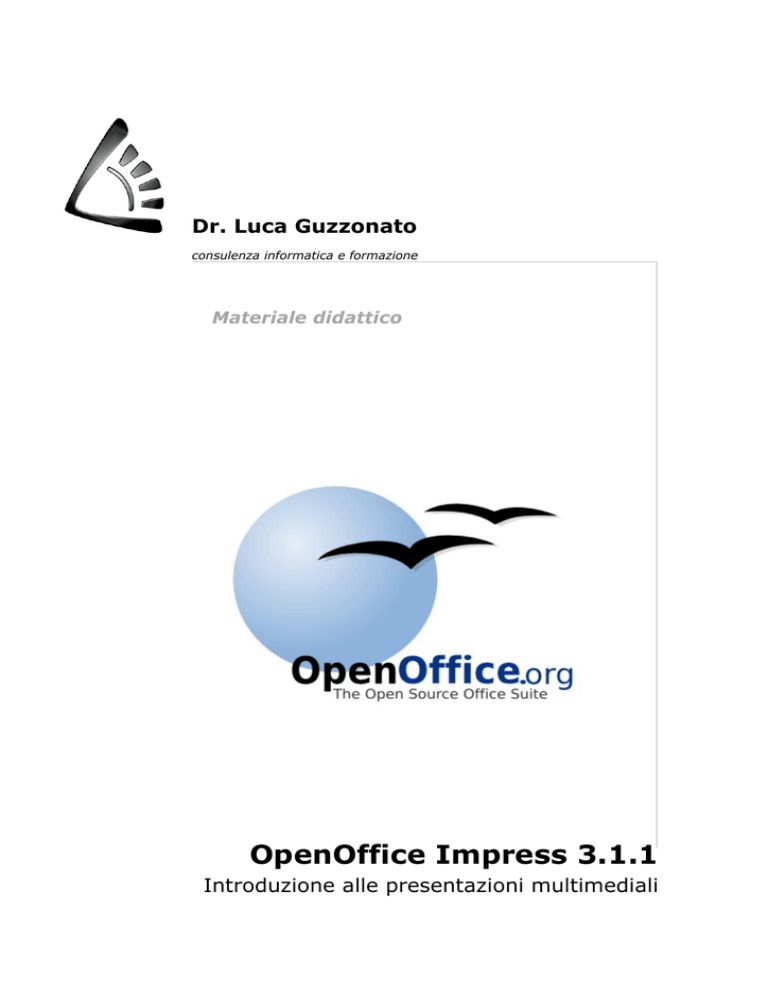 Dr. Luca Guzzonato consulenza informatica e formazione Materiale didattico OpenOffice Impress 3.1.1 Introduzione alle presentazioni multimediali Dr. Luca Guzzonato OpenOffice Impress 3.1.1 SOMMARIO SOMMARIO 2 INTRODUZIONE 3 UTILIZZO DEGLI ELEMENTI GRAFICI 3 FINALITÀ DEL LAVORO CON IMPRESS 4 Formati dei file multimediali 5 INIZIAMO 5 PRESENTAZIONE DEL PROGRAMMA 6 Lo schema della presentazione Scegliere il tipo di visualizzazione LAVORARE CON LE DIAPOSITIVE Gli oggetti DISEGNI E IMMAGINI NELLE DIAPOSITIVE 6 6 7 7 8 I Disegni e le Forme Inserire il testo all’interno di una forma FontWork Colori ed effetti di riempimento Effetti tridimensionali Il trattamento delle Immagini La barra degli strumenti Immagine Inserimento di grafici Vincolare il movimento di un oggetto Usare griglia, le guide e righello 8 8 9 9 10 10 10 11 11 12 PREPARARE LA PRESENTAZIONE 12 Impostare sfondo, stile e struttura alle diapositive Collegamenti ipertestuali Creare Oggetti Interattivi ANIMAZIONI Le transizioni tra le diapositive Inserire di file audio Inserire un file video Inserire un filmato LA STAMPA dr. luca guzzonato – consulenza informatica e formazione – info@lucaguzzonato.it – http://www.lucaguzzonato.it 12 13 13 14 15 16 16 16 17 2 Dr. Luca Guzzonato OpenOffice Impress 3.1.1 INTRODUZIONE Impress fa parte della famiglia di programmi OpenOffice e rappresenta il corrispettivo di PowerPoint della Microsoft, quindi un programma che opera nell’ambito della grafica ad oggetti e che consente di costruire presentazioni che veicolano informazioni su prodotti, servizi o altro, arricchite da elementi multimediali quali filmati, suoni, animazioni e transizioni. Tali presentazioni possono essere proiettate su uno schermo o masterizzate su supporti magneto-ottici quali cd e dvd per poter essere poi visualizzate sul video del proprio computer. Le aziende e i professionisti utilizzano Impress per comporre documenti multimediali che presentino i loro prodotti o la loro attività. Impress è un software creato da un gruppo di persone che operano nel mondo dell’Open Source, quindi non ha costi di licenza e può essere liberamente utilizzato da chiunque. I creatori mantengono la proprietà intellettuale del software ma concedono l’utilizzo dello stesso senza richiedere del denaro. Questo è uno dei principali motivi per i quali la suite OpenOffice si sta diffondendo in modo eclatante e risquote apprezzamenti sia nel mondo Mac che in quello Windows, per le sue potenti caratteristiche operative e per le potenzialità che offre. Ecco alcuni esempi di possibile utilizzo di Impress: - illustrare una linea di nuovi prodotti ai venditori - proporre una nuova strategia aziendale - presentare un nuovo piano di marketing - comunicare con chiarezza risultati finanziari - agevolare lo svolgimento di una riunione - presentare i prodotti o i servizi offerti dall’azienda in una fiera per mezzo di un computer - creare un sito Web su Internet in grado di illustrare in maniera interattiva alcune offerte dell’azienda Illustrando la presentazione al computer, eventualmente collegato ad uno schermo televisivo o a un videoproiettore, è anche possibile realizzare animazioni grafiche o sfruttare le potenzialità interattive del programma. I testi, come pure le immagini e i grafici possono apparire e dissolversi, scorrere e poi cambiare colore utilizzando alcune proprietà delle animazioni televisive; nelle presentazioni possono essere inseriti dei video clip digitalizzati; le presentazioni possono essere corredate di rumori, suoni, brani musicali o commenti parlati. È anche possibile fornire lo schermo di pulsanti virtuali che consentono all’utente di richiamare una nota, di attivare animazioni, di passare ad un altro argomento, ecc. con il solo passaggio del mouse al di sopra del tasto o con un clic. UTILIZZO DEGLI ELEME NTI GRAFICI Impress è innanzitutto un programma di grafica e quindi ci soffermiamo innanzitutto su uno degli elementi principali che compongono le presentazioni di Impress: la grafica. Il settore della grafica è molto vasto, richiede e comprende competenze approfondite e piuttosto specialistiche. Si intende fornire alcuni concetti indispensabili da tenere in considerazione quando si opera con Impress. La grafica si può suddividere essenzialmente in 2 grandi categorie: la grafica pittorica, bitmap o raster e la grafica ad oggetti o vettoriale. Quali sono le principali differenze tra le due tipologie? dr. luca guzzonato – consulenza informatica e formazione – info@lucaguzzonato.it – http://www.lucaguzzonato.it 3 Dr. Luca Guzzonato GRAFICA PITTORICA = BITMAP o RASTER OpenOffice Impress 3.1.1 GRAFICA AD OGGETTI = VETTORIALE L’immagine è formata da punti ognuno dei quali ha delle coordinate cartesiane. Il punto si trova in una posizione ben precisa e viene chiamato PIXEL L’immagine è formata da oggetti per ognuno dei quali viene memorizzato: - colore e spessore bordo - colore di riempimento - coordinate dei vertici A ciascun pixel di un’immagine vengono assegnati una posizione specifica (coordinate x, y di posizionamento, come su un piano cartesiano) e un valore di colore Le immagini consistono di linee curve definite da oggetti matematici chiamati VETTORI, da cui il termine “vettoriale” I vettori descrivono le immagini in base alle loro caratteristiche geometriche Es.: un cerchio di 3 cm. situato in fondo al foglio, Es.: il software crea un cerchio di 3 cm è rappresentato come un insieme di pixel basandosi sulla sua forma e sulle sue dimensioni presenti in quella precisa posizione e colorati in precise modo da far apparire un cerchio. Le immagini sono rappresentate da un numero fisso di pixel con eventuali gradazioni di forme e colore. Se ridimensionate quindi divengono dentellate e sfocate. Le immagini non sono definite da un numero fisso di pixel. Se ridimensionate quindi risultano sempre chiare e nitide su qualsiasi periferica di output Le immagini bitmap vengono utilizzate principalmente pe