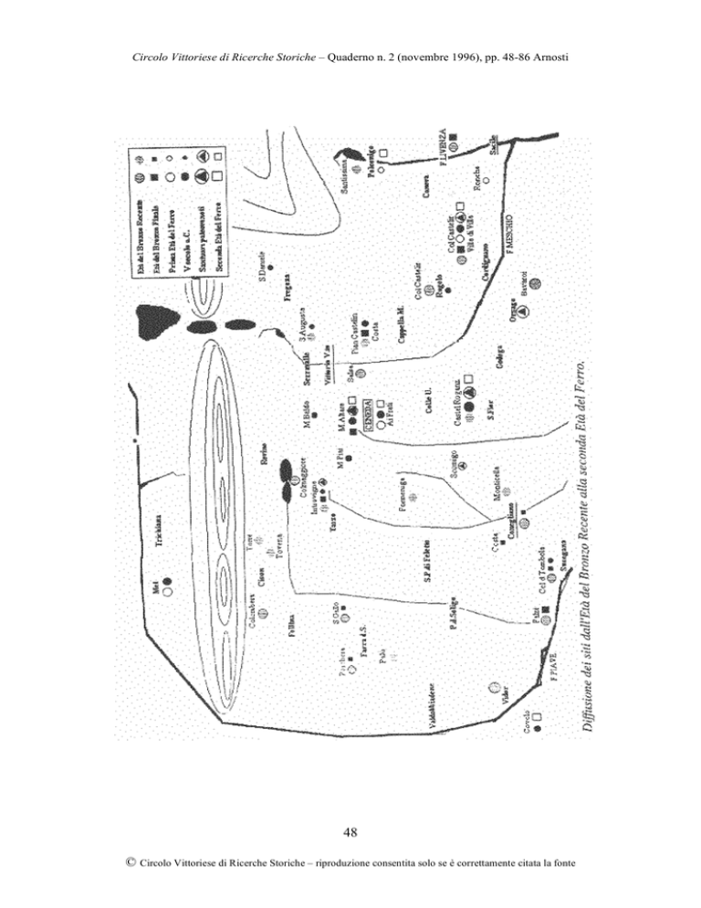 Circolo Vittoriese di Ricerche Storiche – Quaderno n. 2 (novembre 1996), pp. 48-86 Arnosti 48 © Circolo Vittoriese di Ricerche Storiche – riproduzione consentita solo se è correttamente citata la fonte Circolo Vittoriese di Ricerche Storiche – Quaderno n. 2 (novembre 1996), pp. 48-86 Arnosti GIORGIO ARNOSTI L'ETÀ DEL FERRO NELL'ANTICO CENEDESE (appunti dalla fine dell'Età del Bronzo alla romanizzazione) CRISI INSEDIATIVA. Verso il XII sec. a.C., alla fine della fase detta Recente dell 'Età del Bronzo, si constata un deciso declino, talvolta un completo abbandono, di tutti gli insediamenti perilacustri e pedecollinari, di fondo valle o di pianura. Si ritiene che la scomparsa dei siti di pianura e perilacustri sia dovuta in parte al peggioramento climatico del periodo Sub-Boreale evolutosi in senso umido verso la fine dell'Età del Bronzo (BALIST A, 1980). Così avrebbe chiuso la sua continuità il villaggio sulle rive dei laghi di Revine, a causa dell'innalzamento eccessivo del livello di sponda. Anche gli insediamenti di pianura impaludati, come quello di Bavaroi nel Palù di Orsago, vengono abbandonati; ritorneranno ad essere estesamente antropizzati solo in seguito alle bonifiche ed alle sistemazioni agrarie di epoca romana. Con le conoscenze attuali non si comprende invece la logica che ha portato all'abbandono di alcuni grossi siti pedecollinari, che non dovevano risentire eccessivamente del peggioramento climatico. È il caso degli insediamenti di Conegliano (area Casa Cima) e di Colombera di Valmareno, che tra l'altro non presentano alcuna documentazione archeologica per tutta la successiva Età del Ferro. Questo fenomeno, per la documentazione in nostro possesso, che deriva in gran parte da ricerche e dall'archivio del Gruppo Archeologico del Cenedese, sembra interessare vasti comprensori. A parte la zona di Colfosco (Susegana), non abbiamo la minima documentazione di reperti dell'età del Ferro per tutto il Coneglianese di pianura e di collina, neppure per il Quartier del Piave, ne per la Valmareno. Eppure in queste ampie aree ci sono notevoli testimonianze di frequentazione quantomeno dal Neolitico fino alla fine dell'Età del Bronzo. La 49 © Circolo Vittoriese di Ricerche Storiche – riproduzione consentita solo se è correttamente citata la fonte Circolo Vittoriese di Ricerche Storiche – Quaderno n. 2 (novembre 1996), pp. 48-86 Arnosti documentazione per l'Età del Ferro, tra Piave e Livenza, ci risulta concentrata nella zona di Colfosco, come si diceva, e, massicciamente, in tutto l'ampio catino morenico del vittoriese, tra Cordignano, Castel Roganzuolo, Ceneda e Tarzo. Tornando ai due siti del Bronzo Recente di Conegliano e di Colombera, neppure sembra realistico ritenere che siano stati abbandonati in seguito all' eccessivo sfruttamento dei suoli durante l'età del bronzo, ed al conseguente dilavamento delle coperture sciolte. Tanto più che c'era eventualmente la possibilità di utilizzare altre estese aree nei dintorni. Più convincente appare la considerazione che il processo di abbandono dei siti non protetti sia stato accelerato da insistenti infiltrazioni di popoli da oriente, come già era avvenuto nell'Eneolitico e prima ancora nel Neolitico, ovvero da Sud. I nuovi arrivati avrebbero sconvolto gli equilibri preesistenti e drenato fortemente le risorse delle popolazioni autoctone. La crisi degli insediamenti e il collasso economico in pianura hanno portato, nella migliore delle ipotesi, al ritiro delle popolazioni locali o verso le valli interne delle Alpi o su luoghi collinari elevati. Tale crisi ha pure portato all'abbandono della frequentazione di numerosi siti connessi con la transumanza stagionale ad ampio raggio. La necessità di occupare luoghi facilmente difendibili nella fase Finale dell'Età del Bronzo, viene constatata dalla sola sopravvivenza nelle nostre zone di insediamenti protetti in altura. Nell'Alto Cenedese, come località che hanno restituito reperti e strutture di abitati dell'Età del Bronzo Finale, ricordiamo il Col Castelir sopra Villa di Villa, il Pian Castelin di Costa di Vittorio Veneto, il Monte Altare sopra Ceneda, Introvigne di Tarzo (che sembra raccogliere l'eredità del sito ai Laghi di Revine), il colle di S. Gallo e la Porchera di Farra di Soligo. Questi siti sono tutti su sommità di collina, in posizione strategica a controllo della pianura, e con ampie vie di fuga verso le alture circostanti in caso di necessità. Si registra anche che quasi tutti i siti elencati non lamentano alcuna interruzione con precedenti frequentazioni nell'età del Bronzo Medio e Recente, che erano però di scarsa consistenza, oppure di frequentazione stagionale. Solo sul M. Altare si ha lo sviluppo di un nuovo insediamento attorno all'XI secolo, e questo potrebbe essere un dato importante nell'evoluzione dell' occupazione del territorio. Fatti i conti, i siti documentati, della fase evo Iuta del Bronzo Finale, sono in numero drasticamente ridotto rispetto al periodo precedente. Sono quasi tutti di modeste dimensioni, e restituiscono reperti generalmente in esigue quantità (la documentazione archeologica deriva dalle ormai ventennali ricerche del Gruppo Archeologico del Cenedese; i numerosi reperti sono depositati al Museo del Cenedese a Serravalle). Un 'unica dissonanza in questo contesto è il Col Castelir di Villa di Villa, che fa registrare una massiccia espansione insediativa tra l'XI ed il IX sec. a.C., proponendosi come centro propulsore nella colonizzazione del territorio nel periodo protostorico successivo. Un'altra constatazione interessante, analizzando la tipologia della ceramica 50 © Circolo Vittoriese di Ricerche Storiche – riproduzione consentita solo se è correttamente citata la fonte Circolo Vittoriese di Ricerche Storiche – Quaderno n. 2 (novembre 1996), pp. 48-86 Arnosti raccolta, evidenzia che nei vari insediamenti sopra elencati la prevalenza di certe forme ceramiche, o di sintassi decorative, piuttosto che altre,