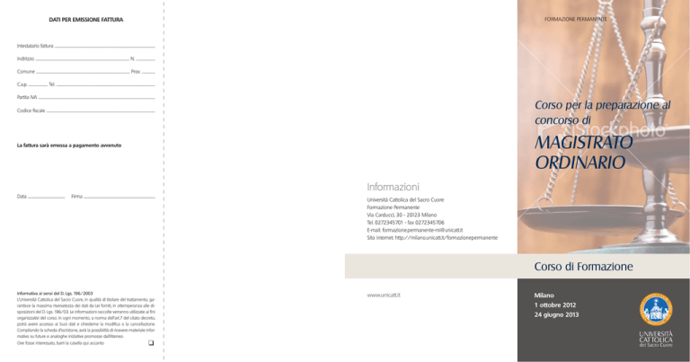 FFO OR RM MAZ ZIO ONE PERMAN NENT NE NTE DATI PER EMISSIONE FATTURA Intestatario fattura ........................................................................................................................................................................................ Indirizzo ............................................................................................................................................................................ N. ................................... Comune ............................................................................................................................................................................ Prov. ........................ C.a.p. ................................... Tel. ..................................................................................................................................................................................... Partita IVA ...................................................................................................................................................................................................................... Corso per la preparazione al concorso di Codice fiscale ....................................................................................................................................................................................................... MAGISTRATO ORDINARIO La fattura sarà emessa a pagamento avvenuto Informazioni Data .................................................................... Firma ................................................................................................................................... Università Cattolica del Sacro Cuore Formazione Permanente Via Carducci, 30 - 20123 Milano Tel. 0272345701 - fax 0272345706 E-mail: formazione.permanente-mi@unicatt.it Sito internet: http://milano.unicatt.it/formazionepermanente Corso di Formazione Informativa ai sensi del D. Lgs. 196/2003 L’Università Cattolica del Sacro Cuore, in qualità di titolare del trattamento, garantisce la massima riservatezza dei dati da Lei forniti, in ottemperanza alle disposizioni del D. Lgs. 196/03. Le informazioni raccolte verranno utilizzate ai fini organizzativi del corso. In ogni momento, a norma dell’art.7 del citato decreto, potrà avere accesso ai Suoi dati e chiederne la modifica o la cancellazione. Compilando la scheda d’iscrizione, avrà la possibilità di ricevere materiale informativo su future e analoghe iniziative promosse dall’Ateneo. Ove fosse interessato, barri la casella qui accanto v www.unicatt.it Milano 1 ottobre 2012 24 giugno 2013 Presentazione I docenti dei corsi, incaricati per le singole materie, sono stati Per gli iscritti all’Associazione “Ludovico Necchi” e all’Associazione scelti per la loro specifica caratteristica di unire alla rigorosa Amici dell’Università Cattolica la quota di partecipazione è fissata La Formazione Permanente dell’Università Cattolica del Sacro preparazione scientifica anche un’aggiornata competenza in € 1.260,00 + IVA 21% (€ 1.524,60). Cuore organizza anche quest’anno il corso per la preparazione professionale nel campo giudiziario e forense. Per chi avesse già frequentato il corso per la preparazione al al concorso per l’accesso alla magistratura ordinaria. UNIVERSITÀ CATTOLICA DEL SACRO CUORE Corso di Formazione Corso per la preparazione al concorso per MAGISTRATO ORDINARIO concorso per Magistrato ordinario negli anni precedenti, oppure chi è iscritto al secondo anno della scuola di specializzazione N.B. Si avverte che la frequenza a tale corso non è equiparata ai titoli previsti per legge per la partecipazione al concorso. Per i requisiti di partecipazione al concorso si può consultare il sito www.giustizia.it. Calendario del Corso 1 ottobre 2012 - 24 giugno 2013 lunedì dalle ore 15.00 alle ore 20.00 Scheda di iscrizione per le professioni legali dell’Università Cattolica, la quota di partecipazione è fissata in € 800,00 + IVA 21% (€ 968,00). Da consegnare o inviare a: Università Cattolica del Sacro Cuore Formazione Permanente Via Carducci, 30 - 20123 Milano - fax 0272345706 E’ possibile iscriversi online collegandosi al link: http://apps.unicatt.it/formazione_permanente/milano.asp Il corso persegue la duplice finalità di fornire, da un lato, un adeguato approfondimento degli istituti fondamentali di ciascuna materia, con gli opportuni collegamenti interdisciplinari, e, dall’altro, di riservare particolare attenzione alla giurisprudenza Direzione Scientifica Il versamento può essere effettuato mediante: . assegno bancario o circolare, bancomat o carta di credito prof. Franco Anelli nei seguenti orari: lun. dalle 14.30 alle 16.30; mar. mer. e gio. preparazione della prova scritta. Ordinario di Istituzioni di Diritto Privato nella Facoltà di dalle ore 9.00 alle ore 12.00 e dalle ore 14.30 alle ore16.30; Giurisprudenza dell’Università Cattolica del Sacro Cuore ven. dalle 9.00 alle 12.00; Programma Il corso verte sulle materie oggetto delle prove scritte (diritto . Conto corrente postale n. 15652209, intestato a: Università prof. Giovanni Negri Cattolica del Sacro Cuore - Largo A. Gemelli 1 - 20123 Docente di Diritto Romano nella Facoltà di Giurisprudenza Milano, specificando il titolo del corso e il nominativo del dell’Università Cattolica del Sacro Cuore partecipante sulla causale del versamento; amministrativo, diritto civile, diritto penale) e si articola in lezioni . bonifico bancario intestato a: Università Cattolica del Sacro schematizzazione delle questioni trattate, per consentire al Cuore presso Banca Infrastrutture Innovazione e Sviluppo candidato la redazione dei temi in sede di concorso. Iscrizioni I frequentanti avranno a disposizione, sul sito www.postlauream.it Il corso è a numero chiuso e le iscrizioni saranno accettate (consultabile mediante apposita password che verrà inviata secondo l’ordi