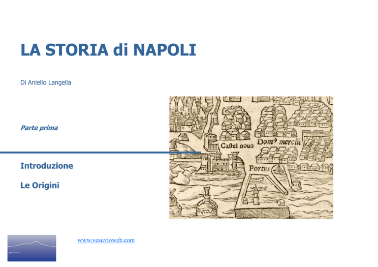 LA STORIA di NAPOLI Di Aniello Langella Parte prima Introduzione Le Origini www.vesuvioweb.com LA STORIA DELLA CITTA’ DI NAPOLI Piano generale del lavoro Origini, storia, leggende Prima parte Introduzione Le Origini della città di Nappoli Seconda parte Roma entra in città Terza parte Napoli diventa Ducato nel nome della libertà e dell’indipendenza Quarta parte Napoli diventa Normanna Quinta parte Il regno di Federico II Sesta parte Carlo d’Angiò re di Napoli Settima parte Napoli e gli Aragona Testo e ricerca di Aniello Langella 2007 © www.vesuvioweb.com 2 Origini, storia, leggende Introduzione Descrivere in breve una città che ha attraversato la storia per giungere fino a noi con un patrimonio culturale di proporzioni immense è davvero un’opera gravosa, difficile e sicuramente complessa. Non si può parlare di un evento o di un monumento se non si passa attraverso il documento, il tramando, l’immagine e Napoli in questo appare ricchissima. Ogni angolo della città, ogni stradina, ogni voce del vicolo può nascondere storia tradizione e cultura. Oggi ancora qui, si possono ritrovare le tracce dell’arcano mistero, della sapiente filosofia Cicladica, delle orme degli antichi popoli che vi abitarono. E’ ancora qui tra le massime espressioni artistiche racchiuse nei traboccanti Musei che si possono leggere le pagine di una storia infinita che affascina e seduce. Uomini illustri vi soggiornarono, regnanti potenti e feroci ebbero la loro dimora tra queste piazze. Qui si cantarono le più belle poesie e si scrissero versi immortali. E tra questi angusti slarghi urbanistici scanditi dal ritmo della centuriazione romana, si svolsero anche delle rivoluzioni, politiche e culturali. Il lettore leggendo queste pagine dovrà avere solo la bontà di comprendere che in genere e nel mondo della comunicazione, la sintesi di un concetto complesso che diventa ancor più articolato e difficile quando concerne un universo culturale infinito qual è la Città di Napoli. Valga quindi il consiglio di aver rimandato a migliore e più dotta bibliografia l’approfondimento delle tematiche trattate. www.vesuvioweb.com 3 Le origini Napoli è una delle città più antiche dell’occidente. Le sue origini possono essere ricondotte al tramando e alla leggenda anche se recenti studi archeologici e storici riportano i fatti ad eventi concreti e reali. Vale la pena tuttavia ricordare tra le tante una leggenda, che forse, colorata dai tempi e dall’estro artistico del popolo, ci risulta oggi gradita e quanto mai aderente alla realtà della città. La leggenda vuole al centro della scena la Sirena Partenope. Quindi il racconto è affidato alla mitologia greca. Il personaggio, che è femminile (e non poteva essere diversamente) è una creatura mitica, affascinante e seducente e per alcuni secoli ebbe le fattezze corporee di un uccello ma dal volto soave di giovane donna. Lei regina del golfo incantato era la padrona e la maestra delle arti, era il simbolo della bellezza e della voluttuosità. Durante l' Alto Medioevo e per i secoli che seguirono, Partenope, subì una trasformazione di sostanza e di anima e da essere evanescente e misterioso assunse le sembianze corporee di un essere che aveva una metà donna e per l'altra metà pesce. La Sirena così acquisì una sua immagine di dominanza sugli elementi della natura, sul palcoscenico geologico della città andando ad esibire il suo cratos tra il mare, la terra ed il cielo. Le origini di Partenope, Sirena fondatrice della città e nume tutelare assieme, possono essere ricondotte a numerose visioni, a numerosi fatti mitologici. Tra i tanti ci pare suggestivo quello che la farebbe provenire dalle piccole Isole de li Galli, dette anche Isole delle Sirene. Questo gruppetto di scogli si trovano di fronte alla costa di Positano. www.vesuvioweb.com 4 La leggenda vuole che su queste isole abitassero queste creature dal canto ammaliante e seducente. Sappiamo ancora che le navi passando davanti a questo scogli, attratti dal canto che galvanizzava i sensi, perdendo il controllo, andavano a schiantarsi, naufragando. Ulisse e il suo viaggio ci raccontano questa storia. Ma Uno scoglio delle Sirene esiste anche a Marina Piccola di Capri. Forse Partenope che era una del coro, spesso passava da uno scoglio all’altro per godersi, sole, mare e passioni. Sembra che un solo uomo scampò ai perigliosi richiami delle Sirene e questi fu proprio il calidus itacense. Fattosi legare all’albero maestro volle ascoltare e volle subire il fascino del richiamo mortale. Ma poi come ci dice il testo passò oltre e superato l’inganno, liberò anche i compagni sturandone le orecchie. Si racconta così che Partenope vinta dallo stratagemma e prostata per non aver condotto l’operazione a buon fine, si sia suicidata e così come lei , fecero anche due delle “colleghe degli scogli fatati”: Ligeia e Leucosia. Questa storia richiama un’altra che ebbe per protagonista Orfeo. I corpi di Ligeia e Leucosia vagarono nel golfo e nessuno ci ha detto dove andarono a finire. Forse Leucosia approdò sull’arenile di San Giovanni a Teduccio, dove esisteva uno scoglio bianco che prese nome proprio da lei. Leucosia, Leucopetra (bianca pietra). Ma del corpo di Partenope nessuna traccia. Vagò sui flutti notti e giorni e poi spinto dal vento e dalle onde andò a poggiarsi sullo scoglio di Megaride. La rupe marina sulla quale più tardi venne edificato il Castel dell’Ovo. Per secoli i popoli antichi e ancora oggi i moderni, sotto il profilo filologico, hanno ricercato i resti mortali della bellissima Sirena tra le fondamenta del Castel dell’Ovo, lungo la collina di Sant’Aniello sede di un’antica necropoli, tra i sotterranei della città. Ma nulla è emerso di concreto. E forse è meglio così. Ricercare il mito è sempre piacevole e stimolante, arricchisce e spesso premia. www.vesuvioweb.com 5 Ma se la commedia mitologica finisce qui, tra balzelli letterari, tramandi e racconti fantasiosi,