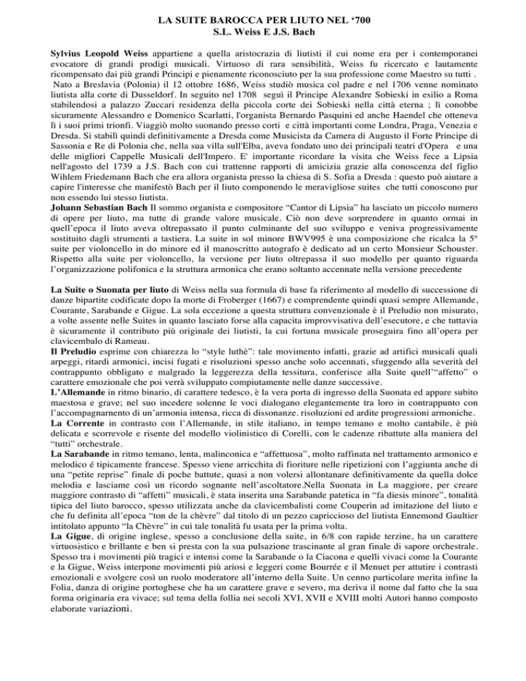 LA SUITE BAROCCA PER LIUTO NEL ‘700 S.L. Weiss E J.S. Bach Sylvius Leopold Weiss appartiene a quella aristocrazia di liutisti il cui nome era per i contemporanei evocatore di grandi prodigi musicali. Virtuoso di rara sensibilità, Weiss fu ricercato e lautamente ricompensato dai più grandi Principi e pienamente riconosciuto per la sua professione come Maestro su tutti . Nato a Breslavia (Polonia) il 12 ottobre 1686, Weiss studiò musica col padre e nel 1706 venne nominato liutista alla corte di Dusseldorf. In seguito nel 1708 seguì il Principe Alexandre Sobieski in esilio a Roma stabilendosi a palazzo Zuccari residenza della piccola corte dei Sobieski nella città eterna ; lì conobbe sicuramente Alessandro e Domenico Scarlatti, l'organista Bernardo Pasquini ed anche Haendel che otteneva lì i suoi primi trionfi. Viaggiò molto suonando presso corti e città importanti come Londra, Praga, Venezia e Dresda. Si stabilì quindi definitivamente a Dresda come Musicista da Camera di Augusto il Forte Principe di Sassonia e Re di Polonia che, nella sua villa sull'Elba, aveva fondato uno dei principali teatri d'Opera e una delle migliori Cappelle Musicali dell'Impero. E' importante ricordare la visita che Weiss fece a Lipsia nell'agosto del 1739 a J.S. Bach con cui trattenne rapporti di amicizia grazie alla conoscenza del figlio Wihlem Friedemann Bach che era allora organista presso la chiesa di S. Sofia a Dresda : questo può aiutare a capire l'interesse che manifestò Bach per il liuto componendo le meravigliose suites che tutti conoscono pur non essendo lui stesso liutista. Johann Sebastian Bach Il sommo organista e compositore “Cantor di Lipsia” ha lasciato un piccolo numero di opere per liuto, ma tutte di grande valore musicale. Ciò non deve sorprendere in quanto ormai in quell’epoca il liuto aveva oltrepassato il punto culminante del suo sviluppo e veniva progressivamente sostituito dagli strumenti a tastiera. La suite in sol minore BWV995 è una composizione che ricalca la 5° suite per violoncello in do minore ed il manoscritto autografo è dedicato ad un certo Monsieur Schouster. Rispetto alla suite per violoncello, la versione per liuto oltrepassa il suo modello per quanto riguarda l’organizzazione polifonica e la struttura armonica che erano soltanto accennate nella versione precedente La Suite o Suonata per liuto di Weiss nella sua formula di base fa riferimento al modello di successione di danze bipartite codificate dopo la morte di Froberger (1667) e comprendente quindi quasi sempre Allemande, Courante, Sarabande e Gigue. La sola eccezione a questa struttura convenzionale è il Preludio non misurato, a volte assente nelle Suites in quanto lasciato forse alla capacita improvvisativa dell’esecutore, e che tuttavia è sicuramente il contributo più originale dei liutisti, la cui fortuna musicale proseguira fino all’opera per clavicembalo di Rameau. Il Preludio esprime con chiarezza lo “style luthè”: tale movimento infatti, grazie ad artifici musicali quali arpeggi, ritardi armonici, incisi fugati e risoluzioni spesso anche solo accennati, sfuggendo alla severità del contrappunto obbligato e malgrado la leggerezza della tessitura, conferisce alla Suite quell’“affetto” o carattere emozionale che poi verrà sviluppato compiutamente nelle danze successive. L’Allemande in ritmo binario, di carattere tedesco, è la vera porta di ingresso della Suonata ed appare subito maestosa e grave; nel suo incedere solenne le voci dialogano elegantemente tra loro in contrappunto con l’accompagnarnento di un’armonia intensa, ricca di dissonanze. risoluzioni ed ardite progressioni armoniche. La Corrente in contrasto con l’Allemande, in stile italiano, in tempo temano e molto cantabile, è più delicata e scorrevole e risente del modello violinistico di Corelli, con le cadenze ribattute alla maniera del “tutti” orchestrale. La Sarabande in ritmo temano, lenta, malinconica e “affettuosa”, molto raffinata nel trattamento armonico e melodico é tipicamente francese. Spesso viene arricchita di fioriture nelle ripetizioni con l’aggiunta anche di una “petite reprise” finale di poche battute, quasi a non volersi allontanare definitivamente da quella dolce melodia e lasciame così un ricordo sognante nell’ascoltatore.Nella Suonata in La maggiore, per creare maggiore contrasto di “affetti” musicali, è stata inserita una Sarabande patetica in “fa diesis minore”, tonalità tipica del liuto barocco, spesso utilizzata anche da clavicembalisti come Couperin ad imitazione del liuto e che fu definita all’epoca “ton de la chèvre” dal titolo di un pezzo capriccioso del liutista Ennemond Gaultier intitolato appunto “la Chèvre” in cui tale tonalità fu usata per la prima volta. La Gigue, di origine inglese, spesso a conclusione della suite, in 6/8 con rapide terzine, ha un carattere virtuosistico e brillante e ben si presta con la sua pulsazione trascinante al gran finale di sapore orchestrale. Spesso tra i movimenti più tragici e intensi come la Sarabande o la Ciacona e quelli vivaci come la Courante e la Gigue, Weiss interpone movimenti più ariosi e leggeri come Bourrée e il Menuet per attutire i contrasti emozionali e svolgere così un ruolo moderatore all’interno della Suite. Un cenno particolare merita infine la Folia, danza di origine portoghese che ha un carattere grave e severo, ma deriva il nome dal fatto che la sua forma originaria era vivace; sul tema della follia nei secoli XVI, XVII e XVIII molti Autori hanno composto elaborate variazioni.