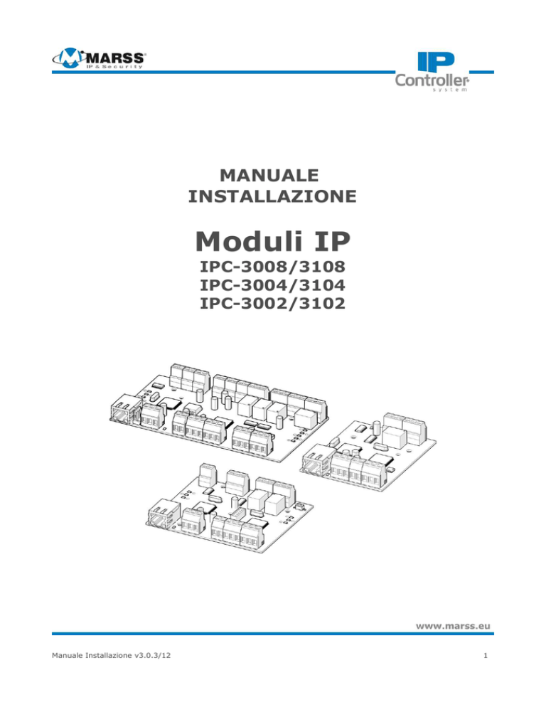 MANUALE INSTALLAZIONE Moduli IP IPC-3008/3108 IPC-3004/3104 IPC-3002/3102 Manuale Installazione v3.0.3/12 1 IP Controller System In questa guida sono contenute le specifiche essenziali di installazione e configurazione dei moduli IP Controller IPC-3008/3108, IPC-3004/3104, IPC-3002/3102. Importante: La Marss Srl si riserva di modificare senza preavviso alcuno il manuale, o parte di esso, al fine di migliorare la qualità, prestazioni e modalità di installazione dei prodotti. Visitare periodicamente il sito www.marss.eu per eventuali aggiornamenti dei prodotti MARSS Manuale Installazione v3.0.3/12 2 Indice generale 1 2 3 4 Avvertenze per la sicurezza...........................................................................................4 Caratteristiche dei dispositivi.........................................................................................5 Caratteristiche e fissaggio dei contenitori........................................................................6 Descrizione dei moduli.................................................................................................8 4.1 Connettori LAN.....................................................................................................8 4.2 Connettori di alimentazione....................................................................................9 4.3 Morsettiera Tamper.............................................................................................10 4.4 Morsettiere Ingressi............................................................................................10 4.5 Morsettiere uscite relè.........................................................................................12 4.6 Morsettiere uscite open collector...........................................................................12 4.6.1 Funzionamento delle uscite Open Collector......................................................13 5 Funzione dei Led di segnalazione.................................................................................14 7 Installazione del modulo WiFi......................................................................................15 7 Ripristino impostazioni di fabbrica................................................................................17 8 Configurazione automatica messaggistica PUSH dopo reset di fabbrica.............................18 9 Ripristino impostazioni WiFi.........................................................................................18 10 Impostazioni di fabbrica del modulo IP Controller.........................................................19 11 Messa in funzione del modulo IP Controller..................................................................20 12 Etichetta MAC Address e password.............................................................................21 13 Dichiarazione di Conformità.......................................................................................22 Note...........................................................................................................................23 Manuale Installazione v3.0.3/12 3 1 Avvertenze per la sicurezza L’installazione del prodotto deve essere eseguita da personale qualificato in conformità alle leggi e normative locali sulla sicurezza e nel rispetto del D.M.37/08 (Decreto ministeriale 22 gennaio 2008 n°37) e successive modifiche. In accordo con la direttiva europea 2004/108/EC (EMC), il prodotto deve essere installato utilizzando dispositivi, cavi ed accessori che consentano di rispettare i requisiti imposti da tale direttiva per le installazioni fisse. Tenere fisicamente separati i fili a bassissima tensione, compresi quelli della batteria, dai fili a tensione. Importante: Solo personale addestrato e autorizzato può intervenire sul prodotto, con lo scopo di effettuare le connessioni descritte nel seguente manuale. In caso di guasto non tentate di riparare il prodotto altrimenti la garanzia non sarà più valida. Si raccomanda di verificare periodicamente il corretto funzionamento del sistema. CONFORMITA ALLE DIRETTIVE EUROPEE Il prodotto e conforme ai requisiti essenziali della direttiva europea 2004/108/EC (Direttiva compatibilità Elettromagnetica - EMC) ed e quindi conforme alle norme armonizzate EN 501304, EN 61000-6-3. Manuale Installazione v3.0.3/12 4 2 Caratteristiche dei dispositivi In questa parte del manuale vengono elencate le principali caratteristiche hardware e relative funzioni dei moduli IP Controller IPC-3008/3108, IPC-3004/3104, IPC-3002/3102 e IPC-3001. Principio di funzionamento I moduli IP Controller di MARSS sono basati su tecnologia TCP/IP di tipo stand-alone e permettono di attivare, monitorare e controllare, da un qualunque dispositivo portatile, (PC, palmare o smartphone), ed in completa sicurezza, qualsiasi applicazione e sistema antifurto, domotico ed industriale. Basta avviare l’applicazione dedicata o collegarsi con un comune browser web (ad esempio Internet Explorer, Firefox) all’indirizzo IP dedicato, per visualizzare lo stato istantaneo degli ingressi, modificare e controllare in tempo reale lo stato delle uscite, modificare e controllare la tipologia degli ingressi, gestire la password di accesso, etichettare sia gli ingressi che le uscite. Il funzionamento dei moduli IP è uguale per tutti i modelli. Si differenziano solo negli ingressi e le uscite gestite. IPC-3008/3108: Ingressi 8 Uscite 8 IPC-3004/3104: Ingressi 4 Uscite 4 IPC-3002/3102: Ingressi 2 Uscite 2 Codice IPC-3008 N.ro Ingressi Contenitore IPC-3004 8 Tipo ingressi Uscite IPC-3108 IPC-3104 IPC-3002 4 IPC-3102 2 NA, NC, Singolo e doppio bilanciamento 4.7Kohm 8 (4 relè + 4 O.C.) Plastico Guida DIN 4 (2 relè + 2 O.C.) Plastico Guida DIN Uscite relè Max. 1A @24V Uscite OC Max. 50mA @12Vdc Alimentazione Assorbimento Manuale Installazione v3.0.3/12 2 (1 relè + 1 O.C.) Plastico Guida DIN 13,8Vdc 260mA 180mA 130mA 5 3 Caratteristiche e fissaggio dei contenitori Dati tecnici relativi a