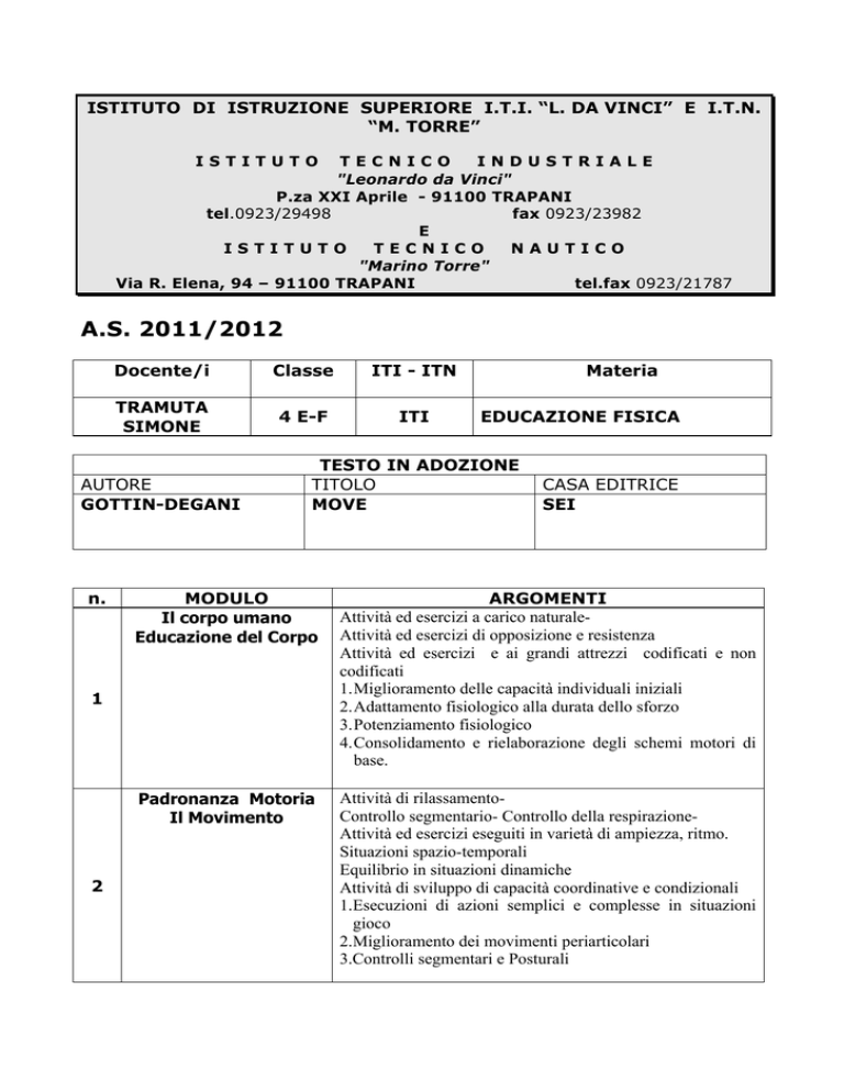 ISTITUTO DI ISTRUZIONE SUPERIORE I.T.I. “L. DA VINCI” E I.T.N. “M. TORRE” ISTITUTO TECNICO INDUSTRIALE "Leonardo da Vinci" P.za XXI Aprile - 91100 TRAPANI tel.0923/29498 fax 0923/23982 E ISTITUTO TECNICO NAUTICO "Marino Torre" Via R. Elena, 94 – 91100 TRAPANI tel.fax 0923/21787 A.S. 2011/2012 Docente/i Classe ITI - ITN TRAMUTA SIMONE 4 E-F ITI AUTORE GOTTIN-DEGANI n. EDUCAZIONE FISICA TESTO IN ADOZIONE TITOLO MOVE CASA EDITRICE SEI MODULO Il corpo umano Educazione del Corpo ARGOMENTI Attività ed esercizi a carico naturaleAttività ed esercizi di opposizione e resistenza Attività ed esercizi e ai grandi attrezzi codificati e non codificati 1. Miglioramento delle capacità individuali iniziali 2. Adattamento fisiologico alla durata dello sforzo 3. Potenziamento fisiologico 4. Consolidamento e rielaborazione degli schemi motori di base. Padronanza Motoria Il Movimento Attività di rilassamentoControllo segmentario- Controllo della respirazioneAttività ed esercizi eseguiti in varietà di ampiezza, ritmo. Situazioni spazio-temporali Equilibrio in situazioni dinamiche Attività di sviluppo di capacità coordinative e condizionali 1.Esecuzioni di azioni semplici e complesse in situazioni gioco 2.Miglioramento dei movimenti periarticolari 3.Controlli segmentari e Posturali 1 2 Materia Pratica motoriasportiva e cultura del movimento 3 Attitudini personali Transfert 4 - Attività sportive individuali - Specialità sportive di libera scelta - Tabelle di allenamento 1. Conoscenza e pratica di almeno due discipline individuali e due sport di squadra 2. Promozione delle attività sportive e miglioramento della comunicazione interpersonale 3. Temi d’attualità (doping,agonismo,violenza,mass-media,sport spettacolo,sport e scuola etc.) 4.Ed.alla Salute – Fumo e Alcool - Attività sportiva in ambiente naturale (sport all’aria aperta) - Lo sport dell’orientamento - Pratica sportiva come costume di vita - -Educazione alla salute - Prevenzione dei traumi 1.Adattamento delle capacità e competenze motorie in realtà ambientali 2.Conoscenza delle norme elementari del comportamento ai fini della prevenzione degli infortuni ed in caso di incidenti Educazione stradale 5 I MOMENTI DI VERIFICA 6 - L’educazione stradale secondo le indicazioni ministeriali in attuazione dell’art.230 del nuovo codice della strada. - A piedi - Bici - Moto - Auto -Norme di primo soccorso 1.Prevenzione degli infortuni in caso di incidente 2.Conoscenza delle regole di comportamento stradale 3.Conoscenza delle norme igieniche I MOMENTI DI VERIFICA Domande Tests Esercizi Attività sportive Autoverifiche Osservatorio:capacità motoria . Al fine di far conseguire allo studente la capacità di organizzare progetti autonomi, utilizzabili anche dopo la conclusione degli studi secondari, sono opportune forme di coinvolgimento attivo dello stesso nelle varie fasi dell'organizzazione dell'attività dalla progettazione alla realizzazione dei percorsi operativi e metodologici da adottare. ISTITUTO DI ISTRUZIONE SUPERIORE I.T.I. “L. DA VINCI” E I.T.N. “M. TORRE” ISTITUTO TECNICO INDUSTRIALE "Leonardo da Vinci" P.za XXI Aprile - 91100 TRAPANI tel.0923/29498 fax 0923/23982 E ISTITUTO TECNICO NAUTICO "Marino Torre" Via R. Elena, 94 – 91100 TRAPANI tel.fax 0923/21787 A.S. 2011/2012 Docente/i Classe ITI - ITN Materia Rizzo 4F ITI Elettronica AUTORE E. Ambrosini I. Perlasca n. MODULO 1 NOZIONI DI ELETTROTECNI CA 2 TESTO IN ADOZIONE TITOLO L’Elettronica Programmabile e analogica CASA EDITRICE Tramontana ARGOMENTI Grandezze variabili nel tempo - grandezze periodiche - grandezze alternate - grandezze sinusoidali - valore massimo, valore medio, valore efficace, periodo, frequenza, pulsazione, fase – Richiami su: legge di Ohm, Thevenin, Kircchhoff, Teorema di Norton – Teorema di Millman, Principio sovrapposizione degli effetti. I semiconduttori – Richiami sulla conduzione elettrica nei conduttori - influenza della Il diodo a temperatura - conduzione in un semiconduttore intrinseco - il drogaggio giunzione – Reti nei semiconduttori - semiconduttori drogati di tipo P e di tipo N elettriche con diodi portatori di corrente maggioritari e minoritari - la giunzione P-N - la regione di carica spaziale (depletion layer) e suo spessore polarizzazione diretta ed inversa della giunzione. Caratteristica tensionecorrente di un diodo a giunzione - caratteristica diretta ed inversa resistenza dinamica - effetto Zener ed effetto valanga - espressione analitica della corrente diretta - dipendenza delle caratteristiche del diodo dalla temperatura - caratteristiche approssimate del diodo - potenza dissipata in un diodo - resistenza termica - capacità della giunzione - i diodi Zener - stabilizzazione della tensione con diodi zener - diodi a capacità variabile (diodi varactor) - diodi LED - diodo Schottky. Retta di carico e punto di lavoro - circuiti con diodi e generatori in continua ed in alternata - circuiti limitatori - circuiti raddrizzatori a semplice e a doppia semionda - ponte di Graetz – rivelatore di picco - circuito fissatore (clamper) - duplicatori di tensione. 3 4 5 6 QUADRIPOLI E Quadripoli – I generatori dipendenti – Generalità sugli amplificatori di AMPLIFICATORI tensione e di corrente – amplificazione di tensione, di corrente e di potenza – Decibel di tensione di corrente e di potenza – Resistenza d’ingresso e d’uscita di un quadripolo – Guadagno e banda passante di un amplificatore. Il Transistore Costituzione del BJT - BJT del tipo NPN e PNP - principio di bipolare e funzionamento - equazioni fondamentali del transistore - guadagno di unipolare – corrente in continua hFE - le tre configurazioni EC, BC, CC Amplificatori con caratteristiche statiche ad emettitore comune - polarizzazione fissa di BJT,. base - retta di carico e punto di lavoro - variazione del punto di lavoro a causa della variazione della temperatura e della dispersione delle caratteristiche - coefficenti di stabilità - metodi di st
