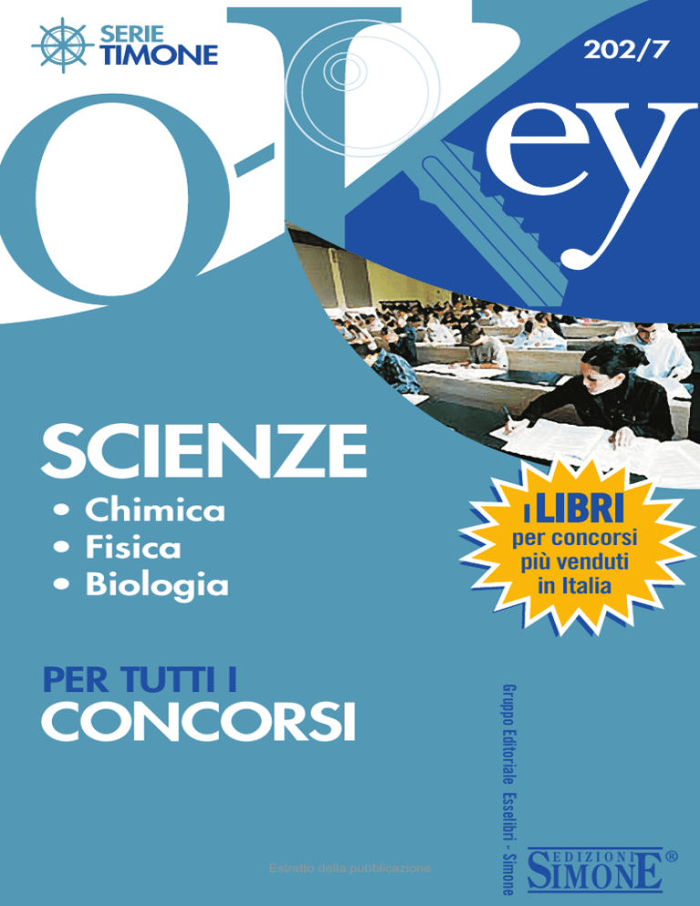 SERIE 202/7 TIMONE SCIENZE • Chimica • Fisica • Biologia LIBRI i per concorsi più venduti in Italia CONCORSI Estratto della pubblicazione Gruppo Editoriale Esselibri - Simone PER TUTTI I SIMONE EDIZIONI ® Estratto della pubblicazione TUTTI I DIRITTI RISERVATI Vietata la riproduzi one anche parziale Tutti i diritti di sfruttamento economico dell’opera appartengono alla Esselibri S.p.A. (art. 64, D.Lgs. 10-2-2005, n. 30) Ai lettori di questo volume segnaliamo: PK 23/1 PK 23/2 PK 23/3 PK 28 PK 29 - Fisica 1 Fisica 2 Fisica 3 Biologia Chimica Questa collana costituisce una valida alternativa per quanti non intendono acquistare i libri comprensivi di tutte le materie per uno specifico concorso Ha collaborato alla revisione del testo Michela Carlomagno Il catalogo aggiornato è consultabile sul sito Internet: www.simone.it ove è anche possibile scaricare alcune pagine saggio dei testi pubblicati Finito di stampare nel mese di luglio 2009 dalla «Officina Grafica Iride» - Via Prov.le Arzano-Casandrino, VII Trav., 24 - Arzano (NA) per conto della ESSELIBRI S.p.A. - Via F. Russo 33/D - 80123 - Napoli Grafica di copertina a cura di Giuseppe Ragno Estratto della pubblicazione PREMESSA Strumenti essenziali per chi si appresta a sostenere concorsi, esami o colloqui di lavoro, i volumetti della collana O-Key consentono lo studio e il ripasso di diverse materie, dalla Grammatica italiana alla Letteratura, dalla Storia alla Geografia, dall’Inglese all’Informatica e all’Attualità, attraverso trattazioni che, pur nella snellezza tipica delle sintesi, garantiscono esaustività e precisione. La struttura, improntata alla massima funzionalità, consente di apprendere rapidamente concetti e contenuti indispensabili a una conoscenza generale ma non lacunosa degli argomenti. Semplicità del linguaggio, aggiornamento dei contenuti e un’estrema praticità d’uso completano le caratteristiche di ogni volumetto. Questo volume di Scienze è diviso in tre parti: • Chimica • Fisica • Biologia La trattazione, condotta in un linguaggio semplice e puntuale, si avvale di numerose esemplificazioni e, ove necessario, di tabelle e visualizzazioni grafiche per consentire al lettore un rapido ed efficace apprendimento. Estratto della pubblicazione Estratto della pubblicazione PARTE PRIMA CHIMICA Capitolo Primo: Gli atomi: struttura e proprietà ............................ Capitolo Secondo: I legami chimici .................................................. Capitolo Terzo: Nomenclatura chimica ............................................ Capitolo Quarto: Reazioni chimiche e Stechiometria ..................... Capitolo Quinto: Le soluzioni ........................................................... Capitolo Sesto: Equilibrio chimico ................................................... Capitolo Settimo: Equilibrio acido-base .......................................... Capitolo Ottavo: Le reazioni redox e l’Elettrochimica ................... Capitolo Nono: Chimica nucleare .................................................... Capitolo Decimo: Chimica organica ................................................ Capitolo Undicesimo: Chimica biologica ......................................... Pag. » » » » » » » » » » 5 15 24 28 36 41 44 53 62 65 85 CAPITOLO PRIMO GLI ATOMI: STRUTTURA E PROPRIETÀ Sommario: 1. La materia. - 2. L’atomo: pesi e misure. - 3. Modelli della struttura atomica e numeri quantici. - 4. Configurazione elettronica degli elementi. - 5. La tavola periodica. - 6. Le proprietà degli elementi. 1. LA MATERIA La Chimica studia la struttura, le proprietà e le trasformazioni della materia, laddove per materia si intende tutto ciò che ha una massa e occupa un volume. Nel IV sec. a.C., in base a speculazioni puramente filosof iche, Democrito aveva postulato che la materia fosse costituita da particelle indivisibili, da lui denominate atomi (dal greco átomos, «indivisibile»). Agli inizi dell’Ottocento, J. Dalton (1766-1844), in seguito alla scoperta di leggi che regolano le reazioni chimiche della materia, riprese il concetto di atomo e formulò la prima ipotesi scientifica sulla struttura della materia. L’ipotesi atomica di Dalton era basata su quattro punti fondamentali: 1) la materia è costituita da atomi indivisibili e indistruttibili, pertanto non si crea, né si distrugge; 2) un elemento chimico è formato da atomi tutti uguali fra loro; Estratto della pubblicazione 6 Parte Prima - Chimica 3) elementi diversi sono costituiti da atomi diversi per volume, massa e proprietà, per cui un elemento non può essere trasformato in un altro elemento; 4) atomi uguali o diversi possono unirsi mediante un legame chimico per formare molecole. L’ipotesi di Dalton, a distanza di due secoli è fondamentalmente valida, tranne in alcuni punti: oggi sappiamo che l’atomo può essere suddiviso in particelle subatomiche, e che mediante reazioni nucleari è possibile la trasformazione di un elemento in un altro. A) Elementi, composti, miscugli Una sostanza è un tipo particolare di materia con proprietà specifiche e caratteristiche, diverse da quelle di qualsiasi altra sostanza. Le sostanze si dividono in elementi e composti: — un elemento non può essere scisso in sostanze più semplici (es. H, O, Cl ecc.); — un composto è formato dalla combinazione chimica di due o più elementi diversi (es. HCl, H2O, H2SO4, ecc.). Gli elementi e i composti possono essere mescolati fra loro e dare: — miscugli omogenei, se presentano in ogni punto le stesse proprietà chimiche e fisiche e i componenti non sono distinguibili (es. aria, acqua marina ecc.); — miscugli eterogenei, se non presentano in ogni punto le stesse proprietà chimiche e fisiche e i componenti sono distinguibili (es. sabbia, fango, olio più acqua ecc.). Gli elementi in natura sono 92, altri 13 sono stati ottenuti artificialmente; poiché un elemento altro non è che un atomo, possiamo affermare che fino a oggi si conoscono 10
