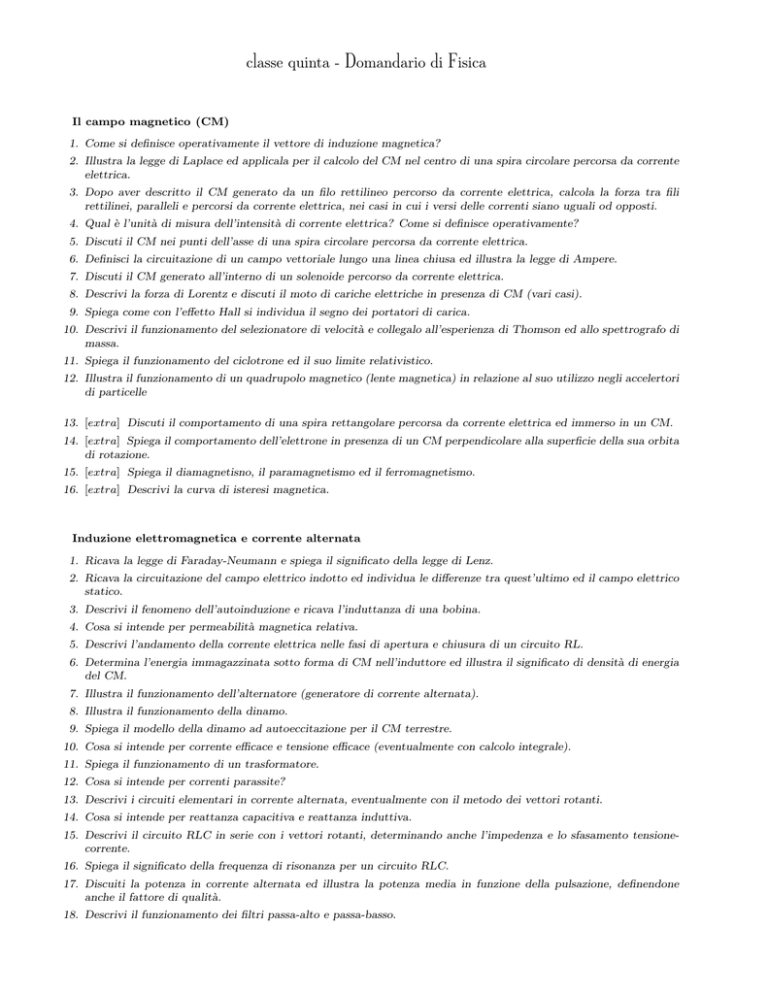 classe quinta - Domandario di Fisica Il campo magnetico (CM) 1. Come si definisce operativamente il vettore di induzione magnetica? 2. Illustra la legge di Laplace ed applicala per il calcolo del CM nel centro di una spira circolare percorsa da corrente elettrica. 3. Dopo aver descritto il CM generato da un filo rettilineo percorso da corrente elettrica, calcola la forza tra fili rettilinei, paralleli e percorsi da corrente elettrica, nei casi in cui i versi delle correnti siano uguali od opposti. 4. Qual è l’unità di misura dell’intensità di corrente elettrica? Come si definisce operativamente? 5. Discuti il CM nei punti dell’asse di una spira circolare percorsa da corrente elettrica. 6. Definisci la circuitazione di un campo vettoriale lungo una linea chiusa ed illustra la legge di Ampere. 7. Discuti il CM generato all’interno di un solenoide percorso da corrente elettrica. 8. Descrivi la forza di Lorentz e discuti il moto di cariche elettriche in presenza di CM (vari casi). 9. Spiega come con l’effetto Hall si individua il segno dei portatori di carica. 10. Descrivi il funzionamento del selezionatore di velocità e collegalo all’esperienza di Thomson ed allo spettrografo di massa. 11. Spiega il funzionamento del ciclotrone ed il suo limite relativistico. 12. Illustra il funzionamento di un quadrupolo magnetico (lente magnetica) in relazione al suo utilizzo negli accelertori di particelle 13. [extra] Discuti il comportamento di una spira rettangolare percorsa da corrente elettrica ed immerso in un CM. 14. [extra] Spiega il comportamento dell’elettrone in presenza di un CM perpendicolare alla superficie della sua orbita di rotazione. 15. [extra] Spiega il diamagnetisno, il paramagnetismo ed il ferromagnetismo. 16. [extra] Descrivi la curva di isteresi magnetica. Induzione elettromagnetica e corrente alternata 1. Ricava la legge di Faraday-Neumann e spiega il significato della legge di Lenz. 2. Ricava la circuitazione del campo elettrico indotto ed individua le differenze tra quest’ultimo ed il campo elettrico statico. 3. Descrivi il fenomeno dell’autoinduzione e ricava l’induttanza di una bobina. 4. Cosa si intende per permeabilità magnetica relativa. 5. Descrivi l’andamento della corrente elettrica nelle fasi di apertura e chiusura di un circuito RL. 6. Determina l’energia immagazzinata sotto forma di CM nell’induttore ed illustra il significato di densità di energia del CM. 7. Illustra il funzionamento dell’alternatore (generatore di corrente alternata). 8. Illustra il funzionamento della dinamo. 9. Spiega il modello della dinamo ad autoeccitazione per il CM terrestre. 10. Cosa si intende per corrente efficace e tensione efficace (eventualmente con calcolo integrale). 11. Spiega il funzionamento di un trasformatore. 12. Cosa si intende per correnti parassite? 13. Descrivi i circuiti elementari in corrente alternata, eventualmente con il metodo dei vettori rotanti. 14. Cosa si intende per reattanza capacitiva e reattanza induttiva. 15. Descrivi il circuito RLC in serie con i vettori rotanti, determinando anche l’impedenza e lo sfasamento tensionecorrente. 16. Spiega il significato della frequenza di risonanza per un circuito RLC. 17. Discuiti la potenza in corrente alternata ed illustra la potenza media in funzione della pulsazione, definendone anche il fattore di qualità. 18. Descrivi il funzionamento dei filtri passa-alto e passa-basso. C. Luviner circuiti in corrente alternata 2 Sintesi dell’elettromagnetismo - onde elettromagnetiche (OEM) 1. Spiega perchè la legge di Ampère non è valida nel caso della presenza del condensatore. 2. Definisci la corrente di spostamento ed illustra la legge di Ampère-Maxwell. 3. Scrivi ed illustra le equazioni di Maxwell. 4. Descrivi le funzioni d’onda per i campi elettrici e magnetici di un’OEM; illustra le caratteristiche di un’OEM. 5. Qual è la relazione tra E e B per un’OEM? Deducila, eventualmente, dalla terza equazione di Maxwell. 6. Dimostra che, per un’OEM, la densità di energia di E è uguale a quella di B. 7. Calcola la densità media di energia di un’OEM. 8. Scrivi il vettore di Poynting, come profotto vettoriale, e determina l’intensità media di un’OEM. 9. Scrivi la potenza e l’energia di un’OEM in funzione dell’intensità nedia dell’OEM. 10. Scrivi le espressioni della quantità di moto e della pressione di radiazione per un’OEM. 11. Discuti l’emissione e la ricezione di OEM. 12. Illustra la polarizzazione di OEM con polarazzatori. 13. Illustra la polarizzazione di OEM per riflessione, definisci l’angolo di Brewster. 14. Illustra la diffrazione di OEM attraverso una fenditura. 15. Illustra i criteri di Rayleigh per la risoluzione di una fenfitura e di un foro circolare. Trasformazioni di Lorentz 1. Descrivi l’esperimento di Michelson-Morley (Feynman) 2. Enuncia i postulati di Einstein della relatività ristretta. 3. Evidenzia come la simultaneità degli eventi sia dipendente dal sistema di riferimento. 4. Scrivi le trasformazioni di Lorentz per le coordinate, eventualmente ricavandole. 5. Ricava le trasformazioni di Lorentz per le velocità. 6. Descrivi la contrazione delle lunghezze e definisci la lunghezza propria. 7. Descrivi la dilatazione dei tempi e definisci il tempo proprio. Lo spazio tempo 1. Definisci il quadrivettore spazio-tempo e riscrivi le trasformazioni di Lorentz. 2. Definisci l’invariante relativistico spazio-tempo e spiegane il significato. 3. Illustra il piano spazio-tempo di Minkowski e spiega il significato delle limee di universo, in particolare quella della luce. 4. Spiega come, nel piano spazio-tempo di Minkowski, si costruisce un sistema di riferimento inerziale. 5. Spiega come, nel piano spazio-tempo di Minkowski, la simultaneità sia dipendente dal sistema inerziale. 6. Illustra il procedimento per la costruzione delle scale per gli assi spazio-temporali dei sistemi inerziali nel piano spazio-tempo di Minkowski. 7. Spiega perchè la 