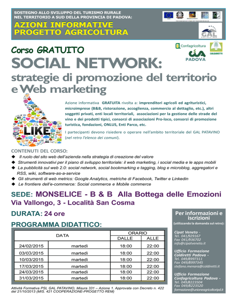 SOSTEGNO ALLO SVILUPPO DEL TURISMO RURALE NEL TERRITORIO A SUD DELLA PROVINCIA DI PADOVA: AZIONI INFORMATIVE PROGETTO AGRICOLTURA Corso GRATUITO SOCIAL NETWORK: PADOVA strategie di promozione del territorio e Web marketing Azione informativa GRATUITA rivolta a: imprenditori agricoli ed agrituristici, microimprese (B&B, ristorazione, accoglienza, commercio al dettaglio, etc.), altri soggetti privati, enti locali territoriali, associazioni per la gestione delle strade del vino e dei prodotti tipici, consorzi di associazioni Pro-loco, consorzi di promozione turistica, fondazioni, ONLUS, Enti Parco, etc. I partecipanti devono risiedere o operare nell’ambito territoriale del GAL PATAVINO (nel retro l’elenco dei comuni). CONTENUTI DEL CORSO: u Il ruolo del sito web dell’azienda nella strategia di creazione del valore u Strumenti innovativi per il piano di sviluppo territoriale: il web marketing, i social media e le apps mobili u La pubblicità sul web 2.0: social network, social bookmarking e tagging, blog e microblog, aggregatori e RSS, wiki, software-as-a-service u Gli strumenti di web metrics: Google Analytics, metriche di Facebook, Twitter e Linkedin u Le frontiere dell’e-commerce: Social commerce e Mobile commerce SEDE: MONSELICE - B & B Alla Bottega delle Emozioni Via Vallongo, 3 - Località San Cosma Per informazioni e iscrizioni DURATA: 24 ore PROGRAMMA DIDATTICO: (utilizzando la domanda sul retro): ORARIO DALLE ALLE DATA 24/02/2015 martedì 18:00 22:00 03/02/2015 3 martedì 18:00 22:00 10/03/2015 martedì 18:00 22:00 17/03/2015 24/03/2015 martedì martedì 18:00 18:00 22:00 22:00 31/03/2015 martedì 18:00 22:00 Attività Formativa PSL GAL PATAVINO, Misura 331 – Azione 1. Approvata con Decreto n. 422 del 21/10/2013 (MIS. 421 COOPERAZIONE-PROGETTO REM) Cipat Veneto Tel. 041/929167 Fax 041/936702 info@cipatveneto.it Ufficio Formazione Coldiretti Padova Tel. 049/8997311 Fax 049/8997345 stefano.menara@coldiretti.it Ufficio Formazione Confagricoltura Padova Tel. 049/8223504 Fax 049/8223520 formazione@unioneagricoltoripd.it DOMANDA D’AMMISSIONE GAL PATAVINO - Misura 331 – azione 1 - Azione informativa n° 5 SOCIAL NETWORK: STRATEGIE DI PROMOZIONE DEL TERRITORIO E WEB MARKETING COMUNI AFFERENTI: Abano Terme - Arquà Petrarca - Baone - Battaglia Terme - Casale di Scodosia - Cervarese Santa Croce - Cinto Euganeo - Galzignano Terme - Lozzo Atestino - Megliadino San Fidenzio - Megliadino San Vitale - Merlara - Monselice - Montagnana - Montegrotto Terme - Ospedaletto Euganeo - Rovolon - Saletto Teolo - Torreglia - Urbana - Veggiano - Vo’ DICHIARAZIONE SOSTITUTIVA DI CERTIFICAZIONE (Art. 46 D.P.R. n. 445 del 28 dicembre 2000) Nome e cognome ________________________________________________________________ nato/a a ________________________________________________ residente in _____________________________ Via Cap __________ il ____________________ _________________________________ Tel. ____________________ Fax ____________________ Cell ______________________ E-mail ________________________________________________ Codice fiscale Titolo di studio è ___________________________________________________ occupato in qualità di (segnare con una X) Imprenditore (compreso socio) Coadiuvante agricolo (iscritto alla posizione INPS dell’azienda) Partecipe familiare dell’azienda agricola (NON iscritto alla posizione INPS dell’azienda - Parente del titolare d’azienda fino al 3° grado diretto e 2° grado indiretto ) SPECIFICARE GRADO DI PARENTELA ____________________________________________________ Dipendente Altro (specificare) _______________________________________________________________________ nell’azienda denominata ____________________________________________________ con sede legale in ____________________________ Via _________________________________________ P.IVA ____________________________ CUAA (Codice Fiscale azienda) _____________________________ (legale rappresentante Sig./ra ______________________________) Codice Ateco 2007: _______________ DICHIARAZIONE DI CONSENSO PER TRATTAMENTO DATI Il CIPAT Veneto, titolare del trattamento, raccoglie ‘ presso di sé e tratta, con modalità anche automatizzate, i dati personali. I dati acquisiti sono utilizzati dal CIPAT Veneto al solo fine di fornire il servizio richiesto e per l’invio di proprie comunicazioni e non vengono comunicati a terzi né diffusi. Lei potrà esercitare i diritti di cui all’art.7 del D.Lgs. 196/2003 (aggiornamento, rettificazione, integrazione, cancellazione, blocco dei dati trattati in violazione alla legge); in ogni momento sarà possibile chiedere di essere rimossi dall'elenco dei destinatari comunicandolo, con qualsiasi mezzo, al CIPAT Veneto. In base a quanto previsto dall'art.13 del nuovo codice sulla privacy (D.Lgs. 196 del 30 giugno 2003) DÀ IL PROPRIO CONSENSO al trattamento dei propri dati in relazione a tutti gli adempimenti amministrativi, previdenziali, assistenziali, fiscali e contabili inerenti il corso. Data ____________________________ _____________________________ (firma)