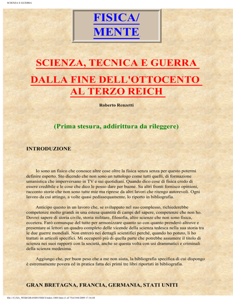 SCIENZA E GUERRA FISICA/ MENTE SCIENZA, TECNICA E GUERRA DALLA FINE DELL'OTTOCENTO AL TERZO REICH Roberto Renzetti (Prima stesura, addirittura da rileggere) INTRODUZIONE Io sono un fisico che conosce altre cose oltre la fisica senza senza per questo potermi definire esperto. Sto dicendo che non sono un tuttologo come tutti quelli, di formazione umanistica che imperversano in TV e sui quotidiani. Quando dico cose di fisica credo di essere credibile e le cose che dico le posso dare per buone. Su altri fronti fornisco opinioni, racconto storie che non sono tutte mie ma riprese da altri lavori che ritengo autorevoli. Ogni lavoro da cui attingo, a volte quasi pedissequamente, lo riporto in bibliografia. Anticipo questo in un lavoro che, se sviluppato nel suo complesso, richiederebbe competenze molto grandi in una estesa quantità di campi del sapere, competenze che non ho. Dovrei sapere di storia civile, storia militare, filosofia, altre scienze che non sono fisica, eccetera. Farò comunque del tutto per armonizzare quanto so con quanto prenderò altrove e presentare ai lettori un quadro completo delle vicende della scienza tedesca nella sua storia tra le due guerre mondiali. Non entrerò nei dettagli scientifici perché, quando ho potuto, li ho trattati in articoli specifici. Mi occuperò più di quella parte che potrebbe assumere il titolo di scienza nei suoi rapporti con la società, anche se questa volta con usi drammatici e criminali della scienza medesima. Aggiungo che, per buon peso che a me non aiuta, la bibliografia specifica di cui dispongo è estremamente povera ed in pratica fatta dei primi tre libri riportati in bibliografia. GRAN BRETAGNA, FRANCIA, GERMANIA, STATI UNITI file:///C|/$A_WEB/GRANDI FISICI/index-1803.htm (1 of 75)13/04/2009 17.16.44 SCIENZA E GUERRA In varie occasioni ho avuto modo di dire che tra l'ultimo quarto dell'Ottocento ed i Primi del Novecento l'asse della cultura scientifica diventa la Germania. Abbiamo avuto modo di discutere della Potenza scientifica inglese, da Newton a Rutherford, potenza estesa in quasi tutti i campi del sapere ma che andava perdendo forza proprio per l'emergere della Germania dal momento della sua unificazione. Abbiamo anche visto nascere la scuola scientifica francese, nel Settecento ed a lato e sostegno della Rivoluzione. Una scuola che cedette pian piano il passo a scuole più solide perché sostenute da economie più solide e da politiche più aperte. Cerco qui di delineare rapidamente alcune tappe che stanno alla base delle questioni più eminentemente scientifiche che discuterò poi. Sul finire dell'Ottocento la Rivoluzione Industriale è ormai compiuta. Con essa sono avanzati cambiamenti radicali nell'organizzazione politico-economico-sociale. Per dare solo un indice di come l'introduzione massiccia delle macchine nei processi produttivi rivoluzionò l'intero modo di produzione industriale, si pensi che alla fine del Settecento (1787) il lavoro nei campi di 19 contadini riusciva a produrre un surplus sufficiente ad alimentare una persona che viveva in città, mentre agli inizi del Novecento (1935) gli stessi 19 contadini riuscivano a produrre un surplus sufficiente ad. alimentare 66 persone che vivevano in città (i dati sono riferiti agli Stati Uniti). Si può quindi ben capire come industrializzazione e meccanizzazione dell'agricoltura dovessero andare di pari passo, sarebbe stato altrimenti impossibile distogliere mano d'opera dai campi per servire alla produzione nell'industria. Ma per lo sviluppo di tutti i ritrovati tecnici che si andavano accumulando era indispensabile una enorme disponibilità di capitali ai quali provvide finanza e politica con l'immissione di nuovo oro sul mercato e l'introduzione della carta moneta. Con la crisi poi che graverà su tutta l'Europa a partire dal 1873 fino al 1896 (grande depressione economica dalla quale solo la Germania riuscì ad uscire quasi indenne) il sistema bancario e finanziario subì trasformazioni profonde per rispondere alle nuove esigenze. Nacquero società finanziarie per azioni con un potere di controllo esercitato a tutti i livelli della vita economica, politica e sociale. E' l'epoca in cui si inaugurava l'età del colonialismo e dell'imperialismo con necessità di riconversioni ed ulteriori cambiamenti dei modi di produzione che portarono alla chiusura di tutte le imprese più deboli e ad una grossa espulsione di operai dalle fabbriche. La richiesta di massimizzazione del profitto portò all'ulteriore automazione ed alle teorizzazioni e realizzazioni dello statunitense F. W. Taylor (1856-1915), fondatore del metodo dell'organizzazione scientifica del lavoro (parcellizzazione), all'introduzione delle catene di montaggio e ad un grosso aumento di produzione. Oltre a ciò si costruirono grosse concentrazioni industriali sotto forma di società per azioni, cartelli e trusts che ben presto assunsero il ruolo di multinazionali. Nel processo di ristrutturazione, a partire dalla crisi de '73, la Gran Bretagna e la Francia persero il loro primato produttivo, economico, industriale, commerciale e scientificotecnologico. Questo primato passò alla Germania ed agli Stati Uniti. Indagare con una qualche pretesa di completezza questo passaggio di primato ci porterebbe troppo lontano, ma alcuni elementi per comprenderlo possono essere delineati. Certamente la struttura produttiva della Gran Bretagna era, ancora alla metà del secolo, di gran lunga la più possente tra tutte le altre; e qui già si può cogliere un primo elemento del declino di questa potenza (che per molti versi è simile a quello della Francia): una struttura. solida, che ha dei processi produttivi consolidati già da anni, presenta molto maggiori difficoltà alla riconversione industriale e tecnologica (a meno che si rinunci a gran parte del profitto per le cicliche indispensabili innovazioni). Altro elemento fondamentale, alla base della perdita del primato britannico, fu la struttura scolastica ed educativa. Quest