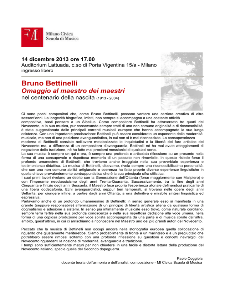 14 dicembre 2013 ore 17.00 Auditorium Lattuada, c.so di Porta Vigentina 15/a - Milano ingresso libero Bruno Bettinelli Omaggio al maestro dei maestri nel centenario della nascita (1913 - 2004) Ci sono pochi compositori che, come Bruno Bettinelli, possono vantare una carriera creativa di oltre sessant’anni. La longevità biografica, infatti, non sempre si accompagna a una costante attività compositiva, basti pensare a un Sibelius. Come compositore Bettinelli ha attraversato tre quarti del Novecento, e la sua musica, pur conservando sempre tratti di una non comune originalità e di riconoscibilità, è stata suggestionata dalle principali correnti musicali europee che hanno accompagnato la sua lunga esistenza. Con una importante precisazione: Bettinelli può essere considerato un esponente della modernità musicale, ma non di una posizione avanguardistica, in cui non si è mai riconosciuto. La consapevolezza moderna di Bettinelli consiste nell’avere metabolizzato le inquietudini e la libertà del fare artistico del Novecento ma, a differenza di un compositore d’avanguardia, Bettinelli né ha mai avuto atteggiamenti di negazione della tradizione, né ha fatto mai proclami messianici di qualsiasi sorta. La sua musica è sempre un qui e ora, è sempre una profonda e articolata riflessione su un presente nella forma di una consapevole e rispettosa memoria di un passato non rimovibile. In questo risiede forse il profondo umanesimo di Bettinelli, che troviamo anche irraggiato nella sua proverbiale esperienza e testimonianza didattica. La musica di Bettinelli, dicevamo, rivela sempre una riconoscibilissima personalità, che con una non comune abilità artigianale e coerenza ha fatto proprie diverse esperienze linguistiche in quella chiave prevalentemente contrappuntistica che è la sua principale cifra stilistica. I suoi primi lavori rivelano un debito con la Generazione dell’Ottanta (forse maggiormente con Malipiero) e con l’imperante neoclassicismo degli anni Trenta-Quaranta. Successivamente, tra la fine degli anni Cinquanta e l’inizio degli anni Sessanta, il Maestro fece propria l’esperienza atonale definendosi praticante di una libera dodecafonia. Echi avanguardistici, seppur ben temperati, si trovano nelle opere degli anni Settanta, per giungere infine, a partire dagli anni Ottanta, a una definitiva e mirabile sintesi linguistica ed espressiva. Parlavamo anche di un profondo umanenesimo di Bettinelli: in senso generale esso si manifesta in una grande (seppure responsabile) affermazione di un principio di libertà artistica aliena da qualsiasi forma di dogmatismo e adesione a sistemi. In senso più intimamente musicale esso trovò, come naturale corollario, sempre terra fertile nella sua profonda conoscenza e nella sua rispettosa dedizione alla voce umana, nella forma di una copiosa produzione per voce solista accompagnata da una parte e di musica corale dall’altra, ambito, quest’ultimo, in cui ci arrischiamo a riconoscere nel Maestro uno dei più grandi autori del Novecento. Peccato che la musica di Bettinelli non occupi ancora nella storiografia europea quella collocazione di riguardo che giustamente meriterebbe. Siamo probabilmente di fronte a un malinteso e a un pregiudizio che potrebbero essere rimossi soltanto con una profonda riflessione su questioni e concetti nevralgici del Novecento riguardanti la nozione di modernità, avanguardia e tradizione. I tempi sono sufficientemente maturi per non chiudersi in una facile e distorta lettura della produzione del Novecento italiano, specie quella del Secondo dopoguerra. Paolo Coggiola docente teoria dell'armonia e dell'analisi; composizione - MI Civica Scuola di Musica Programma Due liriche lunari per voce e pianoforte (1949) Finita è la notte - Era dolce la luna di settembre Elisa Pittau, voce; Silvia Magagni, pianoforte Mutazioni su tre temi noti, per chitarra (1994) Alessandro Guerra, chitarra Studio da concerto, per clarinetto (1971) Stefano Merighi, clarinetto Divertimento a due, per due chitarre (1982) Eni Lulja, chitarra; Griselda Gatti chitarra Dialogo, per flauto e pianoforte (1983) Giulia Giovannelli, flauto; Stefano Maffioletti, pianoforte Sonatina, per pianoforte (1939) allegretto con semplicità - nenia - burletta Pietro Calabretta, pianoforte Aforismi, per due flauti e pianoforte (1989) Dario Cottica, flauto; Lorenzo Cavanna, flauto; Stefano Cerenini, pianoforte La terra, per voce, clarinetto e pianoforte (1968) Elisa Pittau, voce; Lorenzo Baldasso, clarinetto; Silvia Magagni, pianoforte Partecipano le classi di musica da camera di Silva Costanzo canto lirico di Roberto Coviello pianoforte di Maria Teresa Levati clarinetto di Maurizio Longoni chitarra di Agostina Mari chitarra di Guido Muneratto flauto di Emilio Vapi Si ringrazia la prof.ssa Silvia Bianchera Bettinelli per la gentile collaborazione Al termine del concerto l’Associazione Culturale MALALA (BG) offrirà un piccolo rinfresco espressamente dedicato al ricordo di Bruno Bettinelli Informazioni: Milano Civica Scuola di Musica - Fondazione Milano® Villa Simonetta - via Stilicone 36 - 20154 - Milano - Tel. 02.97.15.24 - uff. st. 339.85.30.339 info_musica@scmmi.it - www.fondazionemilano.eu/musica