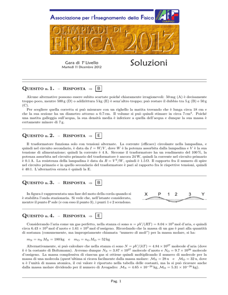 QUESITO n. 1. – RISPOSTA ⇒ B Alcune alternative possono essere subito scartate poiché chiaramente irragionevoli: 50 mg (A) è decisamente troppo poco, mentre 500 g (D) o addirittura 5 kg (E) è senz’altro troppo; può restare il dubbio tra 5 g (B) e 50 g (C). Per scegliere quella corretta si può misurare con un righello la matita trovando che è lunga circa 18 cm e che la sua sezione ha un diametro attorno a 0.7 cm. Il volume si può quindi stimare in circa 7 cm3 . Poiché una matita galleggia sull’acqua, la sua densità media è inferiore a quella dell’acqua e dunque la sua massa è certamente minore di 7 g. QUESITO n. 2. – RISPOSTA ⇒ E Il trasformatore funziona solo con tensioni alternate. La corrente (efficace) circolante nella lampadina, e quindi nel circuito secondario, è data da I = W/V , dove W è la potenza assorbita dalla lampadina e V è la sua tensione di alimentazione; quindi la corrente è 4 A. Siccome il trasformatore ha un rendimento del 100 %, la potenza assorbita nel circuito primario del trasformatore è ancora 24 W, quindi la corrente nel circuito primario è 0.1 A. La resistenza della lampadina è data da R = V 2 /W , quindi è 1.5 Ω. Il rapporto fra il numero di spire nel circuito primario e in quello secondario del trasformatore è pari al rapporto fra le rispettive tensioni, quindi è 40:1. L’alternativa errata è quindi la E. QUESITO n. 3. – RISPOSTA ⇒ B In figura è rappresentata una fase del moto della corda quando si è stabilita l’onda stazionaria. Si vede che, nell’istante considerato, mentre il punto P sale (e con esso il punto 3), i punti 1 e 2 scendono. QUESITO n. 4. – RISPOSTA ⇒ E Considerando l’aria come un gas perfetto, nella stanza ci sono n = pV /(RT ) = 8.04 × 103 mol d’aria, e quindi circa 6.43 × 103 mol d’azoto e 1.61 × 103 mol d’ossigeno. Ricordando che la massa di un gas è pari alla quantità di sostanza (comunemente, ma impropriamente chiamata “numero di moli”) per la massa molare, si ha: mN = nN MN = 180 kg e mO = nO MO = 52 kg Alternativamente, si può calcolare che nella stanza ci sono N = pV /(kT ) = 4.84 × 1027 molecole d’aria (dove k è la costante di Boltzmann). Avremo dunque NN = 3.87 × 1027 molecole d’azoto e NO = 9.7 × 1026 molecole d’ossigeno. La massa complessiva di ciascun gas si ottiene quindi moltiplicando il numero di molecole per la massa di una molecola (quest’ultima si ricava facilmente dalla massa molare: MN = 28 u e MO = 32 u, dove u è l’unità di massa atomica, il cui valore è riportato nella tabella delle costanti, ma la si può ricavare anche dalla massa molare dividendo per il numero di Avogadro: MN = 4.65 × 10−26 kg, MO = 5.31 × 10−26 kg). Pag. 1 AIF – Olimpiadi di Fisica 2013 QUESITO n. 5. Soluzione del QUESTIONARIO – 11 Dicembre 2012 – RISPOSTA ⇒ B In questo esperimento sull’effetto fotoelettrico, il numero di elettroni emessi dipende dal numero di fotoni con frequenza superiore al valore di soglia, che incidono sul metallo. Questo numero è ovviamente direttamente proporzionale al tempo di illuminazione, e di conseguenza anche il numero di elettroni emessi cresce proporzionalmente al tempo. QUESITO n. 6. – RISPOSTA ⇒ C La fune è inestensibile, dunque i due blocchi percorrono le stesse distanze negli stessi intervalli di tempo, quindi in ogni istante sono uguali, in modulo, le loro velocità e di conseguenza le loro accelerazioni. Detto a il modulo comune dell’accelerazione, si ha F 1 = m1 a e F2 = m2 a QUESITO n. 7. ⇒ F1 m1 3 = = F2 m2 7 – RISPOSTA ⇒ B ! il cui modulo è La forza che una particella carica subisce all’interno di un campo magnetico è F! = q!v × B, ! Nel nostro caso ϑ = 90◦ , quindi F = |q| vB. Di conseguenza: F = |qvB sen ϑ|, dove ϑ è l’angolo tra !v e B. |q| = F/(vB) = 3.2 × 10−19 C = 2 e avendo indicato con e la carica elementare. Si tratta dunque di una particella α, l’unica, tra quelle date, ad avere una tale carica; infatti l’elettrone e il protone (ovvero un nucleo di idrogeno) hanno una carica di modulo e, il neutrone ha carica nulla e un atomo ionizzato tre volte ha una carica 3 e. QUESITO n. 8. – RISPOSTA ⇒ A La bilancia a molla sfrutta, per il suo funzionamento, la misura della forza che comprime la molla: i valori di forza sono cioè “convertiti” in valori di massa usando, come regola di conversione, la formula m = F/g. In altre parole, la bilancia segna 1 kg quando la forza elastica è 9.81 N. Di conseguenza dire che la bilancia indica un valore maggiore della massa reale della ragazza equivale a dire che registra una forza maggiore del peso della ragazza, cioè della forza gravitazionale con cui la Terra attira la ragazza. Poiché le forze che agiscono sulla ragazza sono il peso e la forza normale (o elastica) esercitata dalla bilancia, quando quest’ultima è maggiore (in modulo) del peso la ragazza accelera verso l’alto (insieme all’ascensore, ovviamente). Le alternative B ed E sono errate perché corrispondono ad una situazione in cui l’accelerazione è nulla, quelle C e D sono errate perché in queste situazioni l’accelerazione è diretta verso il basso (ricordiamo che quando velocità e accelerazione hanno verso opposto il corpo rallenta, quando hanno lo stesso verso il modulo della velocità aumenta). Nel caso A l’accelerazione è verso l’alto, e questa potrebbe essere la causa dell’“errata” indicazione della bilancia. Notiamo che lo stesso effetto si avrebbe in una situazione in cui l’ascensore si muovesse verso il basso, rallentando. QUESITO n. 9. – RISPOSTA ⇒ D Il tratto di circuito costituito dal voltmetro e dal resistore ai cui capi esso è collegato ha una resistenza equivalente di 500 Ω, che risulta un terzo della resistenza complessiva del circuito. Di conseguenza la differenza di potenziale ai capi del voltmetro sarà un terzo della differenza di potenziale totale fornita dalla batteria. In modo più formale la resistenza equivalen