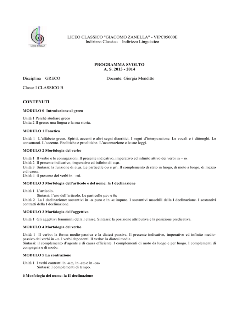 LICEO CLASSICO "GIACOMO ZANELLA" - VIPC05000E Indirizzo Classico – Indirizzo Linguistico PROGRAMMA SVOLTO A. S. 2013 - 2014 Disciplina GRECO Docente: Giorgia Menditto Classe I CLASSICO B CONTENUTI MODULO 0 Introduzione al greco Unità 1 Perché studiare greco Unita 2 Il greco: una lingua e la sua storia. MODULO 1 Fonetica Unità 1 L’alfabeto greco. Spiriti, accenti e altri segni diacritici. I segni d’interpunzione. Le vocali e i dittonghi. Le consonanti. L’accento. Enclitiche e proclitiche. L’accentazione e le sue leggi. MODULO 2 Morfologia del verbo Unità 1 Il verbo e le coniugazioni. Il presente indicativo, imperativo ed infinito attivo dei verbi in – . Unità 2 Il presente indicativo, imperativo ed infinito di Unità 3 Sintassi: la funzione di Le particelle e . Il complemento di stato in luogo, di moto a luogo, di mezzo e di causa. Unità 4 il presente dei verbi in –mi. MODULO 3 Morfologia dell’articolo e del nome: la I declinazione Unità 1 L’articolo. Sintassi: l’uso dell’articolo. Le particelle e Unità 2 La I declinazione: sostantivi in - puro e in -impuro. I sostantivi maschili della I declinazione. I sostantivi contratti della I declinazione. MODULO 3 Morfologia dell’aggettivo Unità 1 Gli aggettivi femminili della I classe. Sintassi: la posizione attributiva e la posizione predicativa. MODULO 4 Morfologia del verbo Unità 1 Il verbo: la forma medio-passiva e la diatesi passiva. Il presente indicativo, imperativo ed infinito mediopassivo dei verbi in -I verbi deponenti. Il verbo: la diatesi media. Sintassi: il complemento d’agente e di causa efficiente. I complementi di moto da luogo e per luogo. I complementi di compagnia e di modo. MODULO 5 La contrazione Unità 1 I verbi contratti in -in -e in - Sintassi: I complementi di tempo. 6 Morfologia del nome: la II declinazione Unità 1 La II declinazione: i sostantivi maschili, femminili e neutri. I sostantivi contratti. Sostantivi della declinazione Attica. Sintassi: la concordanza del nominativo neutro plurale. L’infinito sostantivato e la proposizione dichiarativa. MODULO 7 Morfologia del verbo: l’imperfetto Unità 1 L’imperfetto e l’aumento. Particolarità dell’aumento. L’imperfetto di l'imperfetto dei verbi in -w e dei verbi in -L’imperfetto dei verbi composti Sintassi: elementi essenziali di sintassi dell’aggettivo e del verbo. La proposizione temporale. Unità 2 L’imperfetto indicativo attivo e medio-passivo dei verbi contratti. Sintassi: il complemento di fine. MODULO 8 Morfologia dell’aggettivo Unità 1 Gli aggettivi contratti. Gli aggettivi della declinazione attica. MODULO 9 Morfologia del verbo Unita 1 Il congiuntivo e l’ottativo attivo e medio-passivo dei verbi in -e in -. Il congiuntivo e l’ottativo presente attivo e medio-passivo dei verbi contratti. Sintassi: la costruzione personale del nominativo con l’infinito. Le proposizioni finali e causali e il congiuntivo esortativo. MODULO 10 Morfologia del nome: la III declinazione Unità 1 La III declinazione: temi in occlusiva gutturale, labiale e dentale, con il tema in –nt, , con il tema in –r e in –l, con il tema in –r con apofonia. I nomi in nasale e in sibilante. Complementi di tempo. MODULO 12 Morfologia del verbo Unità 1 Il participio presente attivo e medio-passivo. Unità 2 Il participio sostantivato, attributivo, congiunto. Modulo di civiltà classica Si è affrontato inoltre il tema dell’acqua nell’antica Grecia nell’ambito del nucleo pluridisciplinare previsto dal piano di lavoro del Consiglio di classe. Schio, 04 - 06 - 2014 L’insegnante prof.ssa Giorgia Menditto I rappresentanti di classe ____________________ ____________________