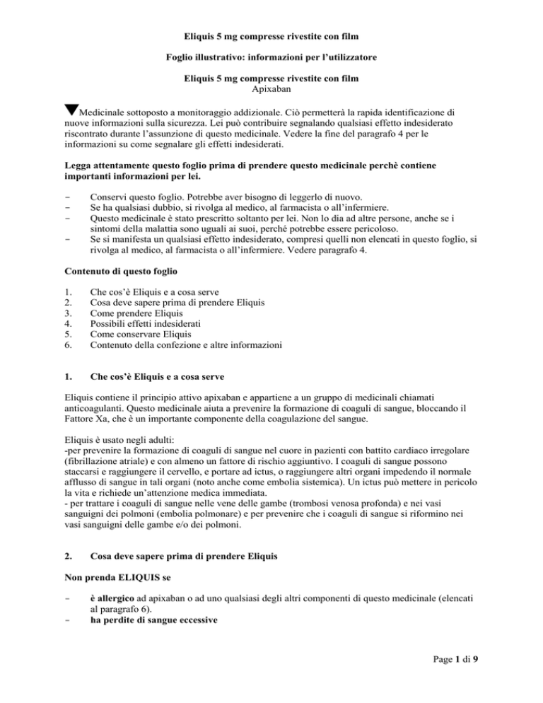 Eliquis 5 mg compresse rivestite con film Foglio illustrativo: informazioni per l’utilizzatore Eliquis 5 mg compresse rivestite con film Apixaban Medicinale sottoposto a monitoraggio addizionale. Ciò permetterà la rapida identificazione di nuove informazioni sulla sicurezza. Lei può contribuire segnalando qualsiasi effetto indesiderato riscontrato durante l’assunzione di questo medicinale. Vedere la fine del paragrafo 4 per le informazioni su come segnalare gli effetti indesiderati. Legga attentamente questo foglio prima di prendere questo medicinale perchè contiene importanti informazioni per lei. - Conservi questo foglio. Potrebbe aver bisogno di leggerlo di nuovo. Se ha qualsiasi dubbio, si rivolga al medico, al farmacista o all’infermiere. Questo medicinale è stato prescritto soltanto per lei. Non lo dia ad altre persone, anche se i sintomi della malattia sono uguali ai suoi, perché potrebbe essere pericoloso. Se si manifesta un qualsiasi effetto indesiderato, compresi quelli non elencati in questo foglio, si rivolga al medico, al farmacista o all’infermiere. Vedere paragrafo 4. Contenuto di questo foglio 1. 2. 3. 4. 5. 6. Che cos’è Eliquis e a cosa serve Cosa deve sapere prima di prendere Eliquis Come prendere Eliquis Possibili effetti indesiderati Come conservare Eliquis Contenuto della confezione e altre informazioni 1. Che cos’è Eliquis e a cosa serve Eliquis contiene il principio attivo apixaban e appartiene a un gruppo di medicinali chiamati anticoagulanti. Questo medicinale aiuta a prevenire la formazione di coaguli di sangue, bloccando il Fattore Xa, che è un importante componente della coagulazione del sangue. Eliquis è usato negli adulti: -per prevenire la formazione di coaguli di sangue nel cuore in pazienti con battito cardiaco irregolare (fibrillazione atriale) e con almeno un fattore di rischio aggiuntivo. I coaguli di sangue possono staccarsi e raggiungere il cervello, e portare ad ictus, o raggiungere altri organi impedendo il normale afflusso di sangue in tali organi (noto anche come embolia sistemica). Un ictus può mettere in pericolo la vita e richiede un’attenzione medica immediata. - per trattare i coaguli di sangue nelle vene delle gambe (trombosi venosa profonda) e nei vasi sanguigni dei polmoni (embolia polmonare) e per prevenire che i coaguli di sangue si riformino nei vasi sanguigni delle gambe e/o dei polmoni. 2. Cosa deve sapere prima di prendere Eliquis Non prenda ELIQUIS se - è allergico ad apixaban o ad uno qualsiasi degli altri componenti di questo medicinale (elencati al paragrafo 6). ha perdite di sangue eccessive Page 1 di 9 Eliquis 5 mg compresse rivestite con film - ha una malattia in un organo corporeo che porta a un maggior rischio di sanguinamento grave (quali un'ulcera recente o in atto dello stomaco o dell'intestino, un recente sanguinamento nel cervello) ha una malattia del fegato che porta a un maggior rischio di sanguinamento (coagulopatia epatica) sta assumendo dei medicinali per prevenire la formazione di coaguli sanguigni (ad esempio, warfarin, rivaroxaban, dabigatran o eparina), eccetto quando si sta cambiando il trattamento anti-coagulante o mentre ha un catetere arterioso o venoso e sta assumendo l'eparina attraverso tale via per mantenerlo aperto. Avvertenze e precauzioni Si rivolga al medico, al farmacista o all'infermiere prima di prendere questo medicinale se ha una delle condizioni seguenti: - un aumentato rischio di sanguinamento, come: disturbi emorragici, incluse condizioni che portano ad una ridotta attività piastrinica pressione sanguigna molto alta, non controllata da trattamento medico se ha più di 75 anni se pesa 60 kg o meno - una malattia grave ai reni o se è in dialisi problemi al fegato o storia di problemi al fegato Eliquis sarà utilizzato con cautela nei pazienti con segni di funzione epatica alterata. ha una valvola cardiaca protesica se il suo medico rileva che la sua pressione sanguigna è instabile o se è pianificato un altro trattamento od una procedura chirurgica per rimuovere un coagulo di sangue dai polmoni. - Se deve essere sottoposto ad intervento chirugico o ad una procedura che può causare sanguinamento, il medico potrebbe chiederle di interrompere temporaneamente, per poco tempo, l'assunzione di questo medicinale. Nel caso non sia sicuro se una procedura possa causare sanguinamento chieda al medico. Bambini ed adolescenti Eliquis non è raccomandato nei bambini e negli adolescenti al di sotto dei 18 anni di età. Altri medicinali ed Eliquis Informi il medico, il farmacista o l'infermiere se sta assumendo, ha recentemente assunto o potrebbe assumere qualsiasi altro medicinale. Alcuni medicinali possono aumentare l'effetto di Eliquis e altri possono diminuirlo. Deciderà il suo medico se deve essere trattato con Eliquis quando prende questi medicinali e quanto attentamente lei debba essere tenuto sotto osservazione. I medicinali seguenti possono aumentare l'effetto di Eliquis e aumentare la possibilità di sanguinamenti indesiderati: - alcuni medicinali per le infezioni da funghi (es. ketoconazolo, etc.) alcuni medicinali antivirali per l'HIV/AIDS (es. ritonavir) altri medicinali usati per ridurre la coagulazione del sangue (es. enoxaparina, etc.) antinfiammatori o antidolorifici (es. aspirina o naprossene). In maniera particolare se ha più di 75 anni di età e sta assumendo aspirina può avere maggiori possibilità di sanguinamento. medicinali per la pressione alta o per problemi cardiaci (es. diltiazem) Page 2 di 9 Eliquis 5 mg compresse rivestite con film I medicinali seguenti possono ridurre l’effetto di Eliquis nell'aiutare a prevenire la formazione dei coaguli del sangue: - medicinali per l'epilessia o le convulsioni (es. fenitoina, etc.) erba di San Giovanni (un prodotto erboristico usato per la depressione) medicinali per trattare la tubercolosi o altre infezioni (es. rifampicina) Gravidanza e allattamento Se è in corso una gravidanza o se sta allattando con la