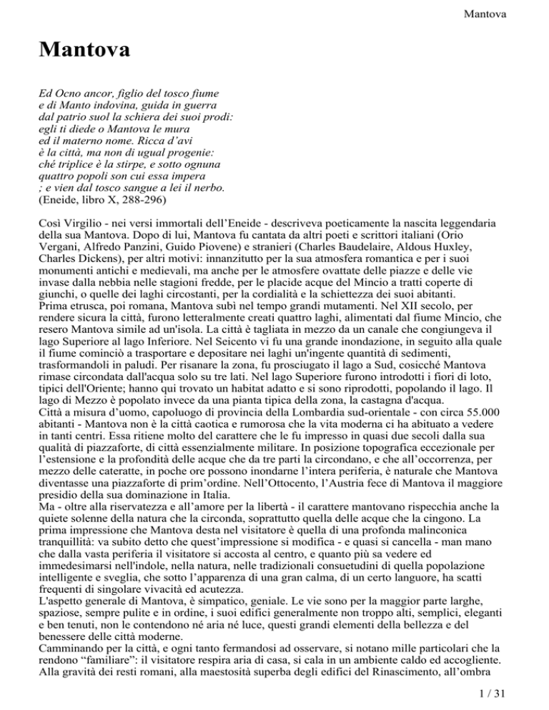 Mantova Mantova Ed Ocno ancor, figlio del tosco fiume e di Manto indovina, guida in guerra dal patrio suol la schiera dei suoi prodi: egli ti diede o Mantova le mura ed il materno nome. Ricca d’avi è la città, ma non di ugual progenie: ché triplice è la stirpe, e sotto ognuna quattro popoli son cui essa impera ; e vien dal tosco sangue a lei il nerbo. (Eneide, libro X, 288-296) Così Virgilio - nei versi immortali dell’Eneide - descriveva poeticamente la nascita leggendaria della sua Mantova. Dopo di lui, Mantova fu cantata da altri poeti e scrittori italiani (Orio Vergani, Alfredo Panzini, Guido Piovene) e stranieri (Charles Baudelaire, Aldous Huxley, Charles Dickens), per altri motivi: innanzitutto per la sua atmosfera romantica e per i suoi monumenti antichi e medievali, ma anche per le atmosfere ovattate delle piazze e delle vie invase dalla nebbia nelle stagioni fredde, per le placide acque del Mincio a tratti coperte di giunchi, o quelle dei laghi circostanti, per la cordialità e la schiettezza dei suoi abitanti. Prima etrusca, poi romana, Mantova subì nel tempo grandi mutamenti. Nel XII secolo, per rendere sicura la città, furono letteralmente creati quattro laghi, alimentati dal fiume Mincio, che resero Mantova simile ad un'isola. La città è tagliata in mezzo da un canale che congiungeva il lago Superiore al lago Inferiore. Nel Seicento vi fu una grande inondazione, in seguito alla quale il fiume cominciò a trasportare e depositare nei laghi un'ingente quantità di sedimenti, trasformandoli in paludi. Per risanare la zona, fu prosciugato il lago a Sud, cosicché Mantova rimase circondata dall'acqua solo su tre lati. Nel lago Superiore furono introdotti i fiori di loto, tipici dell'Oriente; hanno qui trovato un habitat adatto e si sono riprodotti, popolando il lago. Il lago di Mezzo è popolato invece da una pianta tipica della zona, la castagna d'acqua. Città a misura d’uomo, capoluogo di provincia della Lombardia sud-orientale - con circa 55.000 abitanti - Mantova non è la città caotica e rumorosa che la vita moderna ci ha abituato a vedere in tanti centri. Essa ritiene molto del carattere che le fu impresso in quasi due secoli dalla sua qualità di piazzaforte, di città essenzialmente militare. In posizione topografica eccezionale per l’estensione e la profondità delle acque che da tre parti la circondano, e che all’occorrenza, per mezzo delle cateratte, in poche ore possono inondarne l’intera periferia, è naturale che Mantova diventasse una piazzaforte di prim’ordine. Nell’Ottocento, l’Austria fece di Mantova il maggiore presidio della sua dominazione in Italia. Ma - oltre alla riservatezza e all’amore per la libertà - il carattere mantovano rispecchia anche la quiete solenne della natura che la circonda, soprattutto quella delle acque che la cingono. La prima impressione che Mantova desta nel visitatore è quella di una profonda malinconica tranquillità: va subito detto che quest’impressione si modifica - e quasi si cancella - man mano che dalla vasta periferia il visitatore si accosta al centro, e quanto più sa vedere ed immedesimarsi nell'indole, nella natura, nelle tradizionali consuetudini di quella popolazione intelligente e sveglia, che sotto l’apparenza di una gran calma, di un certo languore, ha scatti frequenti di singolare vivacità ed acutezza. L'aspetto generale di Mantova, è simpatico, geniale. Le vie sono per la maggior parte larghe, spaziose, sempre pulite e in ordine, i suoi edifici generalmente non troppo alti, semplici, eleganti e ben tenuti, non le contendono né aria né luce, questi grandi elementi della bellezza e del benessere delle città moderne. Camminando per la città, e ogni tanto fermandosi ad osservare, si notano mille particolari che la rendono “familiare”: il visitatore respira aria di casa, si cala in un ambiente caldo ed accogliente. Alla gravità dei resti romani, alla maestosità superba degli edifici del Rinascimento, all’ombra 1 / 31 Mantova dei Bonacolsi e allo splendore dei Gonzaga, fanno riscontro i versi lievi e sornioni di Teofilo Folengo, detto Merlin Cocai, il dotto monaco benedettino che “inventò” il latino maccheronico Quanto silenziose e malinconiche possono sembrare le vie dei quartieri periferici, altrettanto vivace ed animata si mostra - specialmente nelle ore mattutine e vespertine - la maggiore arteria, cioè la gran via trasversale che da Porta Pradella conduce a Porta San Giorgio. L’ampio Corso di Pradella (ora Corso Vittorio Emanuele II), tutto a porticati e ad edifici notevoli, nei quali primeggia lo stile del Cinquecento, la Via del Magistrato, la pittoresca Piazza delle Erbe, la grande, monumentale Piazza Sordello, fiancheggiata da gotiche costruzioni e dall’antico Palazzo Ducale dei Gonzaga, sono i punti nei quali, per affari o per diporto, si ritrova più volentieri la laboriosa e attiva popolazione mantovana, che - ad onta di tante disgraziate vicende vissute e sofferte nel tempo - conserva in sé un tesoro di energia, di amore per l’arte, di ospitalità gioiosa, di umanità, di spontanea amicizia ed allegria - soprattutto a tavola - di passione per il ricco e colorito dialetto, più emiliano che lombardo, incisivo ed arguto. Per altro verso, Mantova ha espresso una folta schiera di personaggi illustri, che in ogni tempo nel pensiero e nelle opere - diedero lustro alla città natale e all’Italia. Anche al di fuori della somma individualità di Virgilio, e di quella poeticamente leggendaria del trovatore Sordello, al di fuori dei Gonzaga e degli artisti che hanno fatto di Mantova un gioiello del Rinascimento, e un monumento all’umanità, la città non ha mai smentito l’affermazione dantesca, secondo la quale: In sul paese che Adice e Po riga, solea valore e cortesia trovarsi. Mantova è una città da conoscere, una città che si ama, una città raccolta e serena che ha sempre qualcosa da offrire, e in cui si torna sempre volentieri. 2 / 31 Mantova I