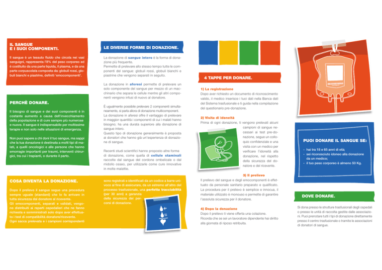 IL SANGUE E I SUOI COMPONENTI. LE DIVERSE FORME DI DONAZIONE. Il sangue è un tessuto fluido che circola nei vasi sanguigni, rappresenta l’8% del peso corporeo ed è costituito da una parte liquida, il plasma, e da una parte corpuscolata composta da: globuli rossi, globuli bianchi e piastrine, definiti ‘emocomponenti’. La donazione di sangue intero è la forma di donazione più frequente. Permette di prelevare allo stesso tempo tutte le componenti del sangue: globuli rossi, globuli bianchi e piastrine che vengono separati in seguito. La donazione in aferesi permette di prelevare un solo componente del sangue per mezzo di un macchinario che separa le cellule mentre gli altri componenti vengono infusi di nuovo al donatore. PERCHÈ DONARE. Il bisogno di sangue e dei suoi componenti è in costante aumento a causa dell’invecchiamento della popolazione e di cure sempre più numerose e nuove. Il sangue è indispensabile per moltissime terapie e non solo nelle situazioni di emergenza. Non puoi sapere a chi doni il tuo sangue, ma sappi che la tua donazione è destinata a molti tipi di malati, a quelli oncologici e alle persone che hanno emorragie importanti per traumi, interventi chirurgici, tra cui i trapianti, o durante il parto. COSA DIVENTA LA DONAZIONE. Dopo il prelievo il sangue segue una procedura sempre uguale (standard) che lo fa arrivare in tutta sicurezza dal donatore al ricevente. Gli emocomponenti, separati e validati, vengono distribuiti ai reparti ospedalieri che ne fanno richiesta e somministrati solo dopo aver effettuato i test di compatibilità donatore/ricevente. Ogni sacca prelevata e i campioni corrispondenti È ugualmente possibile prelevare 2 componenti simultaneamente, si parla allora di donazione multicomponent. La donazione in aferesi offre il vantaggio di prelevare in maggior quantità i componenti di cui i malati hanno bisogno; ha una durata superiore alla donazione di sangue intero. Questo tipo di donazione generalmente è proposta ai donatori che hanno già un’esperienza di donazione di sangue. Recenti studi scientifici hanno proposto altre forme di donazione, come quella di cellule staminali raccolte dal sangue del cordone ombelicale o dal midollo osseo, per utilizzarle come cure innovative in molte malattie. sono registrati e identificati da un codice a barre univoco al fine di assicurare, da un estremo all’altro del processo trasfusionale, una perfetta tracciabilità (per 30 anni) a garanzia zia della sicurezza dei per-corsi di donazione. 4 TAPPE PER DONARE. 1) La registrazione Dopo aver richiesto un documento di riconoscimento valido, il medico inserisce i tuoi dati nella Banca dati del Sistema trasfusionale e ti guida nella compilazione del questionario pre-donazione. 2) Visita di idoneità Prima di ogni donazione, ti vengono prelevati alcuni campioni di sangue necessari ai test pre-donazione, segue un colloquio confidenziale e una visita con un medico per verificare l’idoneità alla donazione, nel rispetto della sicurezza del donatore e del ricevente. 3) Il prelievo Il prelievo del sangue e degli emocomponenti è effettuato da personale sanitario preparato e qualificato. La procedura per il prelievo è semplice e innocua, il materiale utilizzato è monouso e permette di garantire l’assoluta sicurezza per il donatore. 4) Dopo la donazione Dopo il prelievo ti viene offerta una colazione. Ricorda che se sei un lavoratore dipendente hai diritto alla giornata di riposo retribuita. PUOI DONARE IL SANGUE SE: - hai tra 18 e 65 anni di età; - sei riconosciuto idoneo alla donazione da un medico; - il tuo peso corporeo è almeno 50 Kg. DOVE DONARE. Si dona presso le strutture trasfusionali degli ospedali o presso le unità di raccolta gestite dalle associazioni. Puoi prenotare tutti i tipi di donazione direttamente presso il centro trasfusionale o tramite le associazioni di donatori di sangue.