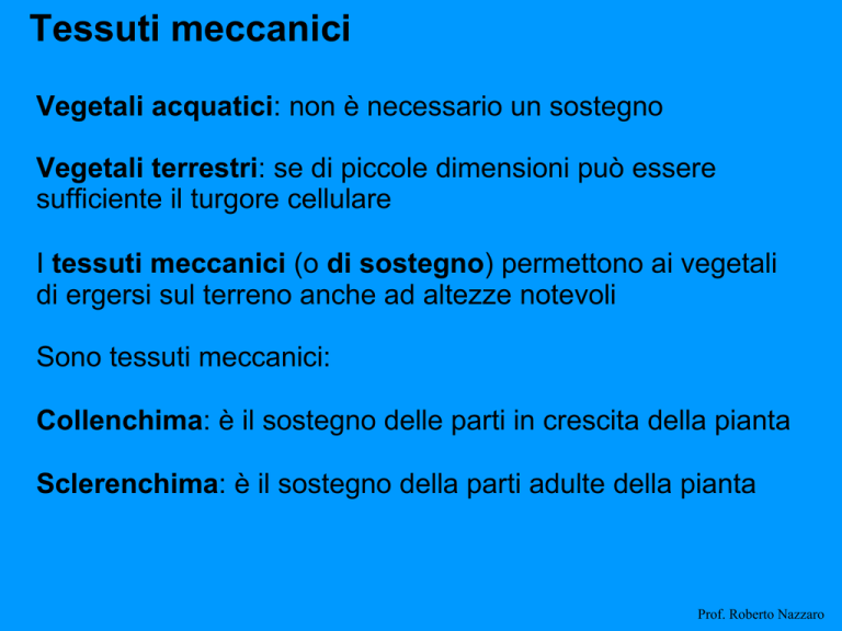 Tessuti meccanici Vegetali acquatici: non è necessario un sostegno Vegetali terrestri: se di piccole dimensioni può essere sufficiente il turgore cellulare I tessuti meccanici (o di sostegno) permettono ai vegetali di ergersi sul terreno anche ad altezze notevoli Sono tessuti meccanici: Collenchima: è il sostegno delle parti in crescita della pianta Sclerenchima: è il sostegno della parti adulte della pianta Prof. Roberto Nazzaro Tessuti meccanici Collenchima •formato da cellule vive •allungate secondo l’asse della pianta •solo con pareti primarie celluloso-pectiche, ispessite in modo irregolare Forma cordoni o un cilindro continuo sotto l’epidermide del fusto e dei piccioli delle foglie. La flessibilità ed elasticità delle pareti delle cellule permette al collenchima di sostenere gli organi in crescita seguendo il loro accrescimento. Prof. Roberto Nazzaro Tessuti meccanici Collenchima sezione longitudinale sezione trasversale Prof. Roberto Nazzaro Tessuti meccanici Sclerenchima Formato da cellule con pareti ispessite e dure (molto spesso lignificate) Presente nelle parti adulte della pianta Tessuto di notevole durezza, ma alquanto flessibile. Con la propria durezza protegge fusti, semi e frutti dagli erbivori, anche se questi ultimi ingeriscono tali parti. Prof. Roberto Nazzaro Tessuti meccanici Fibre Sclerenchima Elementi lunghi e sottili, terminanti a punta Lunghe da pochi millimetri ad alcuni centimetri Spesso riunite in fasci Localizzate nei fusti Slereidi Cellule con pareti molto ispessite, isodiametriche. Isolate o riunite in gruppi Spesso localizzate nei gusci dei frutto o nella polpa dei frutti. Prof. Roberto Nazzaro Tessuto conduttore Tessuti adibiti al trasporto della: linfa grezza (acqua e sali minerali) dalle radici alla sede della fotosintesi (XILEMA) linfa elaborata (acqua e zuccheri) dalle sedi della fotosintesi alle varie parti della pianta (FLOEMA) Prof. Roberto Nazzaro Tessuto conduttore Xilema o legno Tessuto composto da •tessuto vascolare che si occupa del trasporto della linfa grezza •tessuto meccanico •parenchima Floema o libro Tessuto composto da •tessuto vascolare che si occupa del trasporto della linfa elaborata •cellule compagne •fibre •parenchima Prof. Roberto Nazzaro Tessuto conduttore Xilema Gli elementi conduttori sono formati da cellule cilindriche, morte a maturità e disposte in modo da formare dei vasi Elementi conduttori dello xilema TRACHEIDI conservano una parete trasversale tra le cellule del vaso (vasi chiusi). Presenti nelle gimnosperme e nelle angiosperme più primitive. Prof. Roberto Nazzaro Tessuto conduttore Xilema Elementi conduttori dello xilema TRACHEE non presentano pareti trasversali tra le cellule del vaso (vasi aperti). Tipici elementi dello xilema delle angiosperme più evolute Prof. Roberto Nazzaro Tessuto conduttore Xilema Gli elementi conduttori hanno le pareti longitudinali lignificate. punteggiato La lignificazione non è uniforme. A seconda di come lignifica la parete si hanno vasi anulati, spiralati, punteggiati, ecc. reticolato spiralato anulato Prof. Roberto Nazzaro Tessuto conduttore Xilema I vasi punteggiati hanno le pareti quasi completamente lignificate, tranne che per piccoli aree circolari, le punteggiature areolate. Toro Nelle piante superiori meno evolute, Gimnosperme e Angiosperme primitive, la sottile parete di separazione che si trova al centro della punteggiatura mostra un ispessimento centrale. Prof. Roberto Nazzaro Tessuto conduttore Floema I vasi floematici sono composti, a differenza dei vasi xilematici, da cellule vive. Il trasporto della linfa elaborata avviene per mezzo di meccanismi attivi, che richiedono un dispendio di energia. Il tessuto cribroso è composto da •elementi cribrosi •cellule compagne Prof. Roberto Nazzaro Tessuto conduttore Floema Gli elementi cribrosi, nelle Angiosperme, sono sovrapposti a formare dei tubi cribrosi, mentre nelle altre piante vascolari si trovano delle singole cellule cribrose. Le cellule compagne collaborano con gli elementi cribrosi nella conduzione della linfa elaborata. Nelle cellule cribrose adulte vengono riassorbiti il nucleo e il tonoplasto, per cui la cellula, priva di nucleo e vacuolo, per le proprie funzioni metaboliche, deve essere coadiuvata dalla cellula compagna. Prof. Roberto Nazzaro Tessuto conduttore Floema In molti gruppi vegetali gli elementi cribrosi hanno una vita di un solo anno, infatti le placche cribrose vengono chiuse a causa della deposizione di uno strato di callosio, si forma il callo. In alcuni casi il callo viene riassorbito all’inizio della primavera succesiva alla sua formazione e l’elemento cribroso ritorna a funzionare. Prof. Roberto Nazzaro Tessuto conduttore Floema Le pareti degli elementi cribrosi sono sottili e di natura celluloso-pectica. Sulle pareti sono presenti delle aree meno ispessite, i pori cribrosi, che possono essere riuniti in gruppi (aree cribrose) Prof. Roberto Nazzaro Tessuto conduttore Floema Le cellule cribrose di diverse Angiosperme presentano nel protoplasto del materiale proteico (proteina P), che sembra avere la funzione di chiudere le placche cribrose in caso di ferita, per prevenire la perdita di linfa elaborata. Prof. Roberto Nazzaro