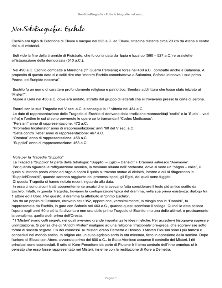 NonSoloBiografie - Tutte le biografie nel web... NonSoloBiografie: Eschilo Eschilo era figlio di Euforione di Eleusi e nacque nel 525 a.C. ad Eleusi, cittadina distante circa 20 km da Atene e centro dei culti misterici. Egli vide la fine della tirannide di Pisistrato, che fu continuata da Ippia e Ipparco (560 – 527 a.C.) e assistette all'istaurazione della democrazia (510 a.C.). Nel 490 a.C. Eschilo combatte a Maratona (1° Guerra Persiana) e forse nel 480 a.C. combatte anche a Salamina. A proposito di questa data si è soliti dire che “mentre Eschilo commbatteva a Salamina, Sofocle intonava il suo primo Peana, ed Euripide nasceva”. Eschilo fu un uomo di carattere profondamente religioso e patriottico. Sembra addirittura che fosse stato iniziato ai ‘Misteri'*. Muore a Gela nel 456 a.C. dove era andato, attratto dal gruppo di letterati che si trovavano presso la corte di Jerone. Esordì con le sue Tragedie nel V sec. a.C. e conseguì la 1° vittoria nel 484 a.C. Le date di rappresentazione delle Tragedie di Eschilo ci derivano dalla tradizione manoscritta(i ‘codici' e la ‘Suda' – vedi infra) e l'ordine in cui ci sono pervenute le opere ce lo tramanda il ‘Codex Medicaeus': “Persiani” anno di rappresentazione: 472 a.C. “Prometeo Incatenato” anno di rrappresentazione: anni '60 del V sec. a.C. “Sette contro Tebe” anno di rappresentazione: 467 a.C. “Orestea” anno di rappresentazione: 458 a.C. “Supplici” anno di rappresentazione: 463 a.C. Note per la Tragedia “Supplici” La Tragedia “Supplici” fa parte della tetralogia: “Supplici – Egizi – Danaidi” + Dramma satiresco “Amimone”. Per quanto riguarda la raffigurazione scenica, la troviamo situata nell' orchestra, dove si vede un “pàgos – colle”, il quale si intende posto vicino ad Argo e sopra il quale si trovano statue di divinità, intorno a cui si rifugeranno le “Supplici/Danaidi”, quando saranno raggiunte dai promessi sposi, gli Egizi, dai quali sono fuggite. Di questa Tragedia si hanno notizie recenti riguardo alla data. In essa ci sono alcuni tratti apparentemente arcaici che la avevano fatta considerare il testo più antico scritto da Eschilo. Infatti, in questa Tragedia, troviamo la configurazione tipica del dramma, nella sua prima esistenza: dialogo fra 1 attore ed il Coro. Per questo, il dramma fu attribuito al “primo Eschilo”. Ma da un papiro di Ossirinco, ritrovato nel 1952, appare che, verosimilmente, la trilogia con le “Danaidi”, fu rappresentata da Eschilo, in gara con Sofocle nel 463 a.C., quando questi sconfisse il collega. Quindi la data colloca l'opera negli anni '60 e ciò la fa diventare non una delle prime Tragedie di Eschilo, ma una delle ultime!, e precisamente la penultima, quella cioè, prima dell'Oresta. * I ‘Misteri' erano culti segreti, nei quali avevano grande importanza le idee mistiche. Per accedervi bisognava superare un'iniziazione. Si pensa che gli ‘Antichi Misteri' risalgano ad una religione ‘irrazionale' pre-greca, che sopravvisse sotto forma di società segrete. Gli dèi connessi ai ‘Misteri' erano Demètra e Diòniso. I Misteri Eleusini sono i più famosi e conosciuti nel mondo antico. In origine era un culto agricolo sorto in età micenea, fatto in occasione della semina. Dopo l'unione di Eleusi con Atene, avvenuta prima del 600 a.C., lo Stato Ateniese assunse il controllo dei Misteri. I riti principali sono sconosciuti. Il ratto di Kore-Persefone da parte di Plutone è il tema centrale dell'inno omerico; si è pensato che esso fosse rappresentato nei Misteri, insieme con la restituzione di Kore a Demetra. Pagina 1