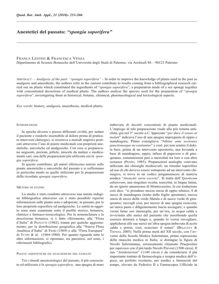 Quad. Bot. Amb. Appl., 21 (2010): 253-260. Anestetici del passato: “spongia soporifera” FRANCA LENTINI & FRANCESCA VENZA Dipartimento di Scienze Botaniche dell’Università degli Studi di Palermo, via Archirafi 88 – 90123 Palermo ABSTRACT. – Analgesic of the past: “spongia soporifera” – In order to improve the knowledge of plants used in the past as analgesic and anaesthetic, the authors refer in the current contribute to results coming from a bibliographical research carried out on plants which constituted the ingredients of “spongia soporifera”, a preparation made of a see sponge together with concentrated decoctions of medical plants. The authors analyse the species used for the preparation of “spongia soporifera”, investigating them in historical, botanic, chemical, pharmacological and toxicological aspects. Key words: history, analgesia, anaesthesia, medical plants. INTRODUZIONE In epoche diverse e presso differenti civiltà, per sedare il paziente e renderlo insensibile al dolore prima di praticare interventi chirurgici, si ricorreva a metodi empirici praticati attraverso l’uso di piante medicinali con proprietà anestetiche, narcotiche ed analgesiche. Con esse si preparavano unguenti, pozioni, pillole, miscele da inalare e medicamenti vari; una delle preparazioni più utilizzate era la spongia soporifera. In questo contributo, gli autori riferiscono notizie sulle piante anestetiche e narcotiche del passato e si soffermano in particolar modo su quelle utilizzate per la preparazione della ricordata spongia soporifera. METODO DI STUDIO Lo studio è stato condotto attraverso una mirata indagine bibliografica attraverso cui è stato possibile reperire informazioni sulle piante note e adoperate, in passato, per le loro proprietà soporifere ed analgesiche. Le entità in oggetto sono state esaminate sotto il profilo storico, botanico, chimico e farmaco-tossicologico. Per la nomenclatura e la descrizione botanica, si è fatto riferimento, alla “Flora d’Italia” di PIGNATTI (1982), tranne per qualche aggiornamento; per la distribuzione geografica alla “Nuova Flora Analitica d’Italia” di FIORI (1969) e alla “Flora Europaea” di TUTIN & al. (1964-1980). Per quanto riguarda tutte le altre informazioni, si riportano, tra parentesi, nel testo, i riferimenti bibliografici. PIANTE ANESTETICHE ED ANALGESICHE DEL PASSATO Tra i rimedi anestesiologici del passato, il più conosciuto ed utilizzato è la spongia soporifera, una spugna di mare imbevuta di decotti concentrati di piante medicinali. L’impiego di tale preparazione risale alla più remota antichità; già nel 3° secolo a.C. Ippocrate “per dare il sonno ai malati” indicava l’uso di una spugna impregnata di oppio e mandragora; Plinio consigliava “bibitur ante sectiones punctionesque ne sentiantur” e cioè: per non sentire il dolore bere, prima di un intervento operatorio, una bevanda a base di mandragora, oppio, infuso di papavero o di giusquiamo, somministrati puri o mescolati tra loro o con altre sostanze (PENSO, 1985). Preparazioni analoghe venivano utilizzate dai chirurghi medioevali; un rimedio soporifero ad uso di chi doveva essere sottoposto ad un intervento chirurgico, si trova in un codice pergamenaceo di materia medica “Anonymi varia excerta”. Si tratta dell’Ypnoticum adiutorum, una singolare ricetta, trascritta, in lingua latina, da un ignoto amanuense di Montecassino, la cui traduzione così dice: “si prendano mezza oncia di oppio tebaico, 8 di succo di mandragora (tratto dalle foglie spremute), mezza oncia di succo della verde Matala e di succo verde di giusquiamo; raccogli così, per mezzo di una spugna essiccata, un’unica pasta e diligentemente lascia asciugare; e quando vorrai farne uso immergila, per un’ora, in acqua calda e avvicinala alle narici del paziente che assorbendo quella essenza dormirà a lungo e, quando lo vorrai risvegliare, applicherai alle sue narici un’altra spugna imbevuta di aceto caldo e potrai, così, scacciare il sonno” (BELLUCCI & TIENGO, 2005). Nella prima metà del XII secolo, con l’avvento della Scuola Medica Salernitana, prima espressione della rinascita medica in Italia, si distingue la figura di Nicolò Salernitanus, erroneamente chiamato Praepositus per equivoco con il più tardo Nicolò Prevost (1500 circa). Il suo “Antidotarium” (1140 circa) è da considerarsi il più importante trattato di farmacologia e terapia medica dell’epoca, un perfetto ricettario, per medici e farmacisti del tempo, elevato da Federico II a Farmacopea Ufficiale in tutta Europa. In esso troviamo la formula di una spongia soporifera analoga a quella che compare nei codici cassinesi del IX secolo, ma con l’aggiunta di more acerbe, semi di lattuga, cicuta, succo di papavero e di edera. Una preparazione analoga, ma semplificata, per l’anestesia inalatoria è quella di Michele Scoto (1175-1223) che suggerisce di utilizzare oppio, mandragora e giusquiamo in parti uguali, pestate nel mortaio e mescolate con acqua. Al momento dell’ amputazione o dell’incisione, inzupparne uno straccio e mettetelo sotto le narici del paziente. Un’altra formula è la “Confectio soporis” di Gilberto Angelico (1180-1250) a base di oppio, giusquiamo, papavero, mandragora, edera, more di rovo, lattuga e cuscuta, di cui imbevere una spugna. Lo stesso consiglia, ma solo per uso orale: papavero, lattuga ed oppio (BELLUCCI,1983). SANTONI RUGIU & SYKES (2007), nel capitolo 6 “Some Notes on Anaesthesia“ della loro opera “A Hystory of Plastic Surgery”, fanno riferimento a una spongia soporifera preparata ed usata da Ugo dei Borgognoni e riportata nella “Cyrurgia” (1270) del figlio Teodorico, monaco domenicano, abile ed innovatore chirurgo. La ricetta di Teodorico viene considerata da BELLUCCI (1983), una riesumazione di quella di Montecassino o di quella di Nicolò Salernitanus ma con l’aggiunta di succo di coconidio e di semi di lapazio. La ricetta così re