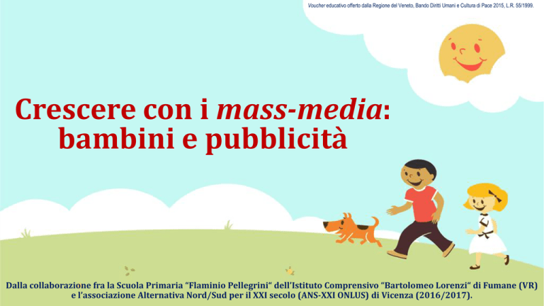 Voucher educativo offerto dalla Regione del Veneto, Bando Diritti Umani e Cultura di Pace 2015, L.R. 55/1999. Crescere con i mass-media: bambini e pubblicità Dalla collaborazione fra la Scuola Primaria “Flaminio Pellegrini“ dell’Istituto Comprensivo “Bartolomeo Lorenzi“ di Fumane (VR) e l’associazione Alternativa Nord/Sud per il XXI secolo (ANS-XXI ONLUS) di Vicenza (2016/2017). OBIETTIVI DEL PROGETTO Aiutare i bambini a sviluppare un atteggiamento critico nei confronti dei messaggi mediatici, con particolare riferimento alle pubblicità. Aiutare i bambini ad essere consumatori responsabili e consapevoli, capaci di scegliere e a non farsi troppo condizionare dalla pubblicità. Ricorrere ai messaggi multimediali per fare didattica in modo innovativo. Chi ha partecipato Le insegnanti della Scuola Primaria “Flaminio Pellegrini“ dell’Istituto Comprensivo “Bartolomeo Lorenzi“ di Fumane (VR): Francesca Salzani Caterina Turina Elena Fantin 5° A 22 Franca Gasparini 5° B 24 Totale 46 Con la collaborazione di: Silvia Bernardini Marco Cantarelli dell’associazione ANS-XXI ONLUS di Vicenza. Classi Alunni Di cosa ci siamo occupati? Pubblicità e cibo Perché abbiamo scelto proprio l’alimentazione? Le fasi del nostro lavoro 6. 5. 4. 3. 2. 1. I bambini hanno portato a scuola riviste di vario tipo. A gruppi, i bambini hanno sfogliato le riviste; sono state così selezionate pubblicità riguardanti: bevande, dolci (in particolare biscotti); snack; pasta; carne; latte, formaggi e yogurt; frutta e verdura. Quindi, abbiamo consultato fonti diverse per conoscere quali cibi sono consigliati per una corretta alimentazione. Navigando in Internet abbiamo scoperto la nuova Piramide Alimentare. Dopodiché, i bambini, dapprima a gruppi e poi individualmente, hanno realizzato dei testi pubblicitari di alcuni alimenti. Incuriositi dagli spot televisivi ne abbiamo analizzati alcuni insieme. Dando seguito ad un altro progetto realizzato a scuola, i bambini hanno creato un fumetto pubblicitario. La nuova piramide alimentare Da essa abbiamo imparato che convivialità, stagionalità e cibi locali sono i principi cui si ispira la nuova piramide alimentare. Alla base di tutto c’è l’acqua che non deve mai mancare nell’arco della giornata. Poi dovremmo consumare ogni giorno due porzioni di frutta, due o anche più porzioni di verdura e una o più di pane, pasta, riso e altri cereali, preferibilmente integrali. Tra i cibi da consumare con regolarità ogni giorno ci sono anche il latte e i suoi derivati, l’olio di oliva, noci, erbe, spezie, aglio, cipolla (per ridurre il sale). Una volta alla settimana dovremmo, invece, portare in tavola pollo e carni bianche (2 porzioni) pesce, uova, legumi (più di 2 porzioni), carne rossa, salumi (1 porzione). Ha cura della sua vita chi ha cura della sua salute I bambini hanno confrontato i loro piatti giornalieri con quello proposto dalla “sana alimentazione“. Molti hanno osservato che metà del “piatto sano“ è occupato da frutta e verdura, mentre nella loro alimentazione questi cibi vengono assunti saltuariamente e non in queste porzioni. Gli alimenti meno graditi sono il pesce e i legumi. Raramente i bambini mangiano cereali integrali. Pubblicità e piramide alimentare Un esperimento scolastico Abbiamo deciso assieme ai bambini di prendere spunto dalla piramide alimentare ufficiale, costruendone una tutta nostra. Come abbiamo fatto? Semplice: ogni alunno doveva scrivere su un foglio i primi 3 alimenti/bevande di cui ricordava di averne visto la pubblicità. Poi, abbiamo raccolto le risposte in classe e costruito una piramide alimentare basata sugli spot televisivi. Ci siamo basati sugli spot ricordati dai bambini per 2 motivi: 1) innanzitutto, ognuno di loro ricorda ciò cui assiste con maggior frequenza; 2) inoltre, i ragazzi dicono di ricordare ciò che a loro piace maggiormente. Ma vediamo com’è andata! Infatti, vedremo come dalle risposte fornite non faticheremo a risalire agli spot pubblicitari più trasmessi negli ultimi tempi… O, forse, è più vero l’opposto? Ovvero che il loro gusto è fortemente influenzato dagli spot che vedono? La piramide alimentare basata sugli spot Gli snack dolci la fanno da padroni, piazzandosi al piano terra: ovvero, se la paragonassimo ad una piramide alimentare reale, sarebbero da consumare più volte durante al giorno, a volontà. Di questo gruppo fanno parte merendine e biscotti industriali di vario tipo (Kinder, Mulino Bianco). Accanto agli snack dolci è immancabile la Coca-Cola . Il piano superiore è occupato da snack salati (Pringles, San Carlo, Fonzie) e pasta (De Cecco, Barilla ). La campagna pubblicitaria ABC della merenda Parmareggio ha avuto un buon risultato, stando a quanto riferito dai bambini. Paragonandola alla piramide alimentare “ufficiale”, possiamo dire che il livello occupato dai latticini è più o meno lo stesso. Ciò, tuttavia, non vale per le bevande zuccherate… La Fanta si posiziona appena sopra il secondo piano! L’ultimo piano è occupato da quelli che dovrebbero essere gli alimenti da consumare una volta ogni tanto, solo per piacere. Paradossale come ci sia la frutta (ricordata solo da 3 alunni, soprattutto la mela Melinda ), che invece andrebbe consumata più volte al giorno e in tutte le piramidi alimentari ufficiali figura al piano terra. Accompagnano la frutta un hamburger – in rappresentanza dei fast-food… – e la carne. Questo non è, comunque, un brutto segno; anzi, potrebbe essere una buona raccomandazione dietetica… Ma, forse, ciò dipende dalla scarsa presenza in TV di questo tipo di alimenti, più che dalle preferenze dei ragazzi! In conclusione Con questo piccolo esperimento abbiamo spiegato ai bambini la piramide alimentare “ufficiale” in un modo divertente, capendone il senso attraverso paradosso e provocazione. I ragazzi hanno compreso come gli spot pubblicitari di alimenti (e la pubblicità in generale) possano essere ingannevoli, in qua