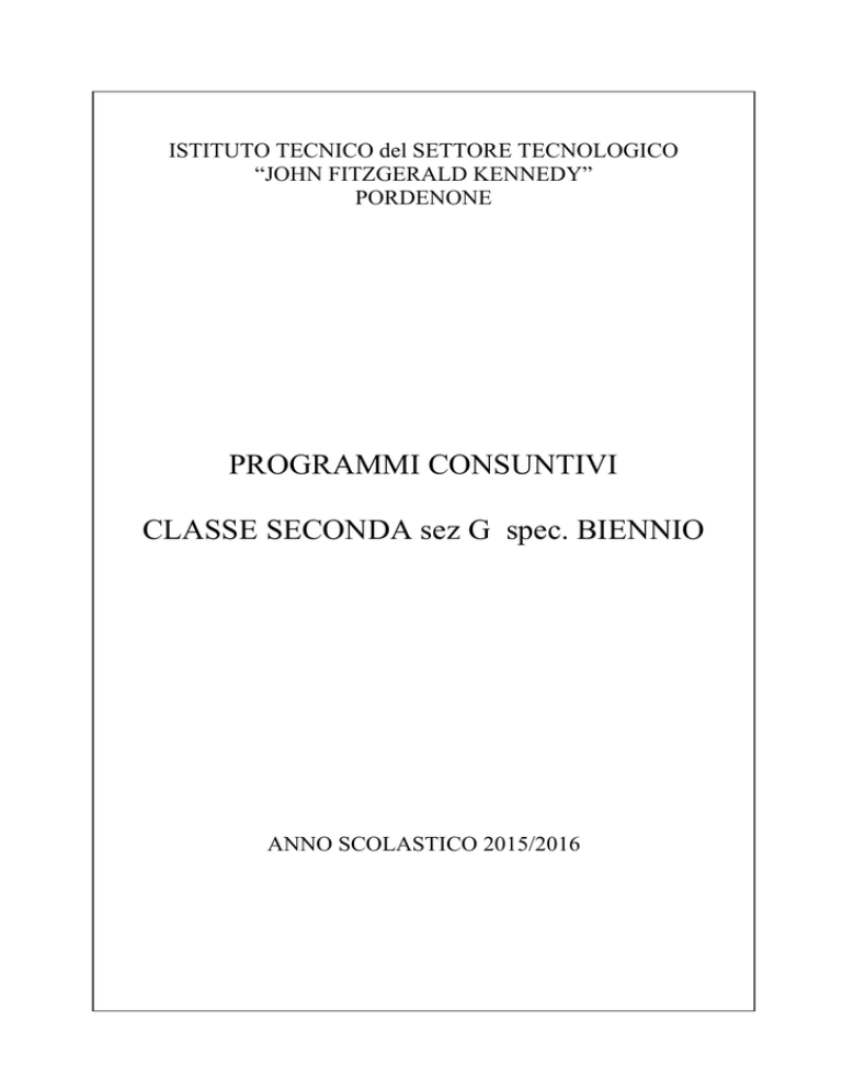 ISTITUTO TECNICO del SETTORE TECNOLOGICO “JOHN FITZGERALD KENNEDY” PORDENONE PROGRAMMI CONSUNTIVI CLASSE SECONDA sez G spec. BIENNIO ANNO SCOLASTICO 2015/2016 PROGRAMMA CONSUNTIVO A.S. 2015-2016 MATERIA: INGLESE INSEGNANTE: GRIZZO EMANUELA CLASSE: 2 G Dal libro di testo English Plus Pre -Intermediate ( OUP) sono state svolte le seguenti UNITA': Unit Grammar Vocabulary 5 You’re a star 6 School life present perfect already, still, present perfect and since present perfect with just, yet with for show business star qualities suffixes: meaning continuous should v must have to / don’t have to should, must and don’t have to School life : verbs School life. Compound nouns Consolidation 4 - 6 7 Take action will v might 1st conditional be going to will v be going to action and protest phrasal verbs: a campaign prefixes: un-,in-, im- 8 Film and fiction like and would like can, could and will be able to 2nd conditional books and films: genres books and films. features suffixes: -er, -or 9 Art present simple passive and past simple passive: positive, negative and questions art.: nouns, adjectives synonyms Consolidation 7 - 9 Culture and Clil 5 The cult of celebrities (pag 191) 6 An English comprehensive ( pag 192) 8 lights, camera, action ( pag 194) conversation classes : Florida, American school Films / videos “ The dead poets society” Short videos about British culture from English on the street ( BBC) and English plus pre-intermediate Group work Power Point presentations about group work about the Trajan’s Column and Roman times. Written and oral comprehension / production activities Pet format. Individual reading activities from “ Club” “ Speak Up “. Videos from “ Word on the street” (https//learnenglish.britishcouncil.org) and English Plus DVD ROM Pordenone, 7 giugno 2016 L’insegnante Emanuela Grizzo Programma consuntivo di matematica classe 2°G Insegnante: Elena Darduin A.S. 2015-16 Algebra: Le equazioni di 1°grado: equazioni letterali ed equazioni fratte; semplici problemi risolvibili con equazioni. Disequazioni di 1°grado: disequazioni intere, fratte; sistemi di disequazioni. I numeri reali: definizioni e operazioni. I sistemi di I° grado: sistemi di primo grado risolti mediante il metodo di sostituzione, riduzione, confronto e di Cramer. Sistemi di equazioni intere e frazionarie. Radicali: introduzione ai numeri reali, definizioni, radicali assoluti, proprietà invariantiva, espressioni con radicali, radicali simili, operazioni con i radicali, trasporto dentro e fuori il segno di radice, radice di radice, potenza di radicali, razionalizzazione dei denominatori, potenze ad esponente frazionario, introduzione ai radicali algebrici, equazioni con coefficienti irrazionali. Equazioni di II°grado: forme incomplete e forma canonica, formula risolutiva, risoluzione di equazioni incomplete e complete, relazione tra le soluzioni e i coefficienti di un'equazione di II°grado, scomposizione di un trinomio di secondo grado, sistemi di II°grado, applicazione delle equazioni di II°grado alla soluzione di problemi geometrici. Risoluzione di problemi di I°e II°grado mediante sistemi. Equazioni di grado superiore al secondo: equazioni binomie, trinomie , equazioni biquadratiche e loro soluzione, equazioni riducibili ad equazioni di grado inferiore. Disequazioni : segno del trinomio di secondo grado, soluzioni di disequazioni di secondo grado (metodo della scomposizione in fattori), disequazioni frazionarie, sistemi di disequazioni, disequazioni di grado superiore al secondo (metodo della scomposizione in fattori). Geometria analitica: il piano cartesiano, il punto medio di un segmento, coordinate dei punti, distanza tra due punti, equazione della retta, rette particolari (bisettrici dei quadranti, rette parallele agli assi), retta passante per due punti, retta passante per un punto con coefficiente angolare noto, rette parallele, rette perpendicolari, intersezione tra rette, distanza punto-retta. Il grafico della parabola: vertice , intersezione con gli assi, asse di simmetria. Geometria Circonferenza e cerchio: definizioni e proprietà preliminari, confronto fra archi, proprietà delle circonferenze, posizioni reciproche di una retta e di una circonferenza, posizioni reciproche di due circonferenze, angoli alla circonferenza. Punti notevoli di un triangolo. Poligoni inscritti e circoscritti. Criteri di inscrivibilità e circoscrivibilità dei quadrilateri. Poligoni regolari. Equivalenza delle superfici piane. Teoremi di Euclide e di Pitagora. Teorema di Talete e sue conseguenze. Le trasformazioni geometriche : le isometrie nel piano. Similitudini tra figure piane: triangoli simili; i tre criteri di similitudine. I teoremi di Euclide con le similitudini. Soluzione di problemi. Testo: “Matematica blu” vol.2 Bergamini –Trifone ed. .Zanichelli Pordenone, 6 giugno 2016 PROGRAMMA CONSUNTIVO MATERIA: scienze integrate CHIMICA INSEGNANTI: MARIA ALBANESE-SERENA GAIARIN a.s.2015-2016 CLASSE 2G UD0 RIPASSO Ripasso moli esercizi di conversione.Le soluzioni e le concentrazioni esercizi. Le particelle dell'atomo e i primi modelli atomici dal modello atomico di Thomson al modello atomico a orbitali. UD1 IL SISTEMA PERIODICO Verso il sistema periodico. La moderna tavola periodica.Periodicità della configurazione elettronica. Le proprietà periodiche.Metalli non metalli semimetalli. UD2 I LEGAMI CHIMICI I gas nobili e la regola dell'ottetto.Il legame covalente ( puro polare dativo).La scala dell'elettronegatività.Il legame ionico.Il legame metallico. La tavola periodica e i legami tra gli elementi. UD3 LA FORMA DELLE MOLECOLE E LE FORZE INTERMOLECOLARI la forma delle molecole. Molecole polari e non polari. Le forze intermolecolari.le attrazioni fra gli atomi e tra le molecole. UD4 LA NOMENCLATURA DEI COMPOSTI la valenza e il numero di ossidazione.La nomenclatura dei compossti binari e ternari. UD5 LE SOLUZIONI La concentrazione delle soluzioni. Le soluzioni elettrolitiche e il 