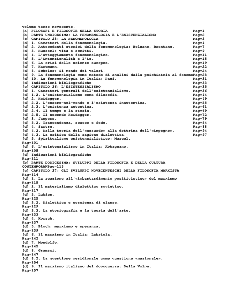 volume terzo novecento. [a] FILOSOFI E FILOSOFIE NELLA STORIA Pag=1 [b] PARTE UNDICESIMA: LA FENOMENOLOGIA E L'ESISTENZIALISMO Pag=2 [c] CAPITOLO 25: LA FENOMENOLOGIA Pag=3 [d] 1. Caratteri della fenomenologia. Pag=4 [d] 2. Antecedenti storici della fenomenologia: Bolzano, Brentano. Pag=7 [d] 3. Husserl: vita e scritti. Pag=9 [d] 4. L'atteggiamento fenomenologico. Pag=11 [d] 5. L'intenzionalità e l'io. Pag=15 [d] 6. La crisi delle scienze europee. Pag=19 [d] 7. Hartmann. Pag=22 [d] 8. Scheler: il mondo dei valori. Pag=24 [d] 9. La fenomenologia come metodo di analisi dalla psichiatria al fenomePag=28 [d] 10. La fenomenologia in Italia: Paci. Pag=31 [d] Indicazioni bibliografiche Pag=33 [c] CAPITOLO 26: L'ESISTENZIALISMO Pag=35 [d] 1. Caratteri generali dell'esistenzialismo. Pag=36 [d] 1.2. L'esistenzialismo come filosofia. Pag=44 [d] 2. Heidegger. Pag=49 [d] 2.2. L'essere-nel-mondo e l'esistenza inautentica. Pag=55 [d] 2.3. L'esistenza autentica. Pag=61 [d] 2.4. Il tempo e la storia. Pag=69 [d] 2.5. Il secondo Heidegger. Pag=72 [d] 3. Jaspers. Pag=79 [d] 3.2. Trascendenza, scacco e fede. Pag=84 [d] 4. Sartre. Pag=88 [d] 4.2. Dalla teoria dell'«assurdo» alla dottrina dell'«impegno». Pag=94 [d] 4.3. La critica della ragione dialettica. Pag=97 [d] 5. Spiritualismo esistenzialistico: Marcel. Pag=101 [d] 6. L'esistenzialismo in Italia: Abbagnano. Pag=105 [d] Indicazioni bibliografiche Pag=111 [b] PARTE DODICESIMA: SVILUPPI DELLA FILOSOFIA E DELLA CULTURA CONTEMPORANPag=113 [c] CAPITOLO 27: GLI SVILUPPI NOVECENTESCHI DELLA FILOSOFIA MARXISTA Pag=114 [d] 1. La reazione all'«imbastardimento positivistico» del marxismo Pag=115 [d] 2. Il materialismo dialettico sovietico. Pag=117 [d] 3. Lukács. Pag=125 [d] 3.2. Dialettica e coscienza di classe. Pag=129 [d] 3.3. La storiografia e la teoria dell'arte. Pag=133 [d] 4. Korsch. Pag=137 [d] 5. Bloch: marxismo e speranza. Pag=139 [d] 6. Il marxismo in Italia: Labriola. Pag=142 [d] 7. Mondolfo. Pag=145 [d] 8. Gramsci. Pag=147 [d] 8.2. La questione meridionale come questione «nazionale». Pag=154 [d] 9. Il marxismo italiano del dopoguerra: Della Volpe. Pag=157 [d] Indicazioni bibliografiche Pag=160 [c] CAPITOLO 28: LA SCUOLA DI FRANCOFORTE E HABERMAS Pag=162 [d] 1. Caratteri generali. Pag=163 [d] 2. Horkheimer. Pag=166 [d] 2.2. L'ultimo Horkheimer: «Marx si è illuso». Pag=170 [d] 3. Adorno. Pag=174 [d] 3.2. La critica dell'«industria culturale» e la teoria dell'arte. Pag=176 [d] 4. Marcuse. Pag=179 [d] 4.2. La critica del «Sistema» e il «Grande Rifiuto». Pag=183 [d] 4.3. L'ultimo Marcuse: i compiti di una «Nuova Sinistra». Pag=186 [d] 5. Habermas. Pag=188 [d] Indicazioni bibliografiche Pag=192 [c] CAPITOLO 29: MOMENTI E FIGURE DELLA TEOLOGIA E DELLA FILOSOFIA Pag=195 [d] 1. La sfida dell'ateismo e della storia: il rinnovamento della teologiPag=196 [d] 2. La teologia protestante nella prima metà del secolo. Pag=200 [d] 2.2. Bultmann. Pag=203 [d] 3. Teologia e filosofia cattolica nella prima metà del secolo. Pag=206 [d] 3.1. Il neo-tomismo e Maritain. Pag=207 [d] 3.2. La neo-scolastica in Italia: Bontadini. Pag=214 [d] 3.3. Il personalismo. Pag=216 [d] 3.4. Teilhard de Chardin. Pag=218 [d] 4. La teologia protestante nella seconda metà del secolo. Pag=222 [d] 4.2. La teologia della secolarizzazione. Pag=225 [d] 4.3. La teologia della «morte di Dio». Pag=227 [d] 5. La teologia cattolica della seconda metà del secolo. Pag=231 [d] 5.1. Rahner: la «svolta antropologica». Pag=233 [d] 5.2. Balthasar: estetica e teologia. Pag=236 [d] 6. Sviluppi della teologia contemporanea. Pag=238 [d] 6.2. La teologia della liberazione. Pag=242 [d] 6.3. La teologia nera e la filosofia nera della liberazione. Pag=247 [d] Indicazioni bibliografiche Pag=253 [c] CAPITOLO 30: LO STRUTTURALISMO Pag=254 [d] 1. Caratteri generali. Pag=255 [d] 2. De Saussure. Pag=261 [d] 3. La scuola di Praga e di Copenhagen. Pag=265 [d] 4. Lévi-Strauss. Pag=267 [d] 5. Foucault. Pag=271 [d] 6. Lacan. Pag=276 [d] 7. Althusser. Pag=278 [d] 8. Sviluppi della linguistica odierna: Chomsky. Pag=282 [d] 9. Post-strutturalismo e post-metafisica in Derrida. Pag=285 [d] Indicazioni bibliografiche Pag=287 [c] CAPITOLO 31: POPPER Pag=289 [d] 1. Vita e opere. Pag=290 [d] 2. Popper e il neopositivismo: vecchi e nuovi punti di vista. Pag=291 [d] 3. Popper ed Einstein. Pag=293 [d] 4. Il criterio di falsificabilità. Pag=295 [d] 4.2. Osservazioni. Pag=298 [d] 5. Inesistenza ed esistenza di un « metodo» scientifico. Pag=301 [d] 6. Approfondimento: la critica epistemologica al marxismo e alla Pag=304 [d] 7. Il rifiuto dell'induzione e la teoria della mente come «faro» e nonPag=308 [d] 8. Scienza e verità: il fallibilismo. Pag=311 [d] 9. Epistemologia e filosofia politica. Pag=318 [d] 10. Storicismo, utopia e violenza. Pag=319 [d] 11. La teoria della democrazia. Pag=323 [d] 12. Il riformismo gradualista. Pag=327 [d] Indicazioni bibliografiche Pag=333 [c] CAPITOLO 32: L'EPISTEMOLOGIA POST-POSITIVISTICA Pag=336 [d] 1. Caratteri generali. Pag=337 [d] 2. Kuhn: le rivoluzioni scientifiche. Pag=339 [d] 3. Lakatos: i programmi di ricerca. Pag=344 [d] 4. Feyerabend: contro il «Metodo». Pag=347 [d] Indicazioni bibliografiche Pag=353 [c] CAPITOLO 33: GLI SVILUPPI FILOSOFICI DELL'ERMENEUTICA CONTEMPORANEA Pag=355 [d] 1. L'ermeneutica: da discorso tecnico a filosofia generale. Pag=356 [d] 2. Gadamer. Pag=358 [d] 2.2. Pregiudizi, autorità e tradizione. Pag=361 [d] 2.3. Le condizioni del comprendere. Pag=364 [d] 2.4. Essere e linguaggio. Pag=368 [d] 3. Altre linee di tendenza dell'ermeneutica odierna. Pag=370 [d] Indicazioni bibliografiche Pag=374 </IND> FILOSOFI E FILOSOFIE NELLA STORIA di Nicola Abbagnano e Giovanni Fornero VERSIONE ELETTRONICA - PER I NON VEDENTI - CURATA DA AMEDEO MARCHINI VOLUME TERZO PARTE UNDICESIMA: LA FENOMENOLOGIA E L'ESISTENZIALISMO «Fenomenologia significa dunque... lasciar vedere da se stesso ciò che si manifesta, così come si manifesta». (Heidegger). «Situazioni come q