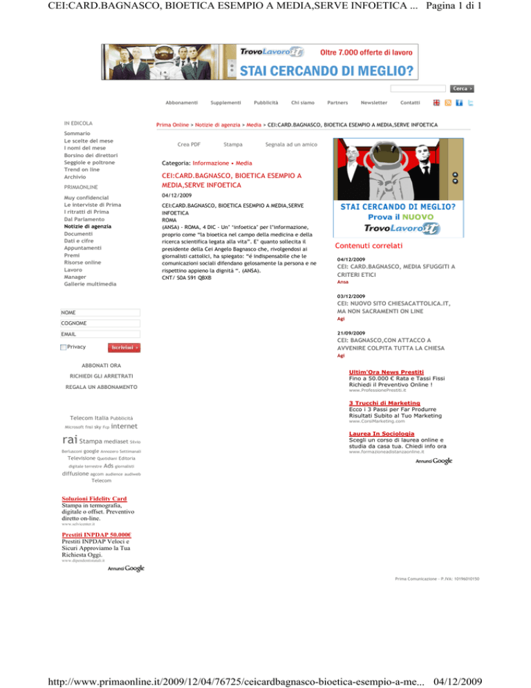 CEI:CARD.BAGNASCO, BIOETICA ESEMPIO A MEDIA,SERVE INFOETICA ... Pagina 1 di 1 Abbonamenti IN EDICOLA Supplementi Pubblicità Chi siamo Partners Newsletter Contatti Prima Online > Notizie di agenzia > Media > CEI:CARD.BAGNASCO, BIOETICA ESEMPIO A MEDIA,SERVE INFOETICA Sommario Le scelte del mese I nomi del mese Borsino dei direttori Seggiole e poltrone Trend on line Archivio Crea PDF Stampa Segnala ad un amico Categoria: Informazione • Media CEI:CARD.BAGNASCO, BIOETICA ESEMPIO A MEDIA,SERVE INFOETICA PRIMAONLINE 04/12/2009 Muy confidencial Le interviste di Prima I ritratti di Prima Dal Parlamento Notizie di agenzia Documenti Dati e cifre Appuntamenti Premi Risorse online Lavoro Manager Gallerie multimedia CEI:CARD.BAGNASCO, BIOETICA ESEMPIO A MEDIA,SERVE INFOETICA ROMA (ANSA) - ROMA, 4 DIC - Un’ ‘infoetica’ per l’informazione, proprio come “la bioetica nel campo della medicina e della ricerca scientifica legata alla vita”. E’ quanto sollecita il presidente della Cei Angelo Bagnasco che, rivolgendosi ai giornalisti cattolici, ha spiegato: “é indispensabile che le comunicazioni sociali difendano gelosamente la persona e ne rispettino appieno la dignità “. (ANSA). CNT/ S0A S91 QBXB Contenuti correlati 04/12/2009 CEI: CARD.BAGNASCO, MEDIA SFUGGITI A CRITERI ETICI Ansa 03/12/2009 CEI: NUOVO SITO CHIESACATTOLICA.IT, MA NON SACRAMENTI ON LINE NOME Agi COGNOME 21/09/2009 EMAIL CEI: BAGNASCO,CON ATTACCO A AVVENIRE COLPITA TUTTA LA CHIESA Privacy Agi ABBONATI ORA REGALA UN ABBONAMENTO Ultim'Ora News Prestiti Fino a 50.000 € Rata e Tassi Fissi Richiedi il Preventivo Online ! Telecom Italia Pubblicità 3 Trucchi di Marketing Ecco i 3 Passi per Far Produrre Risultati Subito al Tuo Marketing RICHIEDI GLI ARRETRATI Microsoft fnsi sky Fcp www.CorsiMarketing.com internet rai Stampa mediaset Silvio Berlusconi google Annozero Settimanali Televisione www.ProfessionePrestiti.it Laurea In Sociologia Scegli un corso di laurea online e studia da casa tua. Chiedi info ora www.formazioneadistanzaonline.it Quotidiani Editoria digitale terrestre Ads giornalisti diffusione agcom audience audiweb Telecom Soluzioni Fidelity Card Stampa in termografia, digitale o offset. Preventivo diretto on-line. www.selvicenter.it Prestiti INPDAP 50.000€ Prestiti INPDAP Veloci e Sicuri Approviamo la Tua Richiesta Oggi. www.dipendentistatali.it Prima Comunicazione - P.IVA: 10196010150 http://www.primaonline.it/2009/12/04/76725/ceicardbagnasco-bioetica-esempio-a-me... 04/12/2009