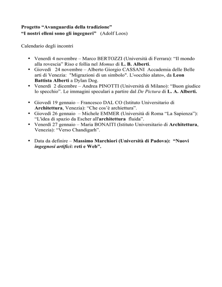Progetto “Avanguardia della tradizione” “I nostri elleni sono gli ingegneri” (Adolf Loos) Calendario degli incontri • Venerdì 4 novembre – Marco BERTOZZI (Università di Ferrara): “Il mondo alla rovescia” Riso e follia nel Momus di L. B. Alberti. • Giovedì 24 novembre – Alberto Giorgio CASSANI Accademia delle Belle arti di Venezia: "Migrazioni di un simbolo". L'«occhio alato», da Leon Battista Alberti a Dylan Dog. • Venerdì 2 dicembre – Andrea PINOTTI (Università di Milano): “Buon giudice lo specchio”. Le immagini speculari a partire dal De Pictura di L. A. Alberti. • Giovedì 19 gennaio – Francesco DAL CO (Istituto Universitario di Architettura, Venezia): “Che cos’è archiettura”. • Giovedì 26 gennaio – Michele EMMER (Università di Roma “La Sapienza”): “L'idea di spazio da Escher all'architettura fluida”. • Venerdì 27 gennaio – Maria BONAITI (Istituto Universitario di Architettura, Venezia): “Verso Chandigarh”. • Data da definire – Massimo Marchiori (Università di Padova): “Nuovi ingegnosi artifici: reti e Web”.