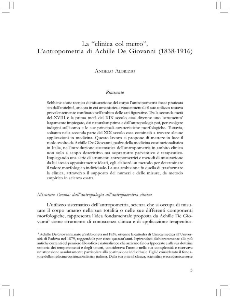 La clinica col metro. Lantropometria di Achille De Giovanni (1838-1916) ANGELO ALBRIZIO Riassunto Sebbene come tecnica di misurazione del corpo lantropometria fosse praticata sin dall'antichità, ancora in età umanistica e rinascimentale il suo utilizzo restava prevalentemente confinato nell'ambito delle arti figurative. Tra la seconda metà del XVIII e la prima metà del XIX secolo essa divenne uno strumento largamente impiegato, dai naturalisti prima e dall'antropologia poi, per svolgere indagini sulluomo e le sue principali caratteristiche morfologiche. Tuttavia, soltanto nella seconda parte del XIX secolo essa cominciò a trovare alcune applicazioni in medicina. Questo lavoro si propone di mettere in luce il ruolo svolto da Achille De Giovanni, padre della medicina costituzionalistica in Italia, nell'introduzione sistematica dell'antropometria in ambito clinico non solo a scopo descrittivo ma soprattutto preventivo e terapeutico. Impiegando una serie di strumenti antropometrici e metodi di misurazione da lui stesso appositamente ideati, egli elaborò un metodo per determinare il valore morfologico individuale. La sua ambizione fu quella di trasformare la clinica, attraverso il supporto dei numeri e delle misure, da metodo empirico in scienza esatta. Misurare luomo: dallantropologia allantropometria clinica Lutilizzo sistematico dellantropometria, scienza che si occupa di misurare il corpo umano nella sua totalità o nelle sue differenti componenti morfologiche, rappresenta lidea fondamentale proposta da Achille De Giovanni1 come strumento di conoscenza clinica e di applicazione terapeutica. Achille De Giovanni, nato a Sabbioneta nel 1838, ottenne la cattedra di Clinica medica allUniversità di Padova nel 1879, reggendola per circa quarantanni. Ispirandosi dichiaratamente alle più antiche correnti del pensiero filosofico e naturalistico che arrivano fino a Ippocrate e alla sua dottrina unitaria dei temperamenti e degli umori, considerava luomo nella sua complessità e riservava unattenzione assolutamente particolare alla costituzione individuale. Egli è considerato il fondatore della medicina costituzionalistica italiana. Dalla sua attività clinica, scientifica e accademica sorse 1 5 MEDICINA & STORIA - SAGGI Sebbene come tecnica di misurazione del corpo essa fosse già praticata sin dallantichità, il suo utilizzo restava per lo più confinato nellambito delle arti figurative. La sua storia clinica non andava molto lontano nel passato. Effettivamente, non sembra che in epoca antica e durante il medioevo i medici avessero labitudine di misurare i pazienti e furono gli artisti, in particolar modo gli scultori, ad approfondire lo studio delle forme umane nella ricerca dei canoni estetici per la costruzione di modelli di perfezione e di armonia. Ancora in età umanistica e rinascimentale, i suoi scopi erano prevalentemente artistici, come in Leon Battista Alberti (1404-1472) o Leonardo da Vinci (14521519), che nel Trattato della pittura elaborò i famosi canoni antropometrici che derivavano da una lunga esperienza negli studi anatomici, e Albrecht Dürer (1471-1528), uno dei pionieri dellantropometria2. Quando nel 1870 Adolphe Quetelet (1796-1874), che aveva frequentato latelier di un pittore prima di passare alle scienze matematiche accettando una cattedra allAthénée Royal di Gand, pubblicò la sua Anthropométrie ou mesure des différentes facultés de lhomme, cercando di ricostruirne le origini, non potè non far riferimento alla perfezione raggiunta dagli Anciens che avaient des notions plus exactes que les modernes sur la théorie des proportions humaines3. Egli si spinse fino al Silpi Sastri sanscrito, nel quale il corpo umano veniva suddiviso in 480 parti, e allo schema sulle proporzioni umane di Policleto e il suo celebre canone. Quetelet contribuì in modo decisivo allo sviluppo dellantropologia quantitativa e dellantropometria nella seconda metà del XIX secolo. Il suo homme moyen e la sua legge binominale, espressa graficamente dalla curva a campana e già applicata alla fisica sociale e alla statistica morale, si imposero presto come riferimento per tutta la classificazione antropometrica. Il suo testo fu celebrato come vero e proprio trionfo delle matematiche4. Soltanto nel XVIII secolo lantropometria aveva cominciato ad affermarsi anche in ambito scientifico. Abbandonato il meccanicismo di matrice cartesiana che, istituendo una differenza qualitativa tra gli animali e la specie umana aveva a lungo isolato questultima dallindagine naturalistica, si profilava la una vera e propria scuola che ebbe seguito soprattutto in Giacinto Viola (1870-1943), Pietro Castellino (1864-1933), Luigi Messedaglia (1874-1956) e Nicola Pende (1880-1970). Sulla vita si veda Galdi, 1926; Gasbarrini, 1952; Agosta del Forte, 1978. Sugli sviluppi del costituzionalismo in Italia si veda Federspil, 1989; Bonuzzi, 1999. 2 Gysel, 1997, p. 100. 3 Quetelet, 1870, p. 33. 4 Pogliano, 1986, p. 64. 6 ANGELO ALBRIZIO - LA CLINICA COL METRO possibilità di fare ricerche quantitative anche sulluomo, in quanto oggetto naturale. In effetti, lanatomia comparata aveva già da tempo messo in evidenza che tra luomo e alcune scimmie antropomorfe vi erano analogie significative. Per il compimento di questo processo di mondanizzazione delluomo fu determinante la classificazione della specie umana allinterno del regno animale, la cui continuità fu definitivamente sancita da Linneo quando, nella decima edizione del Systema naturae, cancellò la linea di demarcazione, già labilissima, che ancora esisteva tra la nostra specie e le scimmie5. Il passaggio dalla fisiognomica tradizionale settecentesca alla craniologia comparata, ovvero dallo studio dei caratteri mobili del volto allanalisi dei caratteri rigidi del cranio, rappresenta un esempio emblematico dellesigenza di indagare luomo non solo da un punto di vista prettamente qualitativo ma anche e soprattutto quantitativo. Era stato Johann Caspar Lavater (1741-1801), c