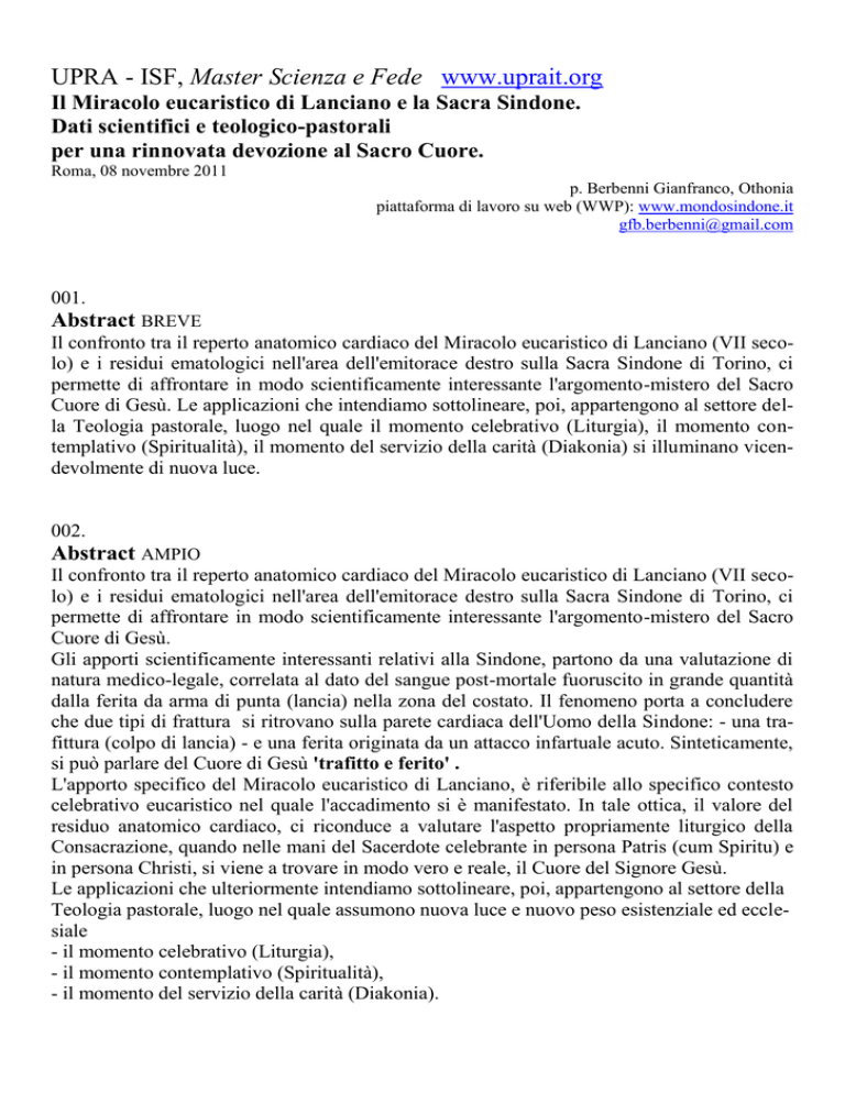 UPRA - ISF, Master Scienza e Fede www.uprait.org Il Miracolo eucaristico di Lanciano e la Sacra Sindone. Dati scientifici e teologico-pastorali per una rinnovata devozione al Sacro Cuore. Roma, 08 novembre 2011 p. Berbenni Gianfranco, Othonia piattaforma di lavoro su web (WWP): www.mondosindone.it gfb.berbenni@gmail.com 001. Abstract BREVE Il confronto tra il reperto anatomico cardiaco del Miracolo eucaristico di Lanciano (VII secolo) e i residui ematologici nell'area dell'emitorace destro sulla Sacra Sindone di Torino, ci permette di affrontare in modo scientificamente interessante l'argomento-mistero del Sacro Cuore di Gesù. Le applicazioni che intendiamo sottolineare, poi, appartengono al settore della Teologia pastorale, luogo nel quale il momento celebrativo (Liturgia), il momento contemplativo (Spiritualità), il momento del servizio della carità (Diakonia) si illuminano vicendevolmente di nuova luce. 002. Abstract AMPIO Il confronto tra il reperto anatomico cardiaco del Miracolo eucaristico di Lanciano (VII secolo) e i residui ematologici nell'area dell'emitorace destro sulla Sacra Sindone di Torino, ci permette di affrontare in modo scientificamente interessante l'argomento-mistero del Sacro Cuore di Gesù. Gli apporti scientificamente interessanti relativi alla Sindone, partono da una valutazione di natura medico-legale, correlata al dato del sangue post-mortale fuoruscito in grande quantità dalla ferita da arma di punta (lancia) nella zona del costato. Il fenomeno porta a concludere che due tipi di frattura si ritrovano sulla parete cardiaca dell'Uomo della Sindone: - una trafittura (colpo di lancia) - e una ferita originata da un attacco infartuale acuto. Sinteticamente, si può parlare del Cuore di Gesù 'trafitto e ferito' . L'apporto specifico del Miracolo eucaristico di Lanciano, è riferibile allo specifico contesto celebrativo eucaristico nel quale l'accadimento si è manifestato. In tale ottica, il valore del residuo anatomico cardiaco, ci riconduce a valutare l'aspetto propriamente liturgico della Consacrazione, quando nelle mani del Sacerdote celebrante in persona Patris (cum Spiritu) e in persona Christi, si viene a trovare in modo vero e reale, il Cuore del Signore Gesù. Le applicazioni che ulteriormente intendiamo sottolineare, poi, appartengono al settore della Teologia pastorale, luogo nel quale assumono nuova luce e nuovo peso esistenziale ed ecclesiale - il momento celebrativo (Liturgia), - il momento contemplativo (Spiritualità), - il momento del servizio della carità (Diakonia). . 003. Lanciano e il reperto anatomico somatico, riconoscibile come miocardio ed endocardio. Per il nostro argomento focalizziamo le analisi sul Reperto 'carne miracolosa'. Fig. 1. Lanciano. Reliquiario. Fig, 2. Carne miracolosa, costituita da una sezione trasversale di muscolo cardia- co. 003. [continua] La seguente macro Didascalia è costituita da testo originale estratto dalla Relazione scientifica (Linoli 1971]: Le reliquie a noi tramandate sono mantenute in un reliquiario in argento di elegante fattura, alto cm. 63 e largo cm. 44, che comprende nella parte alta, un ostensorio rotondeggiante, ove è contenuto fra due vetri, la Carne miracolosa; mentre in basso, fra due angeli oranti, è presente un calice con coperchio, dove è contenuto il Sangue miracoloso, profondamente modificato per la antichità del Campione. In particolare, la Carne del Miracolo Eucaristico di Lanciano ha forma rotondeggiante, con diametri di mm. 55 e 60, colorito giallo-bruno-marrone, con qualche ombreggiatura di maggiore intensità. La lamina* di tessuto appare assottigliata e ampiamente lacerata nella zona centrale, a causa della retrazione del tessuto verso la periferia, ove appare sollevato in pliche circolari. E' però evidente che nella Carne miracolosa di Lanciano è riconoscibile un viscere cavo, visto in sezione trasversale, istologicamente riconosciuto come cuore, del quale infatti, è intravedibile in basso la zona propria del ventricolo sinistro, più spessa, ed in alto, la zona propria del ventricolo destro, più sottile come di norma. [...] Nella zona marginale della 'lamina circolare' del tessuto si notano piccoli fori, evidente segno, in antico, del passaggio di chiodi. La consistenza del tessuto è uniformemente duro-lignea, richiedendosi una forte pressione con la lama per asportare due piccolissimi frammenti per la successiva indagine. [...] Sul Tessuto miracoloso ha agito la lunga serie di secoli intercorsi, che ha portato a[lla] dispersione di [piccole] parti anatomiche onde la attuale unica cavità. Inoltre, risulta evidente che il Tessuto non protetto da alcuno involucro, ha perduto tutta l’acqua della quale ogni tessuto è dotato, mummificandosi, e quindi riducendosi nelle dimensioni, che infatti sono molto inferiori al cuore normale. La superficie è liscia, mai sollevata irregolarmente, screpolata o incisa. 004. Un vero cuore umano Le ricerche istologiche (Linoli 1971 e Linoli 1981) hanno accertato in modo autorevole che la Carne si compone di un tessuto mesodermale riconoscibile come cuore, con miocardio ed endocardio, sezionato in maniera sottile come periti chirurghi potrebbero fare, disponendo di attrezzatura adeguata.1 005. Dati macro istologici Il cuore nell‟organismo umano possiede il primato di maggiore energia prodotta, sotto forma di pompa molto efficace nel distribuire il sangue in tutto il sistema circolatorio, venoso e arterioso. Il suo continuo lavoro, diurno e notturno, per decine di anni di seguito, è reso possibile dalla straordinaria efficienza del muscolo cardiaco, composto da una struttura muscolare striata e da una liscia. Modalità sinciziali, ossia di unione stretta tra le fibre muscolari, ne aumentano ancor più la potenza aspirativa e inspirativa.2 1 Per completezza informativa riportiamo per intero la sintesi delle ricerche 1971: Sono descritti gli aspetti macroscopici della Carne e del Sangue del Miracolo Eucaristico di Lanciano (VIII secolo)