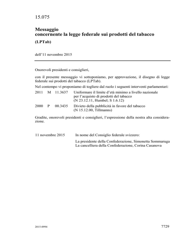 15.075 Messaggio concernente la legge federale sui prodotti del tabacco (LPTab) dell’11 novembre 2015 Onorevoli presidenti e consiglieri, con il presente messaggio vi sottoponiamo, per approvazione, il disegno di legge federale sui prodotti del tabacco (LPTab). Nel contempo vi proponiamo di togliere dal ruolo i seguenti interventi parlamentari: 2011 M 11.3637 Uniformare il limite d’età minimo a livello nazionale per l’acquisto di prodotti del tabacco (N 23.12.11, Humbel; S 1.6.12) 2000 P 00.3435 Divieto della pubblicità in favore del tabacco (N 15.12.00, Tillmanns) Gradite, onorevoli presidenti e consiglieri, l’espressione della nostra alta considerazione. 11 novembre 2015 In nome del Consiglio federale svizzero: La presidente della Confederazione, Simonetta Sommaruga La cancelliera della Confederazione, Corina Casanova 2015-0994 7729 Compendio Il presente disegno di legge federale sui prodotti del tabacco (D-LPTab) disciplina i requisiti relativi ai prodotti del tabacco al fine di ridurne il consumo e di limitare gli effetti nocivi che ne derivano. Il disegno è stato elaborato a seguito della revisione del diritto sulle derrate alimentari che esclude i prodotti del tabacco dal suo campo d’applicazione; si ispira all’attuale disciplinamento dei prodotti del tabacco introducendovi alcuni cambiamenti e novità riguardanti soprattutto le sigarette elettroniche, le restrizioni supplementari in materia di pubblicità, promozione delle vendite e sponsorizzazione connesse ai prodotti del tabacco nonché il divieto di vendita di questi prodotti a minorenni. Il presente disegno di legge disciplina i requisiti relativi ai prodotti del tabacco allo scopo di ridurne il consumo e limitare gli effetti nocivi che ne derivano. Questi due scopi riflettono la volontà d’innalzare il livello di protezione della salute della popolazione, in particolare dei giovani, attraverso provvedimenti più efficaci. Secondo una stima dell’Ufficio federale di statistica, in Svizzera il tabagismo causa poco meno di 9500 decessi all’anno, il 39 per cento dei quali imputabili a malattie cardiovascolari, il 42 per cento a tumori e il 19 per cento a malattie delle vie respiratorie. Il consumo di tabacco è quindi la principale causa evitabile di decesso nel nostro Paese. I prodotti del tabacco sono beni di consumo particolari che, se consumati secondo la loro destinazione, mettono a rischio la salute. Occorre quindi che siano regolamentati diversamente dalle derrate alimentari. Dal 1955 i prodotti del tabacco sono disciplinati dalla legislazione sulle derrate alimentari e dal 1995 sono oggetto di un’ordinanza specifica. La legge del 9 ottobre 1992 sulle derrate alimentari è stata sottoposta a una revisione totale, che prevede l’esclusione dei prodotti del tabacco dal suo campo di applicazione e un periodo transitorio di quattro anni dalla sua entrata in vigore per permettere l’elaborazione di una legge specifica sui prodotti del tabacco. Da un lato, il D-LPTab riprende in parte le norme in materia di derrate alimentari relative ai prodotti del tabacco e, dall’altro, introduce alcuni cambiamenti e novità. I principi dell’attuale legislazione sulle derrate alimentari sono in gran parte ripresi. L’obbligo del controllo autonomo rimane invariato e il divieto di inganno viene ripreso, seppur limitato agli aspetti concernenti la salute. Non vi è motivo di scostarsi neanche dall’attuale sistema di esecuzione della legge da parte dei Cantoni e dell’Amministrazione federale delle dogane. Il presente D-LPTab introduce tre principali novità: – 7730 estensione del campo d’applicazione della legge: le sigarette elettroniche contenenti nicotina e prodotti simili che vengono equiparati ai prodotti del tabacco e disciplinati in modo analogo ad essi; il Consiglio federale deve inoltre poter applicare determinate disposizioni della nuova legge a sigarette elettroniche senza nicotina, qualora la protezione della salute lo richieda; – restrizioni concernenti la pubblicità, la promozione delle vendite e la sponsorizzazione connesse ai prodotti del tabacco: le disposizioni si orientano al grado di protezione esistente a livello internazionale, riprendono alcune restrizioni introdotte dai Cantoni e tengono in considerazione gli attuali media e vettori pubblicitari; – divieto di consegna ai minorenni: viene stabilito un limite di età uniforme in tutta la Svizzera, misura che soddisfa lo standard internazionale e dei Paesi confinanti. È prevista anche la possibilità di effettuare test d’acquisto per controllare il rispetto del divieto di consegna ai minorenni. Inoltre sono modificati alcuni aspetti del diritto vigente: – solo la messa a disposizione sul mercato è disciplinata (compresa l’importazione); – la lista positiva degli additivi e il sistema di autorizzazione per le altre sostanze vengono eliminati. Il Consiglio federale potrà tuttavia stabilire il tenore massimo di additivi oppure vietare determinati ingredienti; – la procedura di opposizione prevista dall’attuale sistema di esecuzione è sostituita dall’ordinaria procedura di ricorso; – d’ora in poi non sarà più ammesso il consumo di sigarette elettroniche nei luoghi pubblici chiusi. A livello cantonale e internazionale, le normative nell’ambito della lotta contro il consumo di tabacco tendono ad essere più restrittive ed efficaci. Introducendo nel disegno della normativa restrizioni in materia di pubblicità, promozione delle vendite e sponsorizzazione così come il divieto di consegna ai minorenni la Confederazione si allinea alle normative vigenti nei Cantoni, la maggior parte dei quali ha legiferato in questi due ambiti. Al contempo, la Svizzera si adegua all’evoluzione europea e internazionale: i Paesi confinanti hanno infatti già vietato la vendita di prodotti del tabacco ai minorenni, conformemente alla convenzione quadro dell’Organizzazione Mondiale della Sanità (OMS) per la limitazione del consumo 