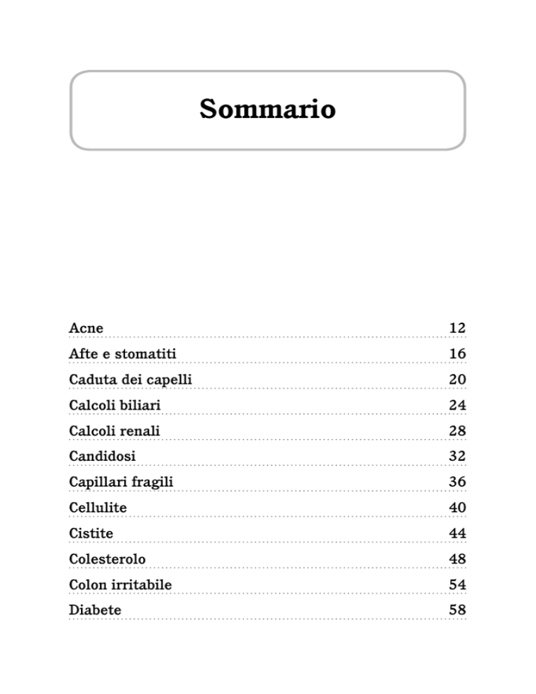 Sommario Acne 12 Afte e stomatiti 16 Caduta dei capelli 20 Calcoli biliari 24 Calcoli renali 28 Candidosi 32 Capillari fragili 36 Cellulite 40 Cistite 44 Colesterolo 48 Colon irritabile 54 Diabete 58 Sommario Digestione difficile (dispepsia) 64 Disturbi cardiocircolatori 68 Disturbi della tiroide (ipertiroidismo e ipotiroidismo) 72 Dolori articolari (artrite e artrosi) 76 Emorroidi 80 Gastrite 84 Grasso addominale 88 Influenza 92 Insonnia 96 Intolleranze alimentari (al nichel, ai lieviti, al grano, al latte) 100 Ipertensione 106 Ipotensione 110 Mal di testa 114 Menopausa (nervosismo, secchezza vaginale, palpitazioni, insonnia) 118 Osteoporosi 122 Reflusso gastroesofageo 126 Reumatismi 130 Sommario Sindrome premestruale (dolori, gonfiori, depressione, irritabilità) 134 Sovrappeso 138 Stanchezza e stress 142 Stipsi 146 Note del lettore 150 Introduzione I cibi: il nostro miglior “farmaco” F ai fatica ad addormentarti? Oppure ti svegli spesso durante la notte o troppo presto al mattino? Ti capita spesso, dopo i pasti, di avvertire gonfiori e fastidiosi bruciori? Forse non lo sai, ma il tuo problema può essere risolto in un modo semplice e naturale: a tavola! L’alimentazione, infatti, gioca un ruolo chiave nel mantenimento della buona salute e del benessere, come dimostrato anche dalle più recenti ricerche scientifiche. Alimentarsi per la salute non significa, però, proibizione o restrizione, ma dovrebbe avere come scopo l’acquisizione di una cultura e di uno stile di vita che valorizzino anche “il piacere di stare a tavola”. Quindi, non vi vogliamo mettere “a dieta” o mortificare il palato, ma semplicemente indicare piccoli consigli nutrizionali per migliorare il proprio stile di vita a chi ha problemi di colesterolo, gastrite, intolleranze e stanchezza. Scoprirai leggendo questo libro che stare bene è semplice! Ecco come usare questo libro S fogliando le pagine di questo manuale di facile consultazione, imparerai a conoscere gli alimenti che ti fanno stare bene, che diventano la tua prima medicina, come dice8 Introduzione va Ippocrate, il padre della medicina moderna, quelli che ti aiutano a riequilibrare gradualmente corpo e mente. Abbiamo pensato di occuparci di quei disturbi più diffusi e fastidiosi (che qui troverai presentati in ordine alfabetico) dalla cistite al colon irritabile, dai disturbi cardiocircolatori a quelli della tiroide, dai calcoli renali al reflusso gastroesofageo, all’osteoporosi fino alla stipsi. • Per ciascuna patologia troverai una breve descrizione dei sintomi e delle cause principali che la scatenano, che ti permetterà di conoscere meglio il tuo problema. • Ti verranno dati di volta in volta alcuni consigli alimentari generali, da mettere in pratica tutti i giorni per trattare con successo il tuo disturbo. • Ti diremo poi che cosa devi fare in pratica a tavola per mantenere o recuperare il benessere e la salute. A questo proposito troverai un elenco schematico dei cibi che ti curano (quelli che non devono mai mancare nella propria alimentazione quotidiana) con la descrizione dettagliata del perché fanno bene e quelli, invece, da evitare o comunque da assumere con moderazione, a seconda dei casi. • Chi soffre di colon irritabile dovrebbe adottare una dieta costituita da cibi semplici, digeribili e con un contenuto di fibra variabile a seconda della fase del disturbo. Chi è soggetto a crisi frequenti di mal di testa dovrebbe eliminare dalla propria dieta i cibi ricchi di istamina, come cioccolato, formaggi fermentati, crostacei e molluschi, pomodoro, vino rosso e birra. Ma anche il latte, in persone sensibili, può scatenare l’attacco. E così via. • Troverai sempre anche una sezione in cui ti suggeriremo quali sostituzioni salutari è meglio fare, se non puoi assumere un determinato alimento. Per esempio, se soffri di in9 Introduzione sonnia e non puoi bere il caffè tradizionale, ti consigliamo di sostituirlo con quello d’orzo o con altre bevande che non interferiscono con il “buon sonno”. Come sempre, ricordiamo che i suggerimenti e le indicazioni pratiche che trovate in questo libro non si sostituiscono alle prescrizioni del medico, al quale è d’obbligo rivolgersi in presenza di sintomi per la diagnosi corretta e la terapia appropriata. Buona lettura! 10 Caduta dei capelli I cibi che la prevengono L a vita dei capelli prevede una nascita, un periodo di crescita più o meno lungo e, infine, la morte del capello. In condizioni di normalità poco dopo la caduta di un capello se ne produce un altro e questo andamento ciclico può verificarsi per tutta la vita. Ed è normale che nelle stagioni di transizione (autunno-primavera) la caduta aumenti. Tuttavia la perdita dei capelli può essere dovuta non solo al normale ciclo vitale, ma a carenze o eccessi nutrizionali, stress, uso di alcuni farmaci, gravidanza, depressione, problemi alla tiroide e fumo. In tutti i casi, un corretto stile alimentare può essere d’aiuto. DA FARE TUTTI I GIORNI • Seguire una dieta bilanciata in tutti i suoi componenti: proteine (carni bianche, pesce, uova, latte, ricotta, fiocchi di latte, yogurt, tofu e legumi), glucidi (pane, pasta, riso integrali), lipidi (soprattutto olio extravergine d’oliva), sali minerali e vitamine dei vegetali. • Assicurarsi che l’alimentazione fornisca buone quantità di questi tre sali minerali: silicio presente in cereali integrali, cavoli, frutta e legumi; calcio contenuto in verdure a foglia verde, latte e latticini; ferro presente in carne, tuorlo d’uovo, verdure e legumi. Importanti anche zinco e magnesio, che si trovano in frutti di mare, cereali integrali, verdure a foglia verde, alghe, cacao e frutta oleosa (mandorle, noci ecc.). 20 caduta dei capelli i Consigli alimentari Il capello, per essere sano, deve mantenere integri tutti i microelementi del quale è composto. L’alimentazione è determinante, perché le sostanze sintetizzate e distribuite nel corpo attraverso il sangue vanno a nutrire