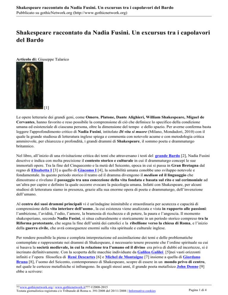 Shakespeare raccontato da Nadia Fusini. Un excursus tra i capolavori del Bardo Pubblicato su gothicNetwork.org (http://www.gothicnetwork.org) Shakespeare raccontato da Nadia Fusini. Un excursus tra i capolavori del Bardo Articolo di: Giuseppe Talarico [1] Le opere letterarie dei grandi geni, come Omero, Platone, Dante Alighieri, William Shakespeare, Miguel de Cervantes, hanno favorito e reso possibile la comprensione di ciò che definisce lo specifico della condizione umana ed esistenziale di ciascuna persona, oltre la dimensione del tempo e dello spazio. Per averne conferma basta leggere l'approfondimento critico di Nadia Fusini, intitolato Di vita si muore (Milano, Mondadori, 2010) con il quale la grande studiosa di letteratura inglese spiega e commenta con notevole acume e con metodologia critica ammirevole, per chiarezza e profondità, i grandi drammi di Shakespeare, il sommo poeta e drammaturgo britannico. Nel libro, all’inizio di una rivisitazione critica dei temi che attraversano i testi del grande Bardo [2], Nadia Fusini descrive e indica con molta precisione il contesto storico e culturale in cui il drammaturgo concepì le sue immortali opere. Tra la fine del Cinquecento e la metà del Seicento, epoca in cui si passa in Gran Bretagna dal regno di Elisabetta I [3] a quello di Giacomo I [4], la sensibilità umana conobbe uno sviluppo notevole e fondamentale. In questo periodo storico il teatro ed il dramma divengono il medium ed il linguaggio che dimostrano e rivelano il passaggio tra una concezione della vita fondata e basata sul rito e sul cerimoniale ad un’altra per capire e definire la quale occorre evocare la psicologia umana. Infatti con Shakespeare, per alcuni studiosi di letteratura siamo in presenza, grazie alla sua enorme opera di poeta e drammaturgo, dell’invenzione dell’umano. Al centro dei suoi drammi principali vi è un'indagine inimitabile e straordinaria per acutezza e capacità di comprensione della vita interiore dell’uomo , la cui esistenza viene analizzata e vista in rapporto alle passioni: l’ambizione, l’avidità, l’odio, l’amore, la bramosia di ricchezza e di potere, la paura e l’angoscia. Il momento shakesperiano, secondo Nadia Fusini, si situa culturalmente e storicamente in un periodo storico compreso tra la Riforma protestante, che segna la fine dell’unità dei cattolici e la ribellione verso la chiesa di Roma, e l’inizio della guerra civile, che avrà conseguenze enormi sulla vita spirituale e culturale inglese. Per rendere possibile la piena e completa interpretazione ed assimilazione dei temi e delle problematiche contemplate e rappresentate nei drammi di Shakespeare, è necessario tenere presente che l’ordine spirituale su cui si basava la società medievale, in cui la relazione tra l’umano ed il divino era priva di dubbi ed incertezze, si è incrinato definitivamente. Con la scoperta delle macchie individuate da Galileo Galilei [5]nei vasti orizzonti infiniti e l’opera filosofica di René Descartes [6] e Michel de Montaigne [7] insieme a quella di Giordano Bruno [8], l’uomo del Seicento, contemporaneo di Shakespeare, scopre di essere in un mondo privo di centro, nel quale le certezze metafisiche si infrangono. In quegli stessi anni, il grande poeta metafisico John Donne [9] ebbe a scrivere: ?? www.gothicnetwork.org | www.gothicnetwork.it??? ©2008-2015 Testata giornalistica registrata c/o Tribunale di Roma n. 391/2008 del 20/11/2008 | Informativa cookies Pagina 1 di 4 Shakespeare raccontato da Nadia Fusini. Un excursus tra i capolavori del Bardo Pubblicato su gothicNetwork.org (http://www.gothicnetwork.org) "And new Philosophy calls all in doubt,/The Element of fire is quite put out,/The Sunne is lost, and th'earth, and no man's wit/Can well direct him, where to look for it." (E la nuova filosofia mette tutto in dubbio,/l'elemento del fuoco è affatto estinto,/il sole è perduto, e la terra; e nessun ingegno umano/può indicare all'uomo dove andarlo a cercare, An Anatomy of the World, tr. it. di Giorgio Melchiori, vv. 205-208). In più parti del suo profondo saggio critico la Fusini pone l’accento sul rapporto tra l’opera del grande drammaturgo e la temperie culturale che caratterizzava la società inglese del suo tempo. Il mondo viene concepito come un vasto teatro, sul quale ogni uomo recita una parte, il cui regista è un Dio invisibile, nella cui esistenza affiorano, secondo la sensibilità del tempo in cui visse il grande Bardo, grazie alle opere dei grandi ingegni e dei grandi pensatori, i primi dubbi e le inevitabili inquietudini esistenziali che ne derivano. Come ci ricordano gli immortali versi di Come vi piace (As You Like It): "All the world's a stage,/And all the men and women merely players./They have their exits and their entrances;/And one man in his time plays many parts,/His acts being seven ages". (Tutto il mondo è teatro. E gli uomini e le donne puri istrioni tutti: hanno le loro entrate e le loro uscite di scena, e ognuno fa diverse parti nella vita, che è un dramma in sette atti, II, 7, vv. 142-146, tr. it. di C. V. Lodovici). Per spiegare quest'idea del mondo inteso come un Teatro, che ricorre spesso nel suo libro, la Fusini menziona e cita, commentandolo con grande profondità, un dipinto celeberrimo di Matthias Grünewald [10]: Cristo Che Porta La Croce. In questo dipinto compare una folla che, in preda all’eccitazione ed incapace di trattenere la propria aggressività e perfidia, umilia e deride il figlio dell’uomo , destinato da Dio al supremo sacrificio per la salvezza dell'umanità. Per capire in che senso Shakespeare può, a giusto titolo, essere considerato il genio capace di inventare un nuovo linguaggio umano, non bisogna dimenticare che, mentre la tragedia antica è nata in Grecia dalla conversione del rito di Dioniso, nel quinto e quarto secolo a. C., il dramma moderno deriva dalla riproduzione e dall’imitazione della passione di Cristo. Nei drammi principali di Shakespeare