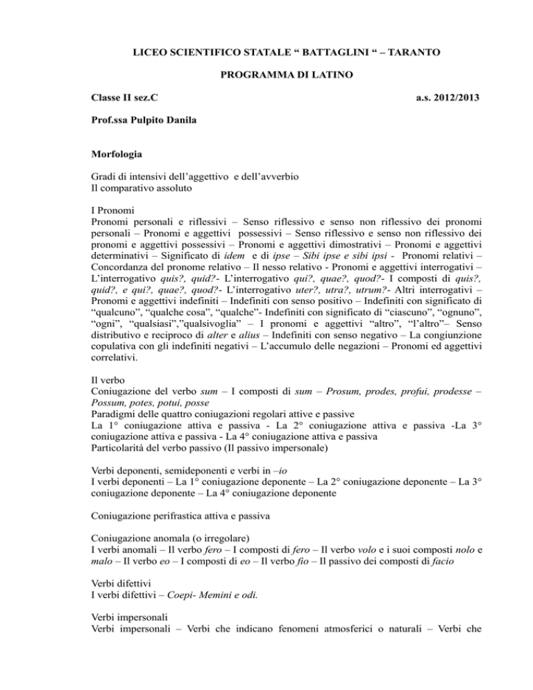 LICEO SCIENTIFICO STATALE “ BATTAGLINI “ – TARANTO PROGRAMMA DI LATINO Classe II sez.C a.s. 2012/2013 Prof.ssa Pulpito Danila Morfologia Gradi di intensivi dell’aggettivo e dell’avverbio Il comparativo assoluto I Pronomi Pronomi personali e riflessivi – Senso riflessivo e senso non riflessivo dei pronomi personali – Pronomi e aggettivi possessivi – Senso riflessivo e senso non riflessivo dei pronomi e aggettivi possessivi – Pronomi e aggettivi dimostrativi – Pronomi e aggettivi determinativi – Significato di idem e di ipse – Sibi ipse e sibi ipsi - Pronomi relativi – Concordanza del pronome relativo – Il nesso relativo - Pronomi e aggettivi interrogativi – L’interrogativo quis?, quid?- L’interrogativo qui?, quae?, quod?- I composti di quis?, quid?, e qui?, quae?, quod?- L’interrogativo uter?, utra?, utrum?- Altri interrogativi – Pronomi e aggettivi indefiniti – Indefiniti con senso positivo – Indefiniti con significato di “qualcuno”, “qualche cosa”, “qualche”- Indefiniti con significato di “ciascuno”, “ognuno”, “ogni”, “qualsiasi”,”qualsivoglia” – I pronomi e aggettivi “altro”, “l’altro”– Senso distributivo e reciproco di alter e alius – Indefiniti con senso negativo – La congiunzione copulativa con gli indefiniti negativi – L’accumulo delle negazioni – Pronomi ed aggettivi correlativi. Il verbo Coniugazione del verbo sum – I composti di sum – Prosum, prodes, profui, prodesse – Possum, potes, potui, posse Paradigmi delle quattro coniugazioni regolari attive e passive La 1° coniugazione attiva e passiva - La 2° coniugazione attiva e passiva -La 3° coniugazione attiva e passiva - La 4° coniugazione attiva e passiva Particolarità del verbo passivo (Il passivo impersonale) Verbi deponenti, semideponenti e verbi in –io I verbi deponenti – La 1° coniugazione deponente – La 2° coniugazione deponente – La 3° coniugazione deponente – La 4° coniugazione deponente Coniugazione perifrastica attiva e passiva Coniugazione anomala (o irregolare) I verbi anomali – Il verbo fero – I composti di fero – Il verbo volo e i suoi composti nolo e malo – Il verbo eo – I composti di eo – Il verbo fio – Il passivo dei composti di facio Verbi difettivi I verbi difettivi – Coepi- Memini e odi. Verbi impersonali Verbi impersonali – Verbi che indicano fenomeni atmosferici o naturali – Verbi che indicano un sentimento dell’animo – Verbi relativamente impersonali Le concordanze Gli elementi della proposizione – Il soggetto – Il predicato – Concordanza del predicato con il soggetto – Concordanza del nome del predicato con un solo soggetto - Concordanza del nome del predicato con più soggetti – Casi particolari di accordo del predicato Concordanza a senso (constructio ad sententiam) - Concordanza del predicato con uno solo dei soggetti - Concordanza del predicato con l’apposizione anziché con il soggetto Concordanza del verbo con il nome del predicato o col predicativo anziché col soggetto – Concordanza dell’attributo e dell’apposizione- L’attributo – L’apposizione – Funzione attributiva e funzione predicativa – Aggettivi usati in funzione attributiva – Aggettivi usati in funzione predicativa – Aggettivi con valore ora predicativo, ora attributivo – Sostantivi predicativi – Concordanza del pronome relativo. Sintassi del verbo Nozioni preliminari sul verbo Osservazioni sull’uso della forma passiva Forme nominali del verbo: Il participio Il participio – I tempi del participio – Uso nominale del participio - Uso verbale del participio – Participio congiunto (o oppositivo) – Ablativo assoluto – Particolarità sull’uso dell’ablativo assoluto. Forme nominali del verbo: gerundio e gerundivo Il gerundio – Il gerundivo – Passaggio dalla costruzione del gerundio a quella del gerundivo Sintassi del periodo La subordinazione e la consecutio temporum – Consecutio temporum in proposizioni direttamente dipendenti dalla principale – Proposizioni interrogative (proposizioni interrogative dirette - proposizioni interrogative indirette) – Proposizioni finali ( Altri modi per esprimere le proposizioni finali) – Proposizioni consecutive – Proposizioni infinitive - Legge dell’anteriorità – Il cum + congiuntivo LA BIOGRAFIA La biografia – Cornelio Nepote – De viris illustribus Milziade in Chersoneso Sconfitta di Dario a Maratona Aristide Temistocle in esilio Cimone e le sue imprese Pericle e Alcibiade Lisandro vuole corrompere gli oracoli COMMENTARII I commentarii – Caio Giulio Cesare – De bello Gallico, De bello civili – Sobrietà, sintesi ed eleganza Dal De bello Gallico: I,1 VI, XIII VI, XIV Taranto, 04/06/13 Gli alunni Il docente