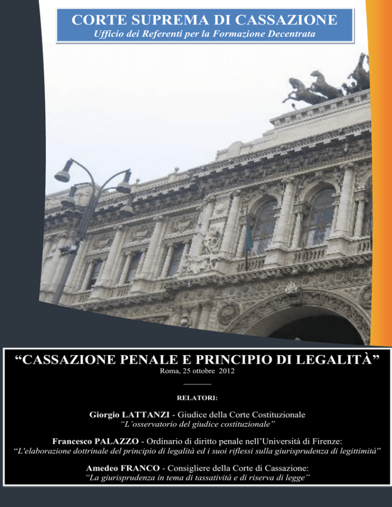 CORTE SUPREMA DI CASSAZIONE Ufficio dei Referenti per la Formazione Decentrata “CASSAZIONE PENALE E PRINCIPIO DI LEGALITÀ” Roma, 25 ottobre 2012 ______ RELATORI: Giorgio LATTANZI - Giudice della Corte Costituzionale “L’osservatorio del giudice costituzionale” Francesco PALAZZO - Ordinario di diritto penale nell’Università di Firenze: “L'elaborazione dottrinale del principio di legalità ed i suoi riflessi sulla giurisprudenza di legittimità” Amedeo FRANCO - Consigliere della Corte di Cassazione: “La giurisprudenza in tema di tassatività e di riserva di legge” CORTE SUPREMA DI CASSAZIONE - UFFICIO DEI REFERENTI PER LA FORMAZIONE DECENTRATA ___________________________________________________________________________________________________________ Report degli interventi 1. Premessa. Il 25 ottobre 2012, nell’Aula Magna della Corte di cassazione si è svolto l’incontro di studi, organizzato dall’Ufficio per la Formazione Decentrata della Corte di cassazione, sul tema “Cassazione penale principio di legalità”. Con il coordinamento del presidente Severo Chieffi, sono intervenuti sul tema il prof. Francesco Palazzo, il giudice costituzionale Giorgio Lattanzi ed il consigliere Amedeo Franco. 2. Introduzione del presidente Severo Chieffi. Il presidente Severo Chieffi, in rappresentanza del Primo Presidente della Corte di cassazione, ha premesso che il principio di legalità interagisce non solo con le fonti del diritto (interne e convenzionali), ma anche con gli obblighi di attuazione dell’ordinamento rispetto alle direttive comunitarie. Le più recenti pronunce (alcune delle quali interagenti con il diritto comunitario e con le norme CEDU) dimostrano come l’autorevolezza e il ruolo nomofilattico della Corte di cassazione passino proprio attraverso la forte riaffermazione del principio di legalità, l’unico, peraltro, costituzionalmente presidiato. 3. Intervento del prof. Francesco Palazzo. Il prof. Palazzo ha osservato che il principio di legalità rappresenta una esigenza di certezza che si coniuga con gli ulteriori principi di tassatività e di determinatezza della norma penale, che sono la garanzia dei diritti dell’imputato in tema di prova e di processo. Attualmente la «qualità» della legge e della legislazione è pregiudicata da una produzione quantitativamente inflazionistica e qualitativamente complessa tale da rendere difficoltosa la possibilità per il cittadino di «regolare» il proprio comportamento sulla conoscenza preventiva di una norma sufficientemente chiara. ________________________________________________________________________________________________ CASSAZIONE PENALE E PRINCIPIO DI LEGALITA’ 2 CORTE SUPREMA DI CASSAZIONE - UFFICIO DEI REFERENTI PER LA FORMAZIONE DECENTRATA ___________________________________________________________________________________________________________ Le convenzioni internazionali con il loro nucleo forte dei diritti individuali, da un lato, e la diffusione del controllo di costituzionalità delle leggi, dall'altro, sono l'espressione più chiara e significativa del processo di potenziamento delle garanzie fondamentali. Il principio di legalità, che trae origine anche da una vocazione tradizionalmente dottrinaria, implica una riflessione teoretica sul processo interpretativo, che è innanzitutto presidiato dalla giurisprudenza, che conforma in senso dinamico le garanzie attraverso la proposizione delle questioni incidentali di costituzionalità, contribuendo così a formare il cosiddetto “diritto vivente” anche nella prospettiva di adeguare le leggi alla realtà sociale e di sanare i difetti delle fonti legislative. Le regole fondamentali del diritto penale riflettono in modo particolarmente evidente la duplice dimensione dei moderni Stati di diritto, il cui funzionamento è fondato sul principio democratico e sui diritti fondamentali: se, invero, la legalità trova la sua radice profonda ed originaria nel principio democratico, la colpevolezza si pone come espressione netta di un'esigenza di garanzia individuale. Anche all'interno di uno stesso principio fondamentale, una volta che esso abbia acquisito rango costituzionale e divenga dunque parametro del controllo di costituzionalità delle leggi, si riproduce quella dialettica tra democrazia e garanzia che più in generale è comunque insita nel sindacato di conformità delle leggi a Costituzione: tuttavia l'intensità di questa tensione è variabile e il suo grado dipende dalle caratteristiche interne del principio che funge da parametro di costituzionalità. Poiché, in effetti, la costruzione legislativa della fattispecie è sempre il risultato di una considerazione e ponderazione anche di tutto un fascio di ulteriori interessi concorrenti o addirittura confliggenti con quello principale tutelato, è chiaro che la valutazione del contenuto di disvalore del reato tende necessariamente a dilatarsi dal bene giuridico verso gli scopi e gli obiettivi della scelta politica, la loro intrinseca legittimità e quella del mezzo prescelto. Per evitare tensioni con il legislatore, se da un lato la Corte costituzionale tende a sospingere l’interprete verso una lettura delle norme conforme o adeguatrice alla Costituzione, dall’altro spetta comunque al giudice un ruolo sempre più attivo nel suo rapporto con la legge, attraverso l’adozione di moduli ermeneutici in forma corrispondente allo spirito della legge. ________________________________________________________________________________________________ CASSAZIONE PENALE E PRINCIPIO DI LEGALITA’ 3 CORTE SUPREMA DI CASSAZIONE - UFFICIO DEI REFERENTI PER LA FORMAZIONE DECENTRATA ___________________________________________________________________________________________________________ Tra testo legislativo e strumenti linguistici, il continuo e proficuo dialogo tra la Corte Costituzionale, la Corte di Cassazione ed i giudici di merito plasma e traccia il principio di legalità, lungo i sentieri se