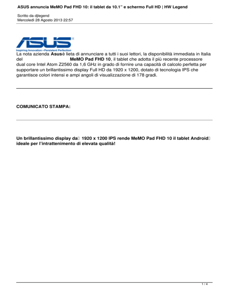 ASUS annuncia MeMO Pad FHD 10: il tablet da 10.1” e schermo Full HD | HW Legend Scritto da djlegend Mercoledì 28 Agosto 2013 22:57 La nota azienda Asusè lieta di annunciare a tutti i suoi lettori, la disponibilità immediata in Italia del MeMO Pad FHD 10, il tablet che adotta il più recente processore dual core Intel Atom Z2560 da 1,6 GHz in grado di fornire una capacità di calcolo perfetta per supportare un brillantissimo display Full HD da 1920 x 1200, dotato di tecnologia IPS che garantisce colori intensi e ampi angoli di visualizzazione di 178 gradi. COMUNICATO STAMPA: Un brillantissimo display da 1920 x 1200 IPS rende MeMO Pad FHD 10 il tablet Android ideale per l’intrattenimento di elevata qualità! 1/4 ASUS annuncia MeMO Pad FHD 10: il tablet da 10.1” e schermo Full HD | HW Legend Scritto da djlegend Mercoledì 28 Agosto 2013 22:57 Cernusco Pad GHz Full visualizzazione pollici video MeMO grafiche videochiamate riprendere mm riproduzione HD eFHD in1080p pesa rendono Pad grado da e10, consumi. meravigliosi sul 1920 580 FHD e dei ildigaming. Naviglio, MeMO e tablet di grammi; fornire video xuna 10 178 1200, Ildispone che fotocamera sottile Pad gradi. 720p. una video 28 la dotato adotta FHD batteria capacità agosto design Gli della La Full di cover altoparlanti 10 ilposteriore HD più tecnologia ai ideale prevede 2013 di1080p. MeMO polimeri recente ‘micro-weave’ calcolo -per ASUS stereo da una IPS Intel processore le di perfetta 5 applicazioni litio fotocamera megapixel che annuncia Hyper-Threading con Pad è offre garantisce disponibile tecnologia per FHD dual un'autonomia supportare la eda diautofocus disponibilità 10 core intrattenimento, 1,2 colori vanta nei SonicMaster per Intel megapixel colori un intensi ottimizzare uno massima per Atom brillantissimo inblu, spessore scattare Italia eZ2560 frontale eriproduzione bianco ampi ildi del display prestazioni 10 foto angoli da di MeMO per edisplay ore soli 1,6 rosa. eda indi 9,5 10 2/4 ASUS annuncia MeMO Pad FHD 10: il tablet da 10.1” e schermo Full HD | HW Legend Scritto da djlegend Mercoledì 28 Agosto 2013 22:57 navigazione apparecchio schede usare MeMO ripiegata digitare ASUS numerose e ottimizzare video perutilities di prendere dei gratuitamente MeMO Pad microSD con ottenendo contenuti. apps le per FHD la GPS TV immagini Pad tastiera. appunti; la ASUS oper 10 gestione eproiettore FHD GLONASS. un offre viene vi eaumentare senza èesclusive. supporto La esaltandone 10 mentre una opzioni fornito TransCover è dicon TransCover dotato limiti album. ASUS ASUS lo che tecnologia di con SuperNote di spazio connettività del colori, tempo posiziona La spazio Studio è Miracast sistema tecnologia disponibile protettiva diluminosità 5 Wi-Fi archiviazione. di Lite, GB consente ilarchiviazione complete, connette operativo tablet di per ad video con ASUS nei esempio, condividere enel di interno colori contrasto ASUS ilfruire come modo WebStorage. Android È tablet dinero, compresa èin 16GB di Splendid lo ideale migliore in microfibra, filmati, per diversi standard 4.2 rosa modalità una eJelly per anche dispone Tra efoto tool per consente migliore verde. laBean 802.11a/b/g/n gli che wireless guardare eper lettura, lapresentazioni. accessori di possibilità può l’editing efruizione uno infine dila essere aislot un scrittura video di del dieper di afoto o 3/4 ASUS annuncia MeMO Pad FHD 10: il tablet da 10.1” e schermo Full HD | HW Legend Scritto da djlegend Mercoledì 28 Agosto 2013 22:57 ASUS Wifi ,99€, Fonte: HW nei Legend + colori iva LTE MeMO Asus. inclusa Bianco Staff PadeFHD Blu. 10 da 16GB sarà disponibile dal 29 agosto nelle rispettivamente versioni solo a 299€ Wifiee3 4/4